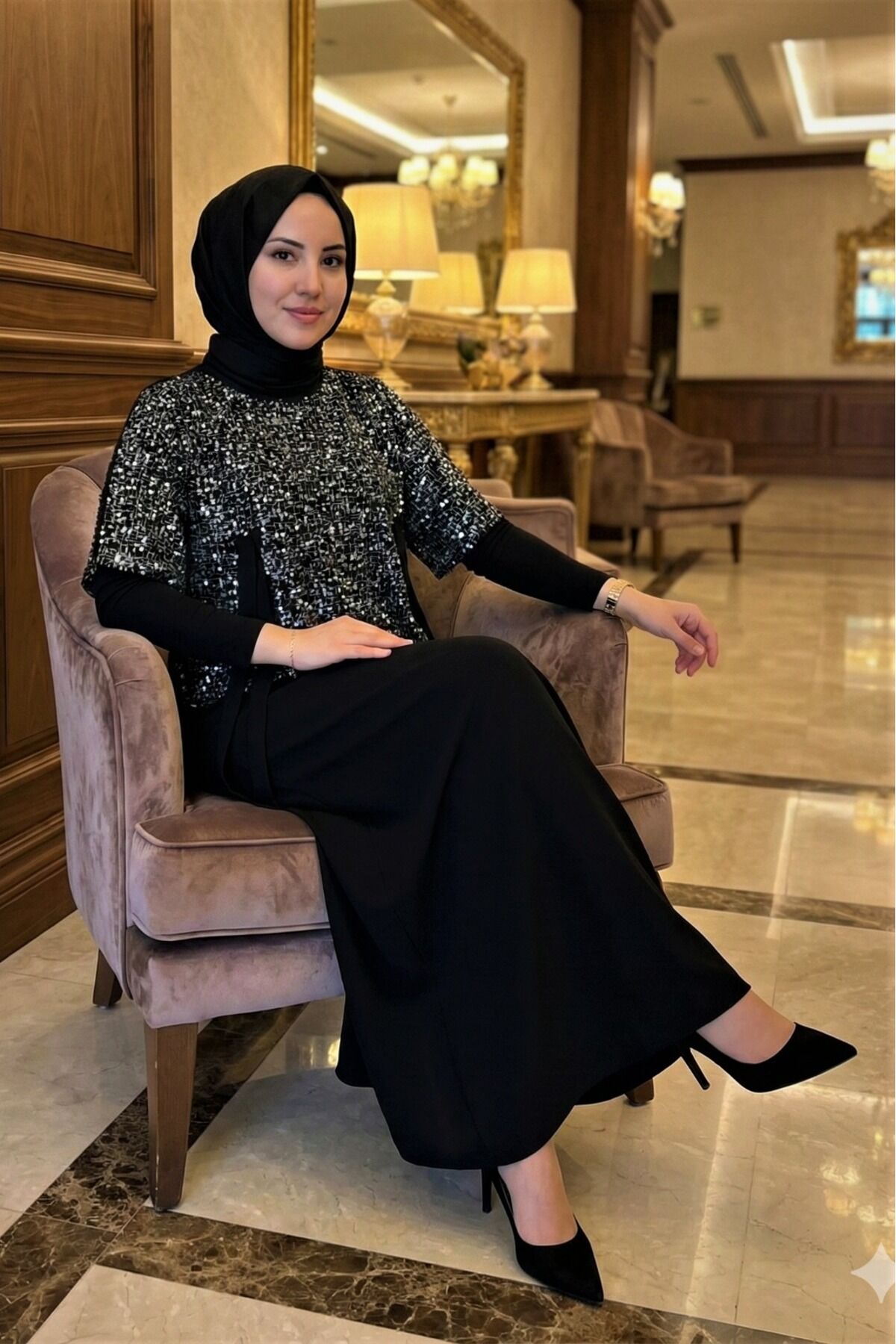 Kadın Sandy Vizon Renk Özel Tasarım Düğün Nişan Tarz Davet İkili Pul File Bolorolu Tesettür Elbise Si̇yah - 42
