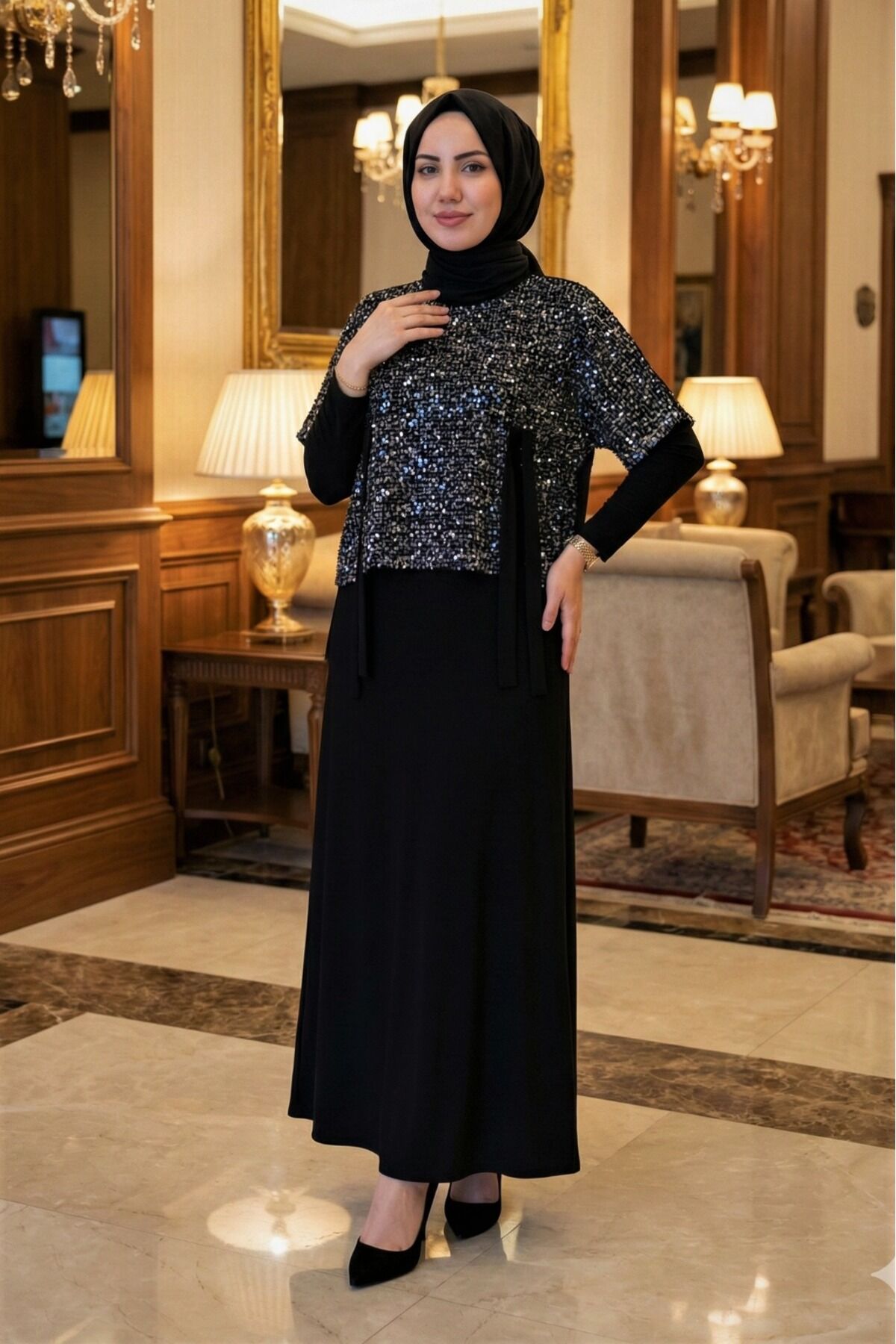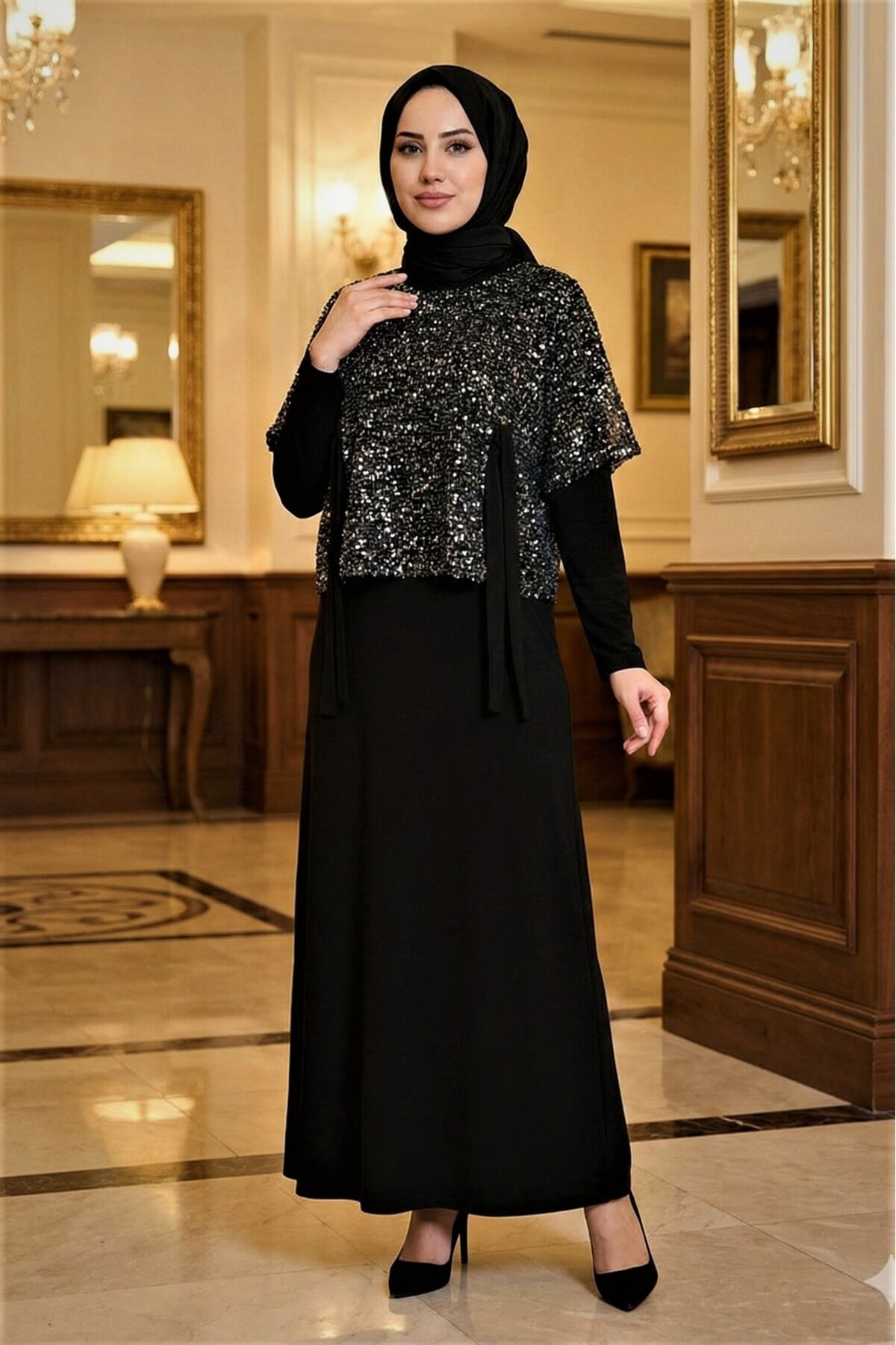 Kadın Sandy Vizon Renk Özel Tasarım Düğün Nişan Tarz Davet İkili Pul File Bolorolu Tesettür Elbise Si̇yah - 48