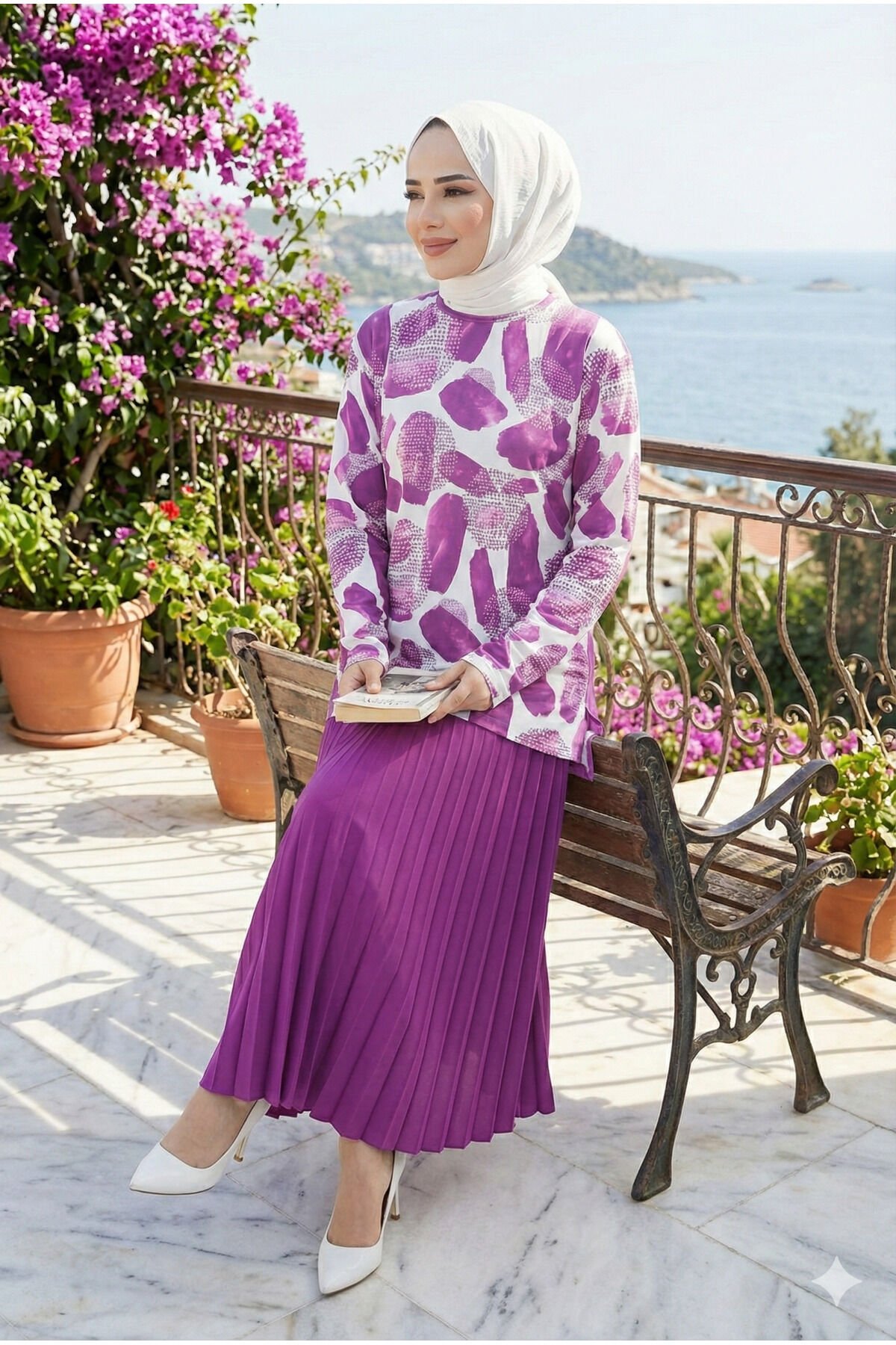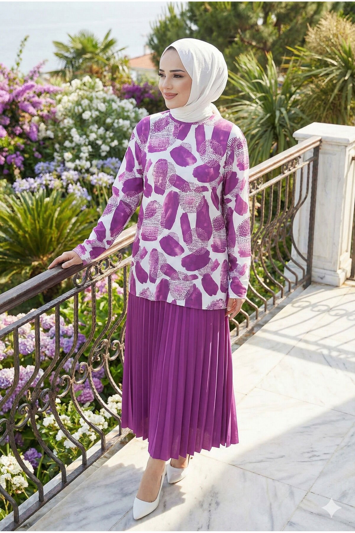 kadın sandy yağ yeşil yazlık rahat kalıp 2li eteği piliseli ikil tesettür etekli takım Fuhşya Pembe - 42