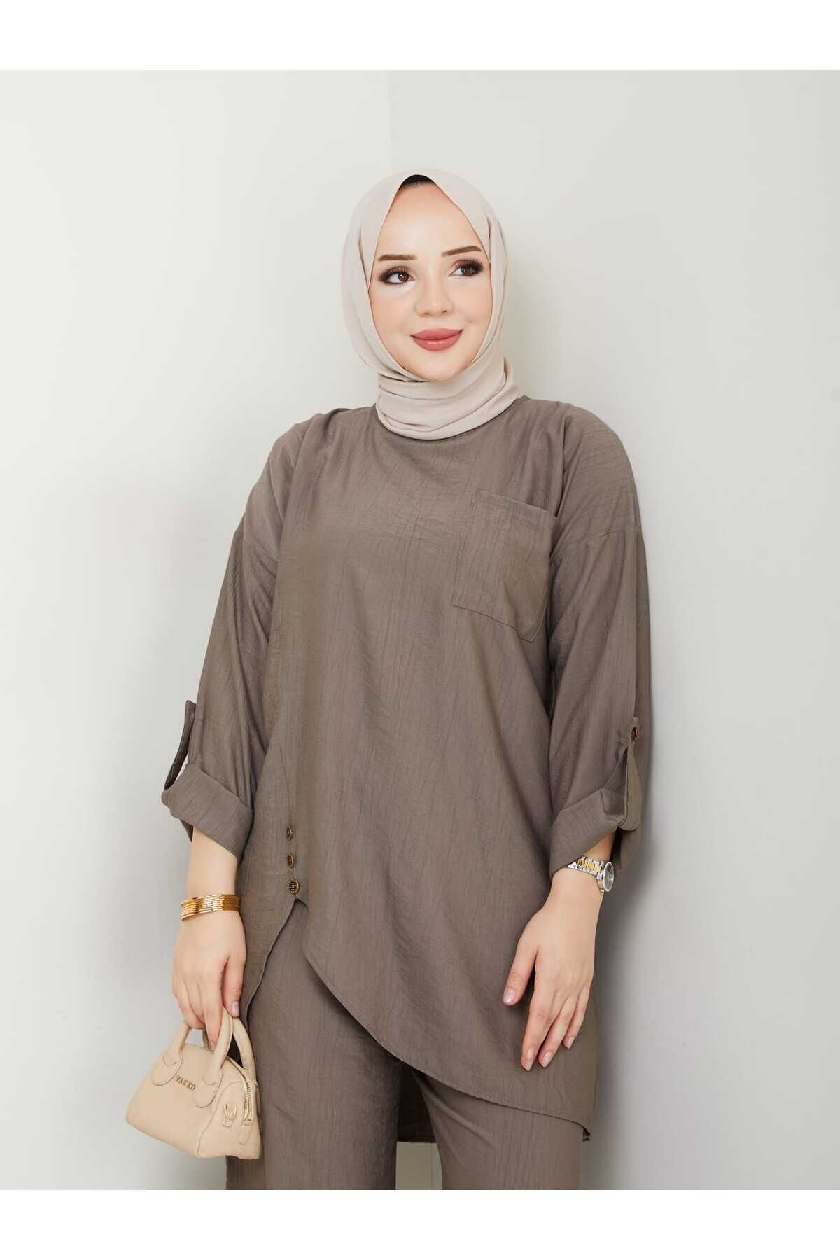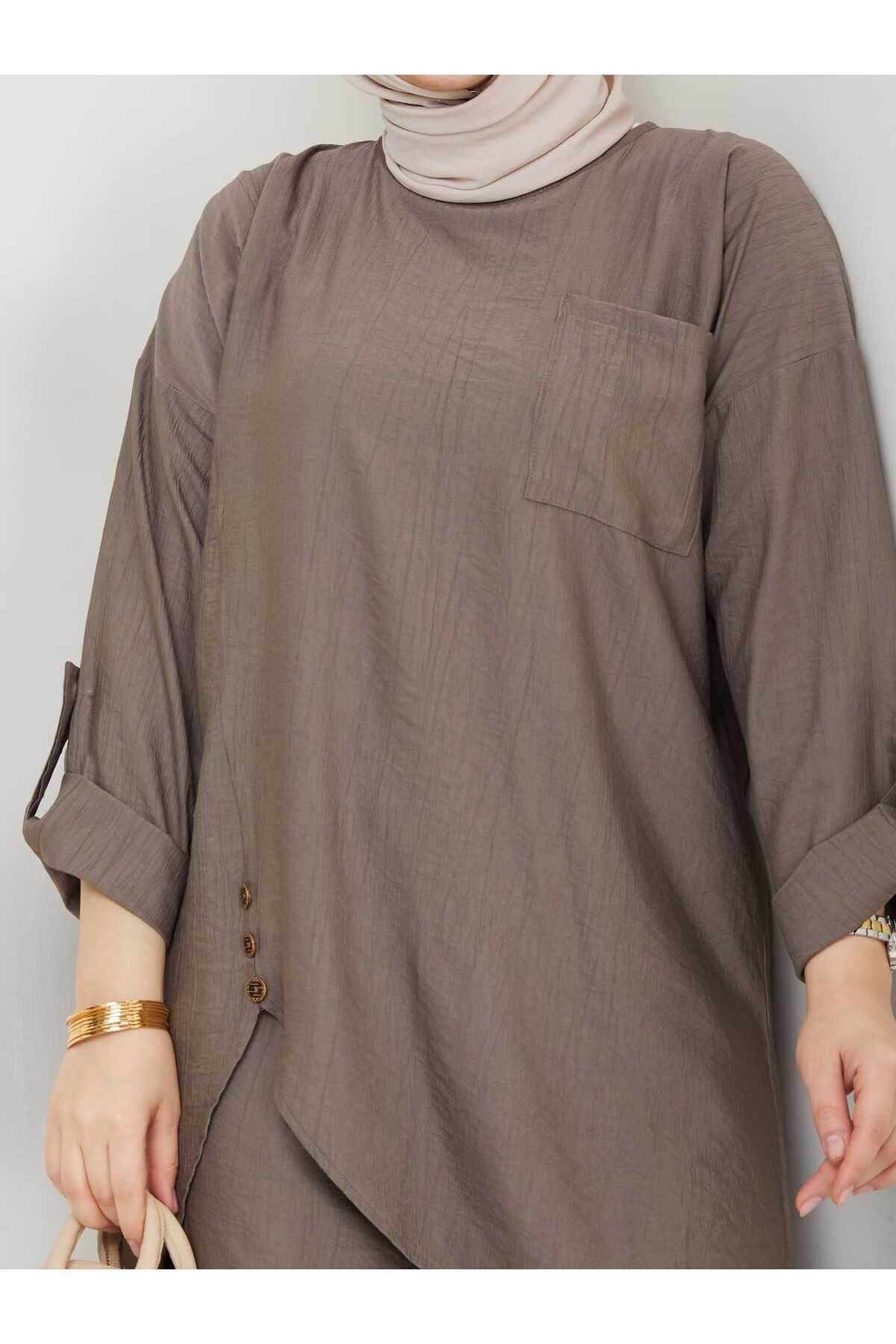 Kadın Siyah Çilek Kumaş Asimetrik 2li Tesettür Tunik Pantolon Ikili Pantolonlu Takım Duman Gri - 48