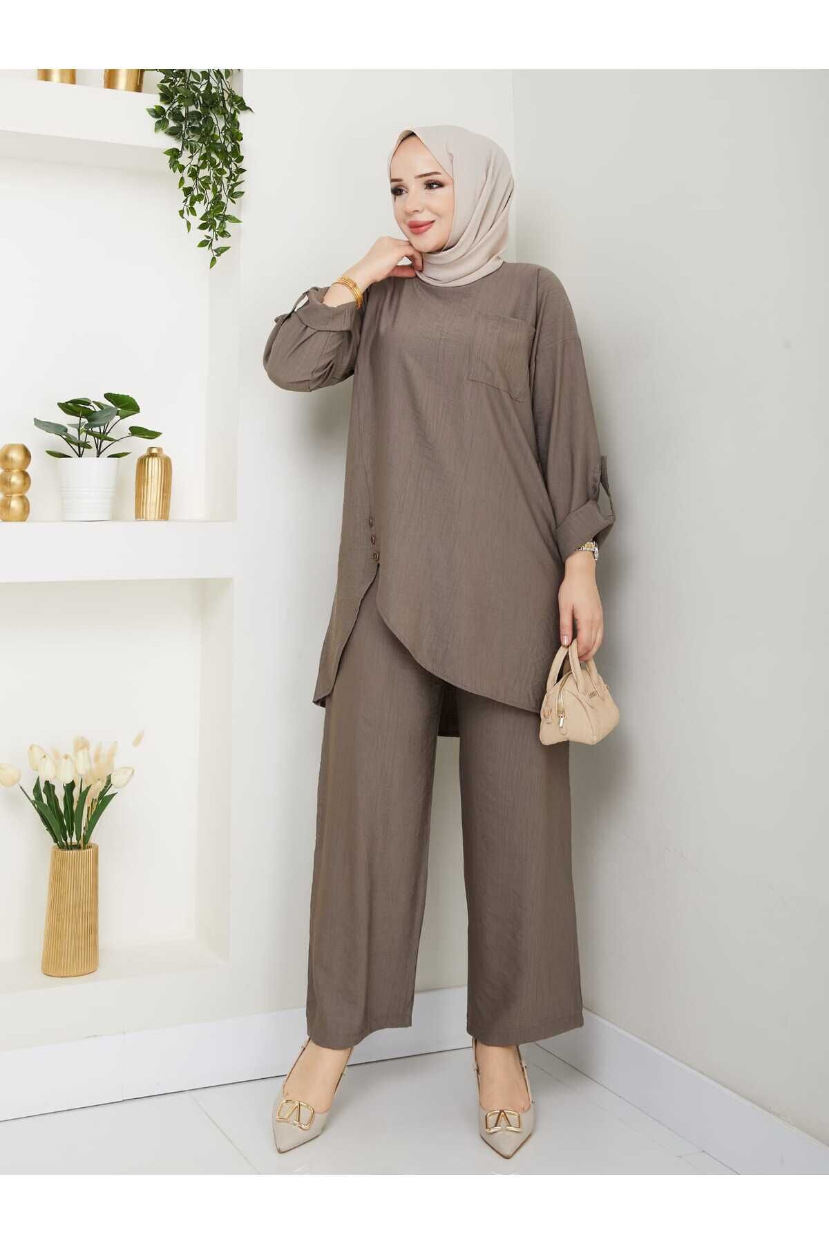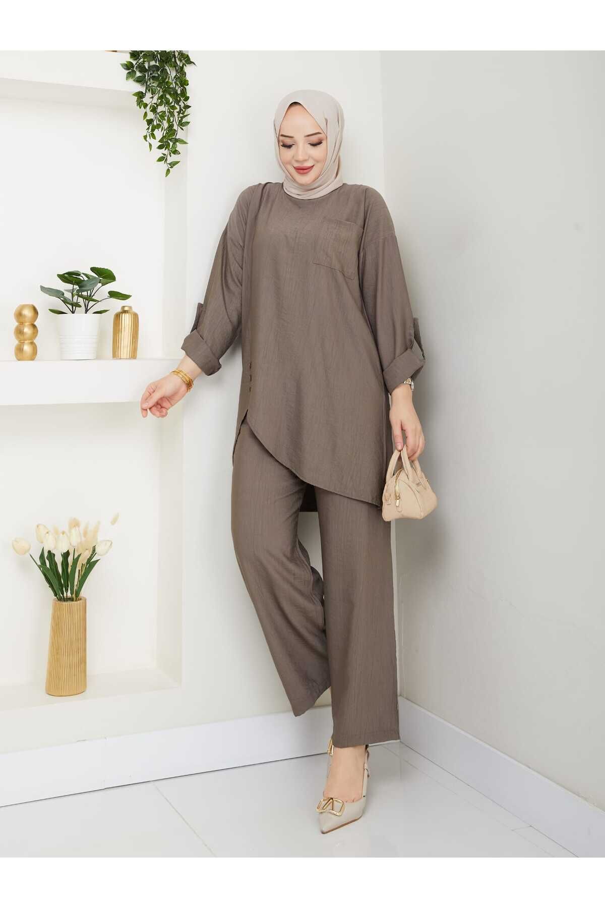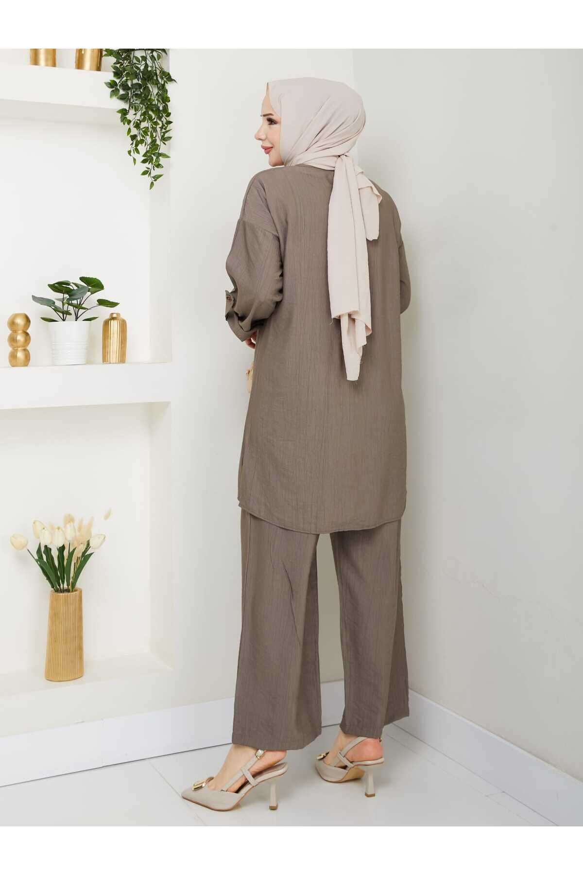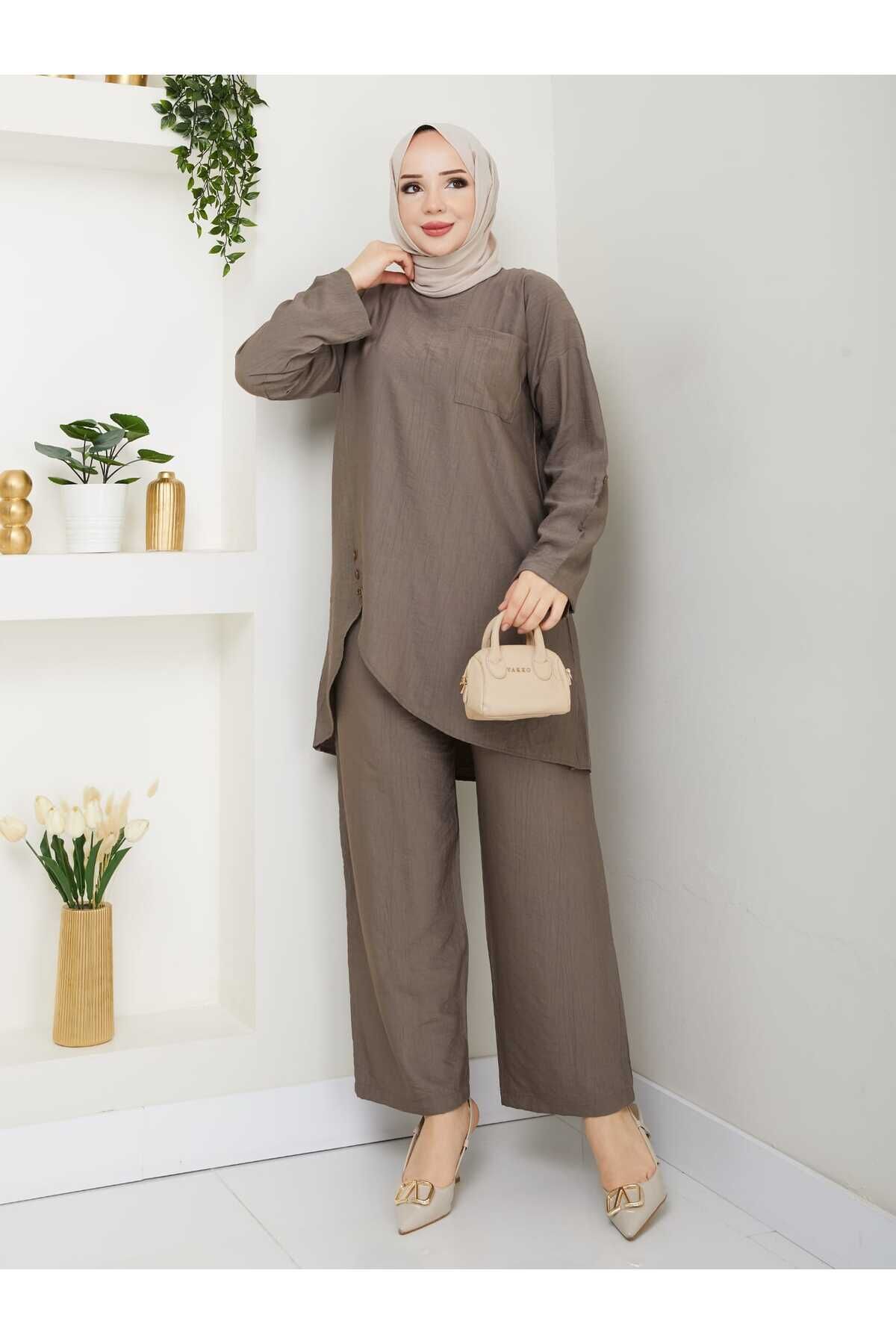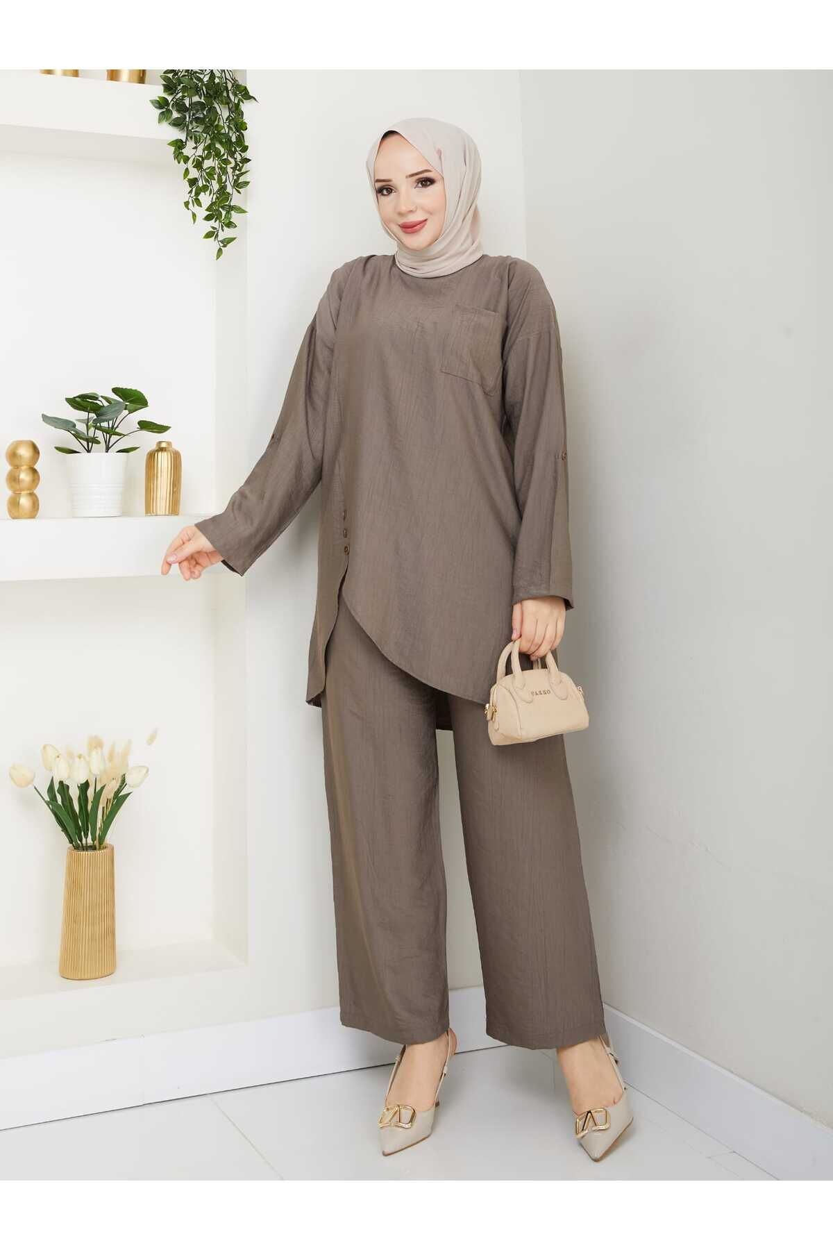 - Asimetrik kesim detayları ile modern ve şık bir görünüm sunar.; - Keten görünümlü kumaşı sayesinde hafif ve nefes alabilen bir yapıya sahiptir, yaz ayları için idealdir.; - İki parçadan oluşan set; tunik ve pantolon olmak üzere rahatlıkla kombinlenebilir.; - Sade ve düz deseniyle her türlü üst giyimle uyum sağlar, zamansız bir stil oluşturur.; - Brit detayları ile zarif bir dokunuş eklerken, tüylenme yapmayan materyali konforlu kullanım vaat eder.; - Cepsiz tasarımı pratiklik kazandırırken, bol paça kesimi hareket özgürlüğü sağlar.; - 30 derecede yıkama imkanı sunarak kolay bakım avantajı sunar.; - Kemersiz yapısıyla basit ama etkili bir tarz yaratmanızı sağlar.; - Günlük kullanım için ideal olan bu takım, hem evde hem de dışarıda rahatlıkla tercih edilebilir.; - Regular kalıp ile vücut hatlarınıza uygun bir oturuşa sahip olup, uzun boyu sayesinde şıklığınızdan ödün vermeden konforunuzu arttırır.- Asimetrik kesim detayları ile modern ve şık bir görünüm sunar.; - Keten görünümlü kumaşı sayesinde hafif ve nefes alabilen bir yapıya sahiptir, yaz ayları için idealdir.; - İki parçadan oluşan set; tunik ve pantolon olmak üzere rahatlıkla kombinlenebilir.; - Sade ve düz deseniyle her türlü üst giyimle uyum sağlar, zamansız bir stil oluşturur.; - Brit detayları ile zarif bir dokunuş eklerken, tüylenme yapmayan materyali konforlu kullanım vaat eder.; - Cepsiz tasarımı pratiklik kazandırırken, bol paça kesimi hareket özgürlüğü sağlar.; - 30 derecede yıkama imkanı sunarak kolay bakım avantajı sunar.; - Kemersiz yapısıyla basit ama etkili bir tarz yaratmanızı sağlar.; - Günlük kullanım için ideal olan bu takım, hem evde hem de dışarıda rahatlıkla tercih edilebilir.; - Regular kalıp ile vücut hatlarınıza uygun bir oturuşa sahip olup, uzun boyu sayesinde şıklığınızdan ödün vermeden konforunuzu arttırır.