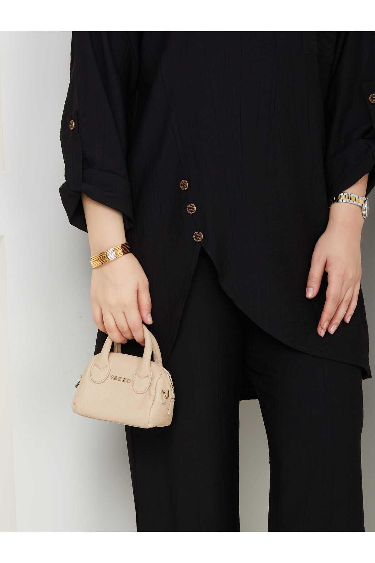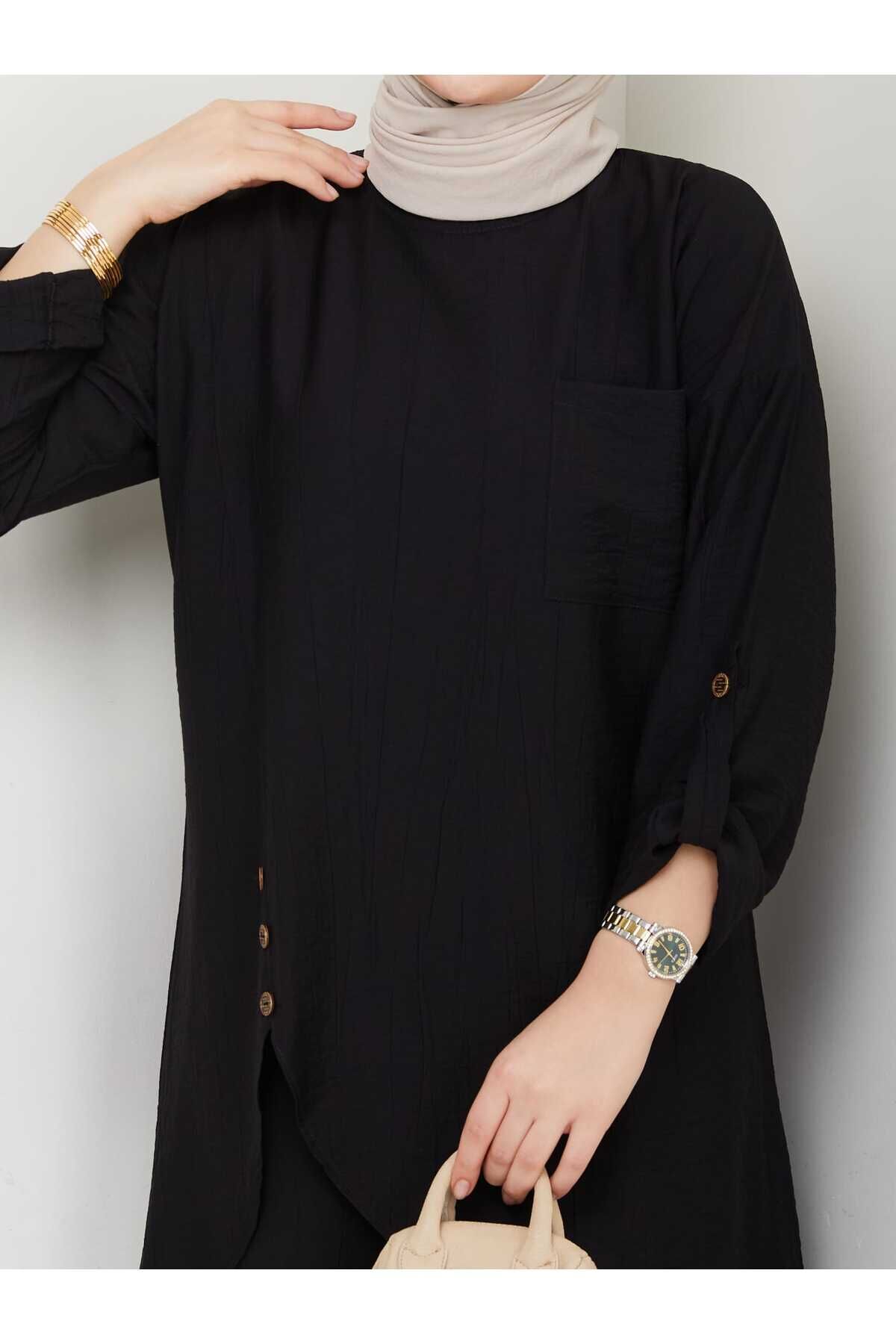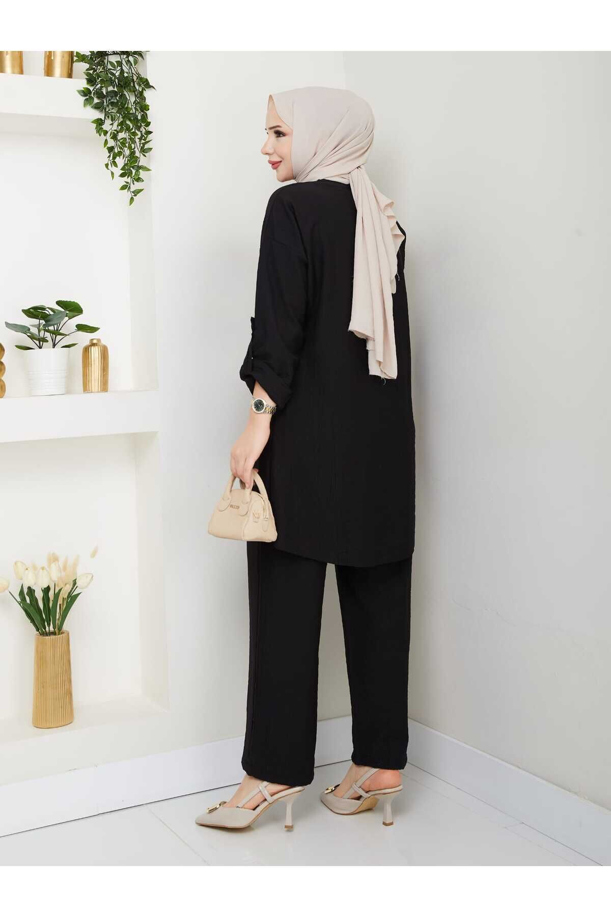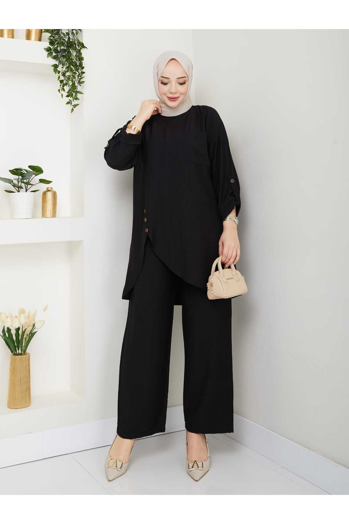 Kadın Siyah Çilek Kumaş Asimetrik 2li Tesettür Tunik Pantolon Ikili Pantolonlu Takım Kahverengi - 42