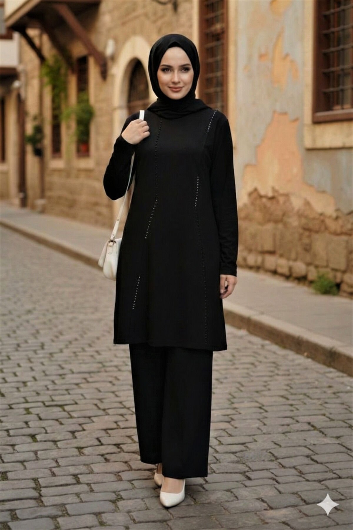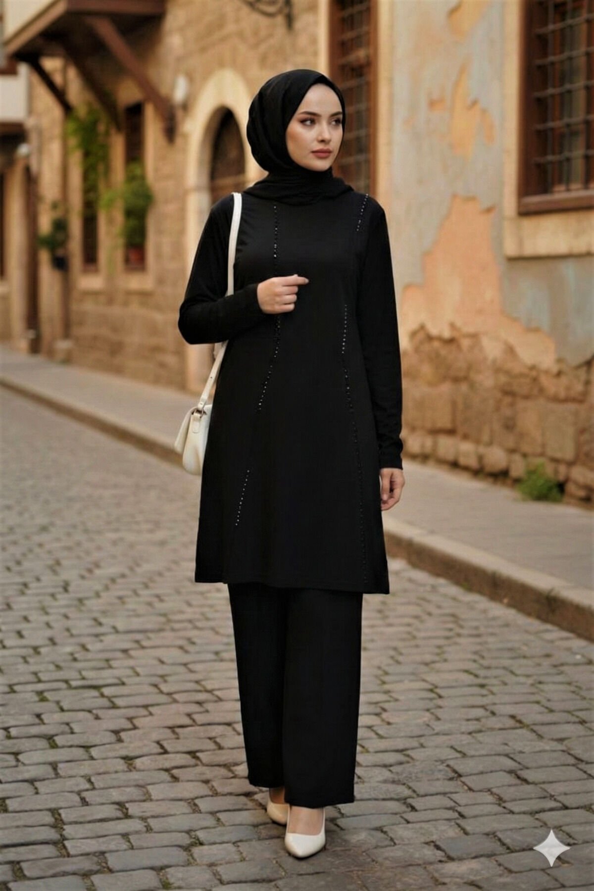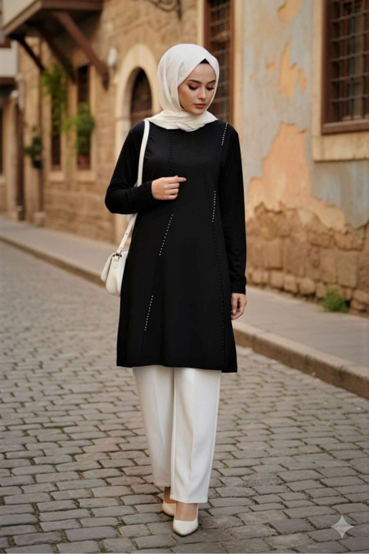 Kadın Siyah Kristal Pamuk Anne tarz Büyük Beden Önü Nervür ve İnci detaylı Tesettür Tunik Si̇yah - 48