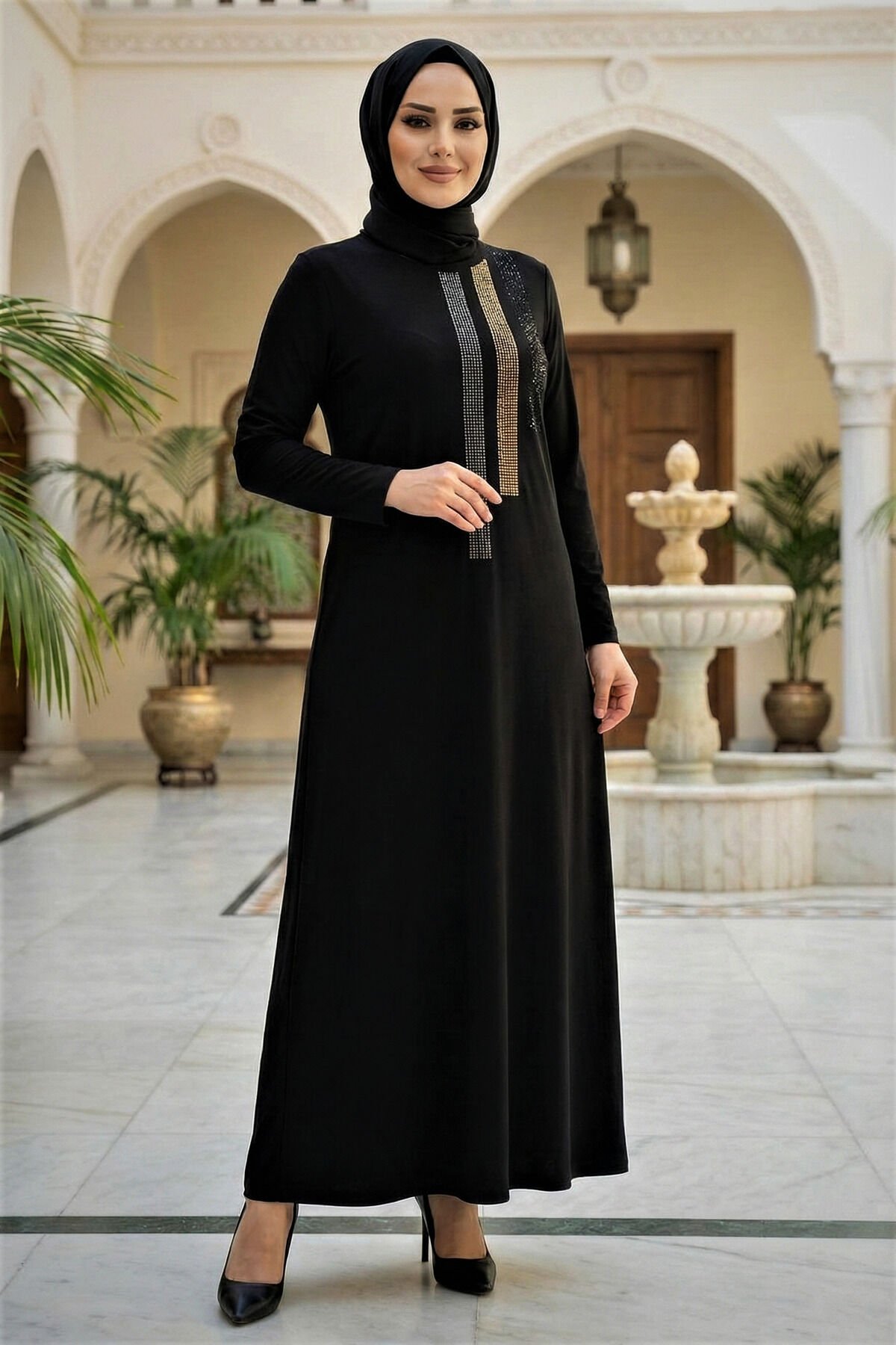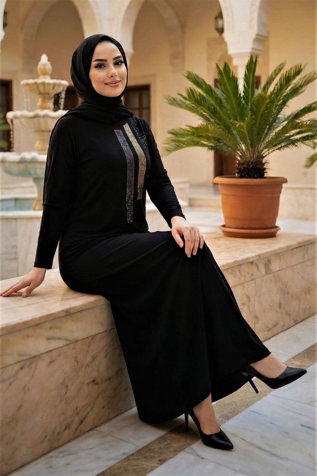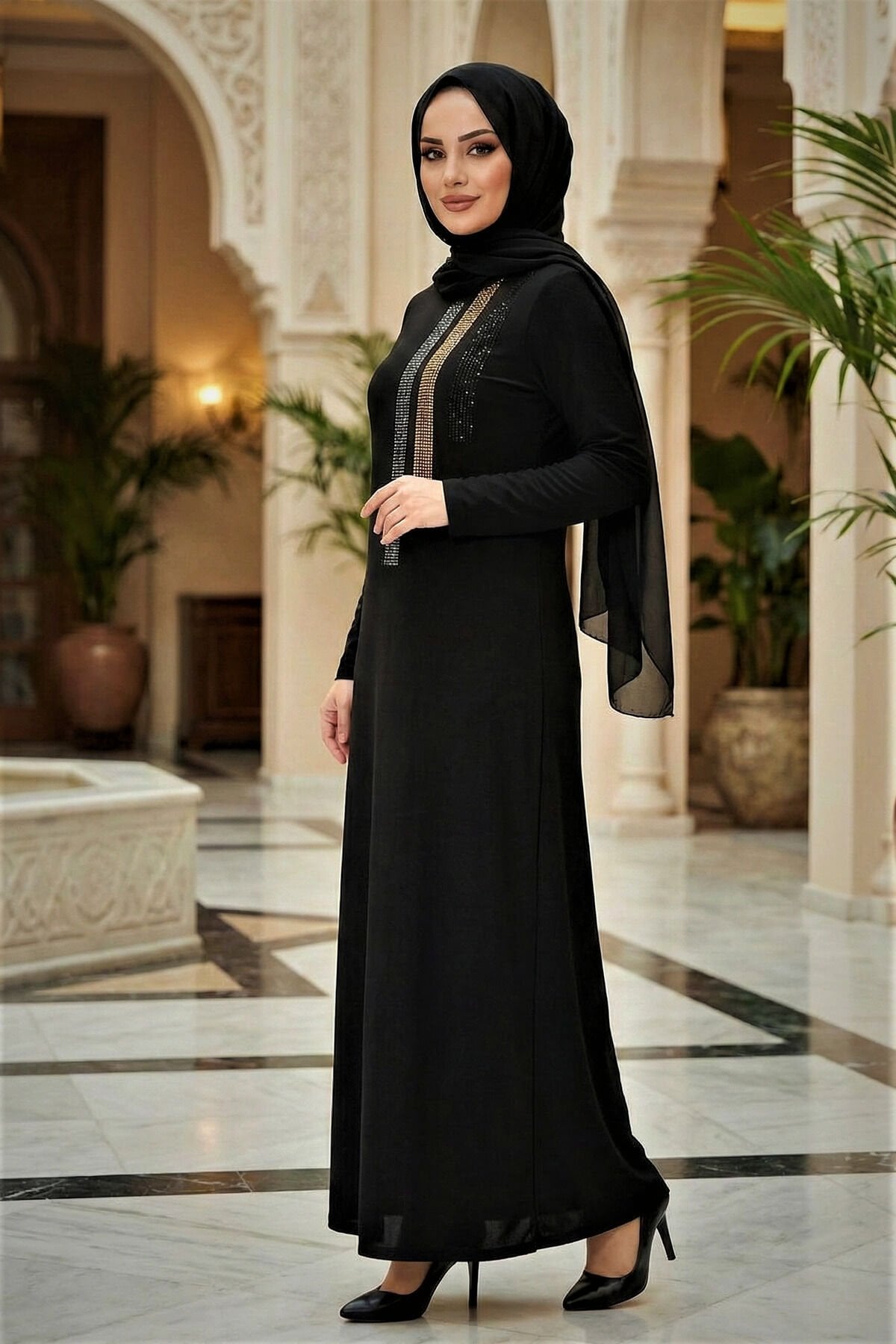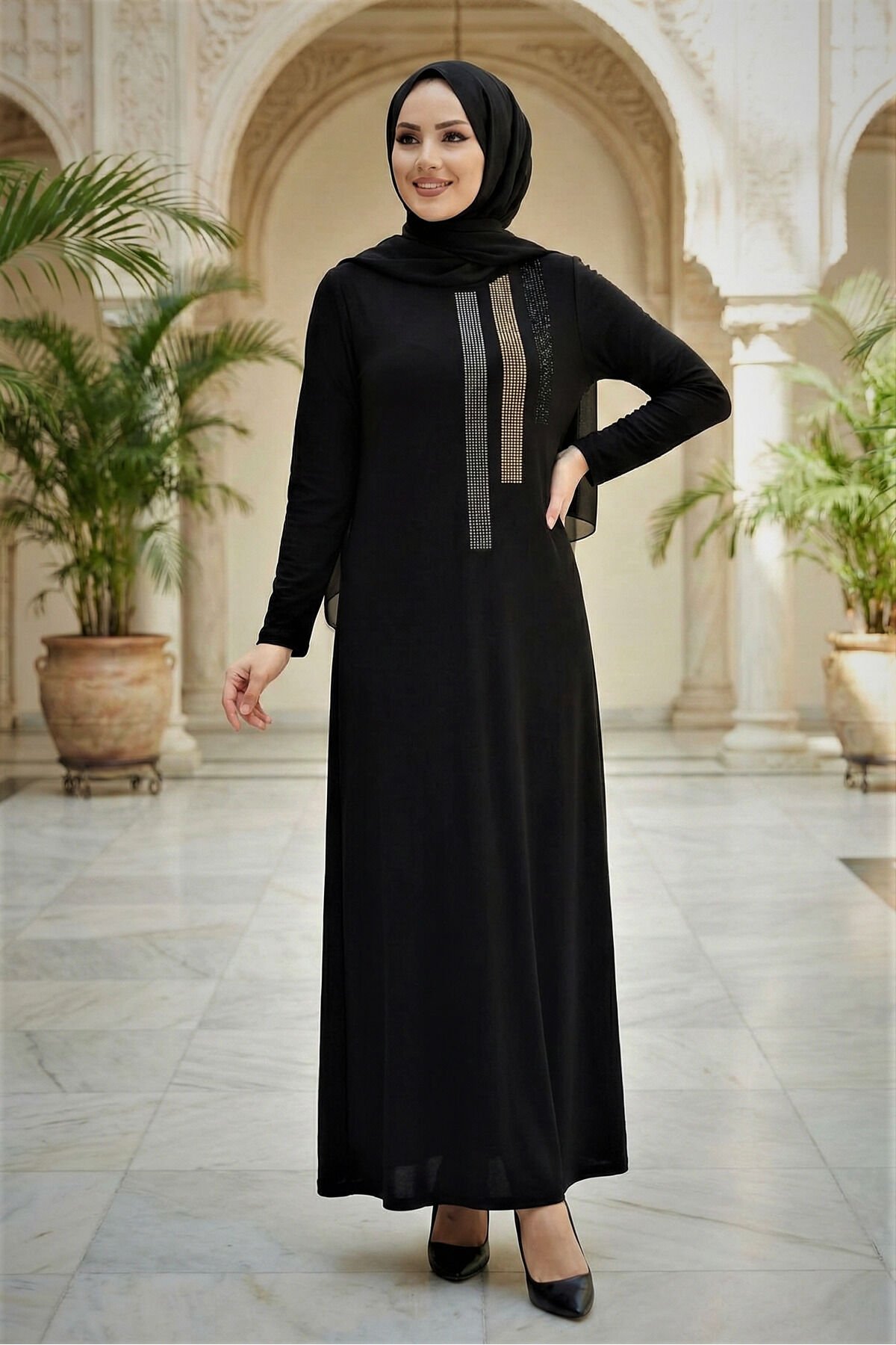 Kadın Siyah Sandy Abiye Büyük Beden Boydan Tarz Davet Özel Önü Taş Detaylı Tesettür Elbise Si̇yah - 58