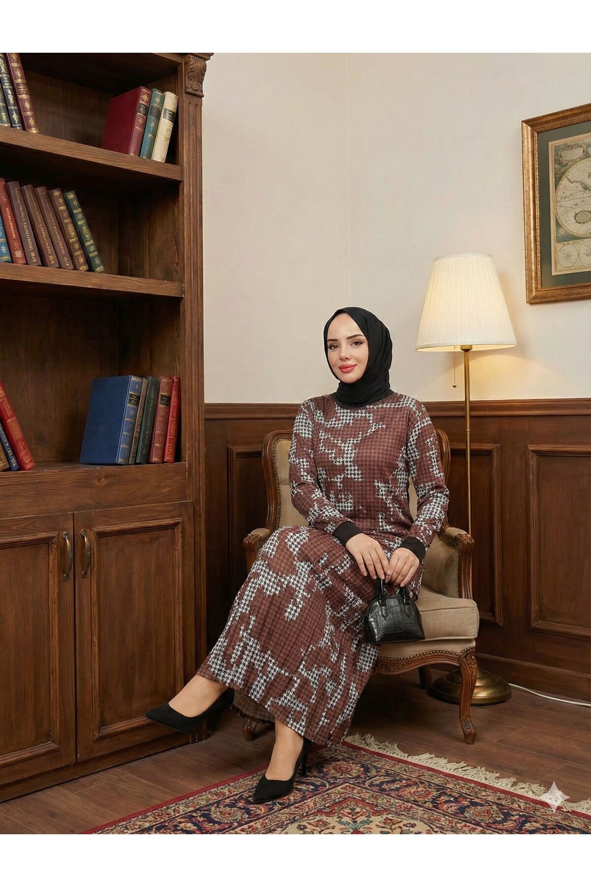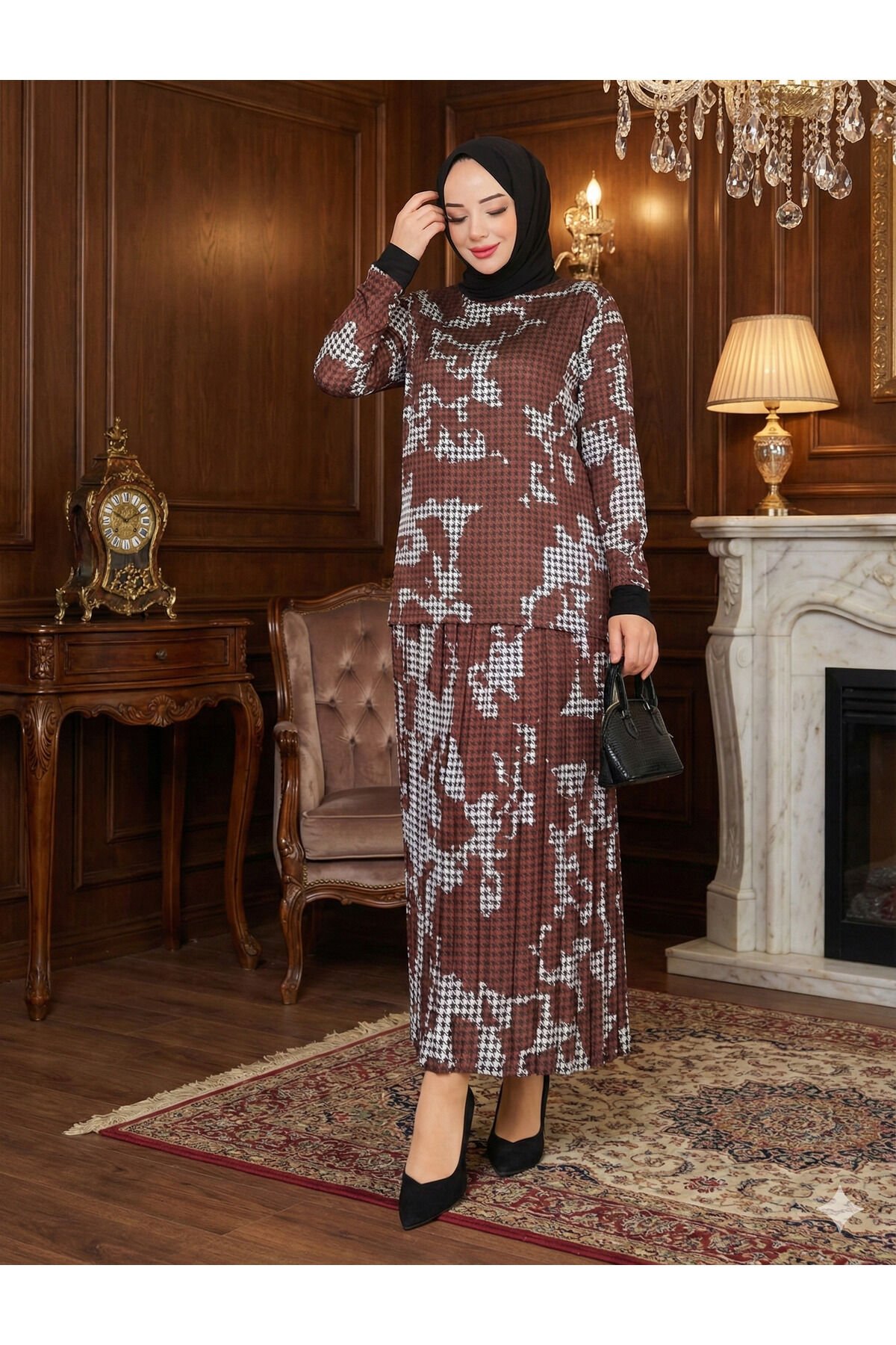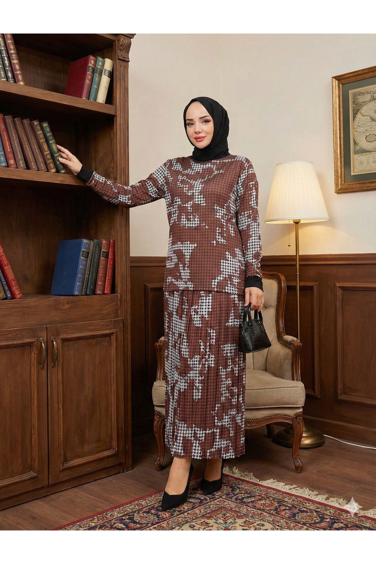 Kadın Füme Önü Desenli Saten 2li Bluz Etek Piliseli Ikili Tesettür Etekli Takım Kahve - 42-44