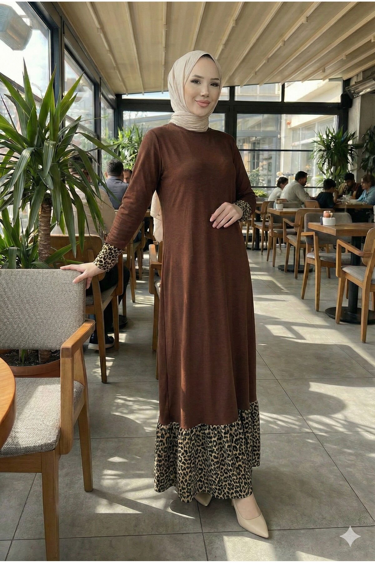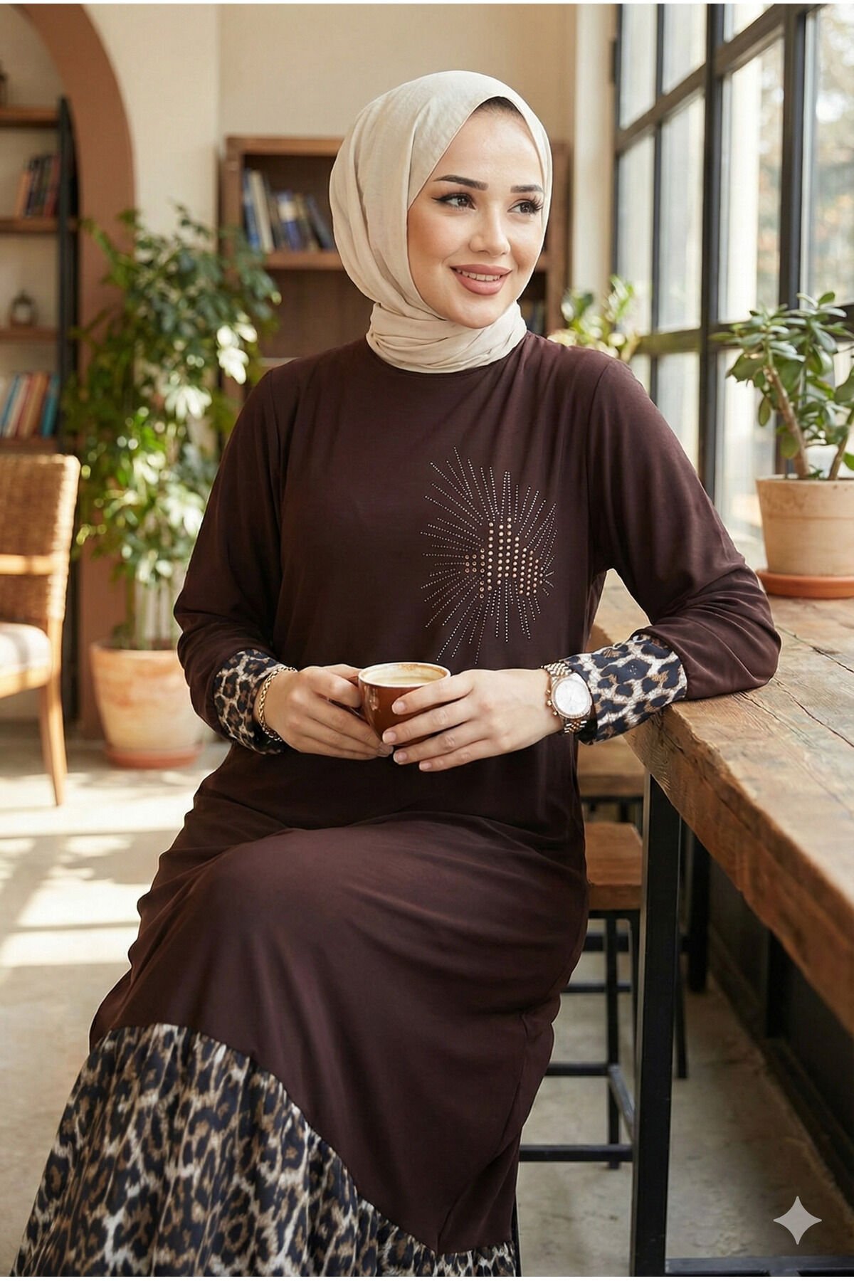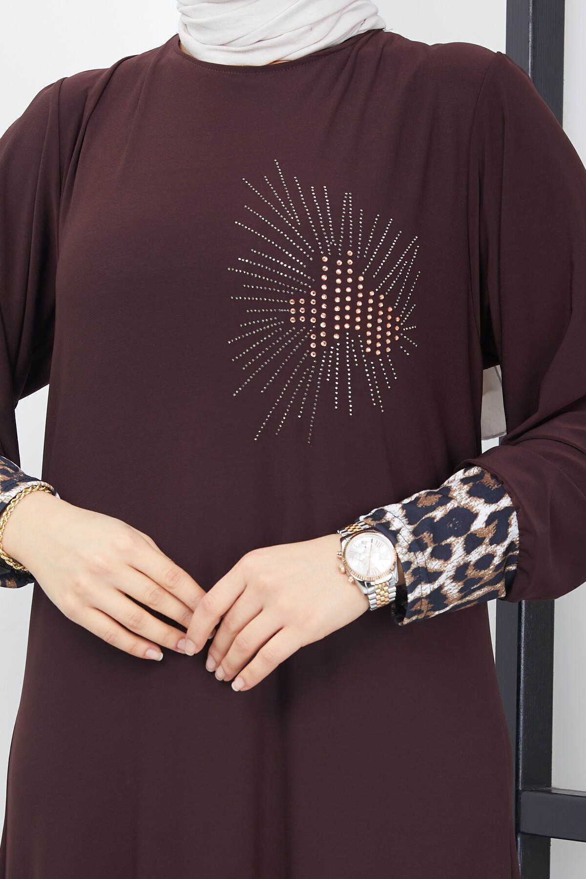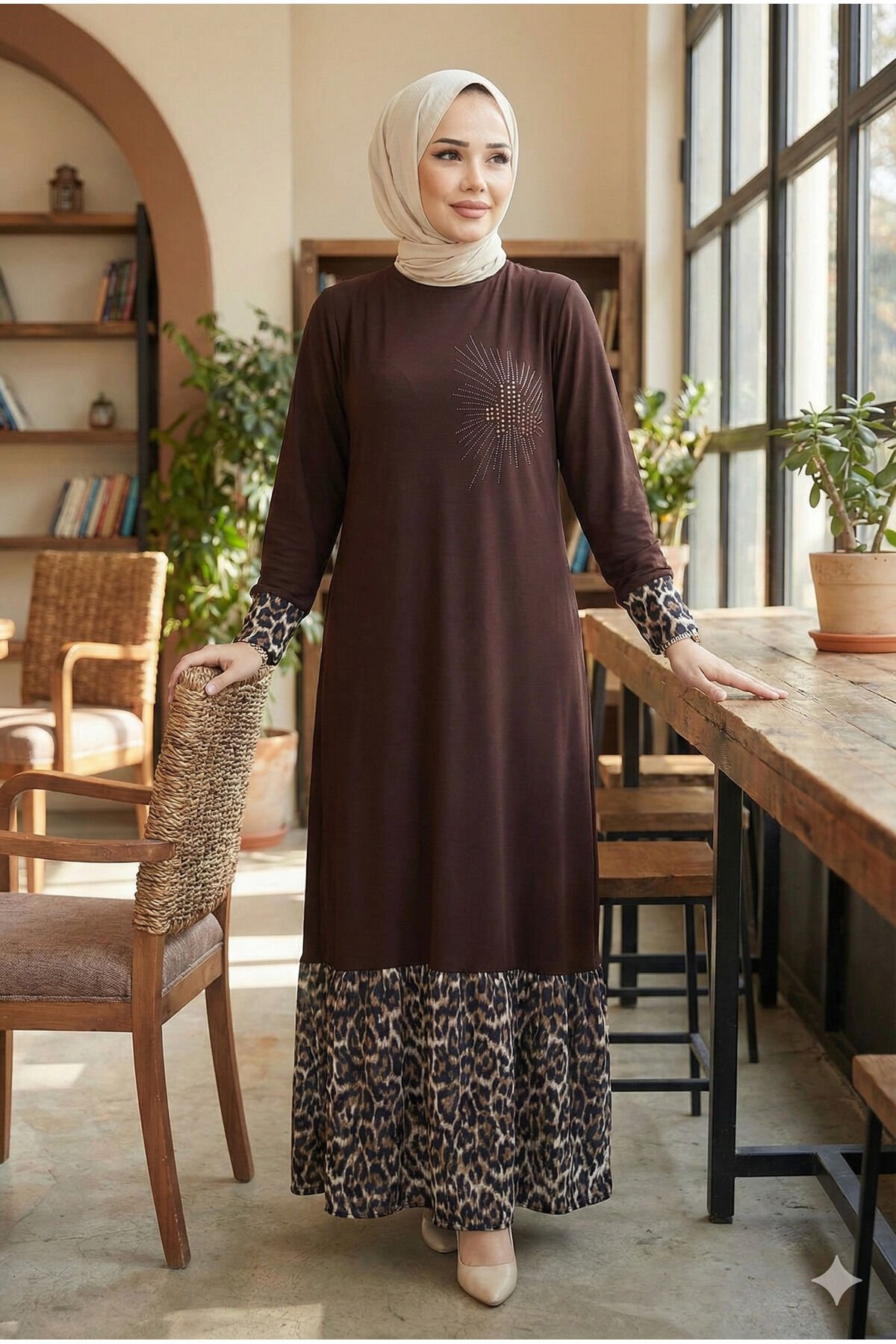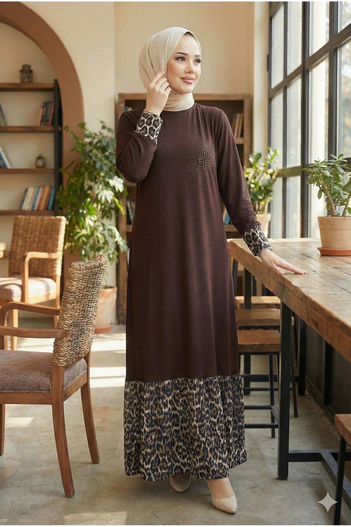 Kadın Kahve Sandy Göğsü Taşlı Kolu Ve Eteği Leopar Garnili Tesettür Uzun Elbise Kahve - 42-44