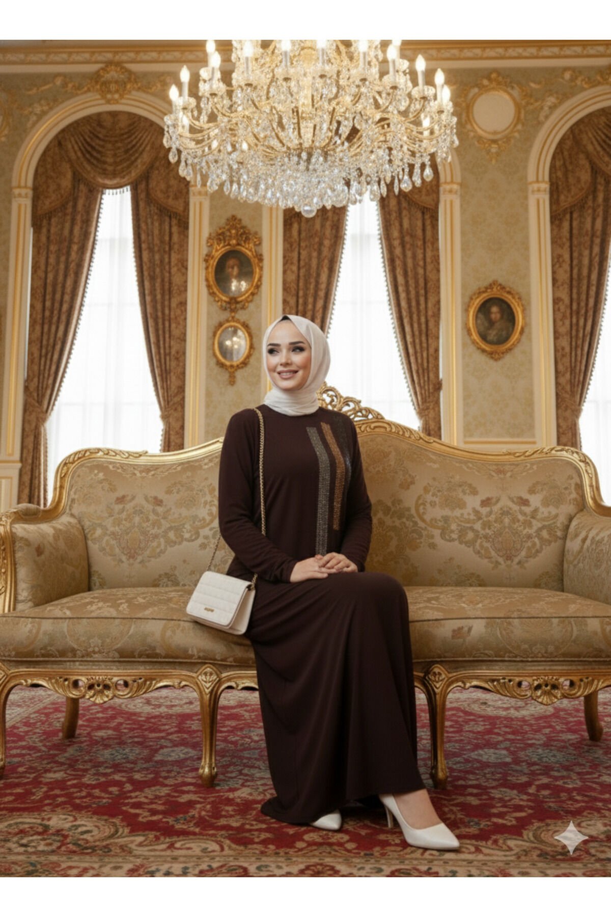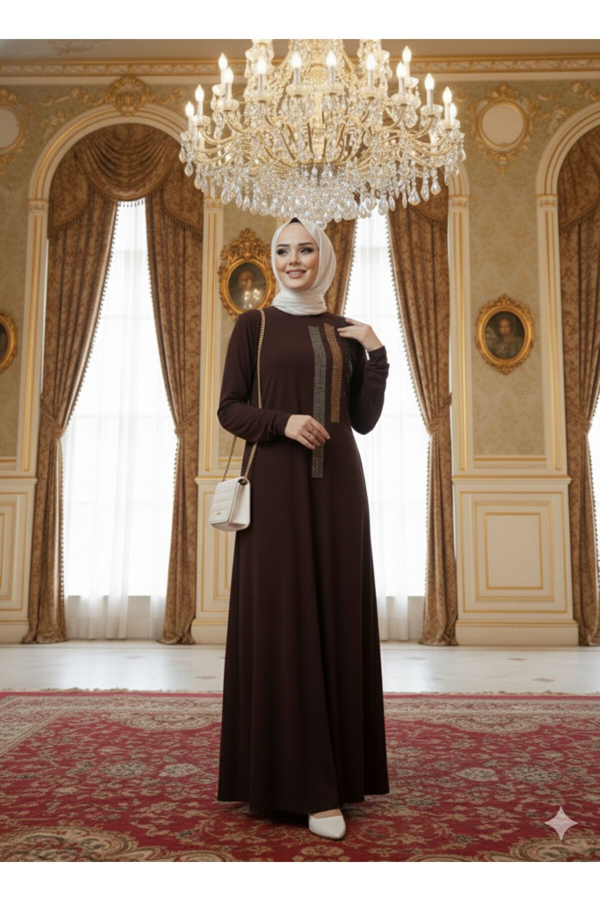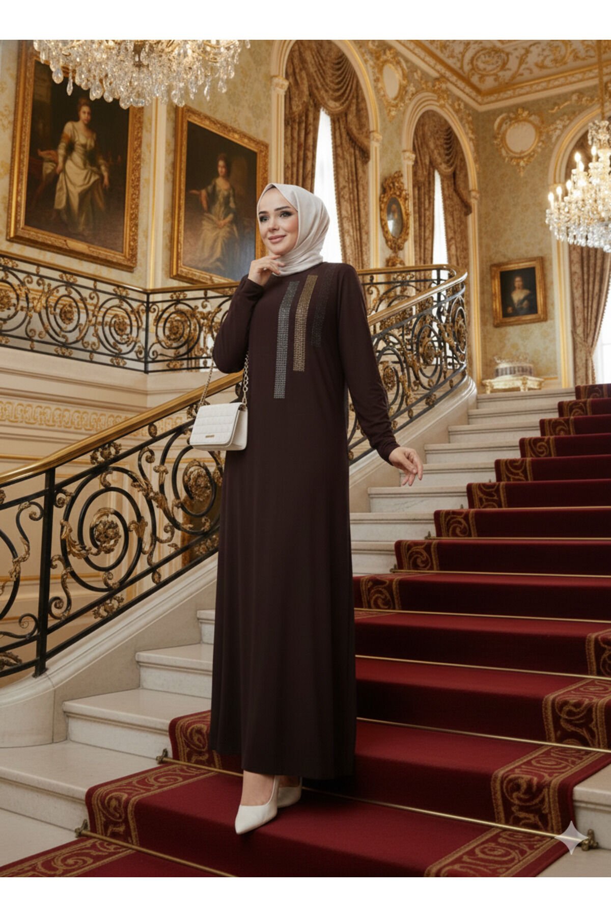 Kadın Siyah Sandy Abiye Büyük Beden Boydan Tarz Davet Özel Önü Taş Detaylı Tesettür Elbise Kahve - 46