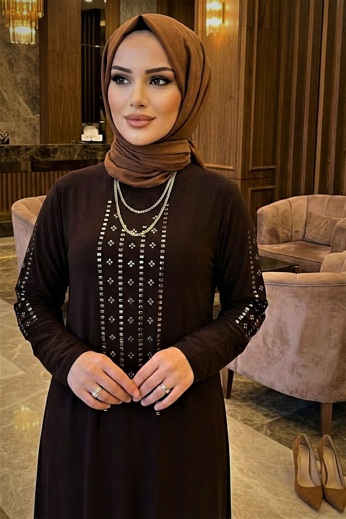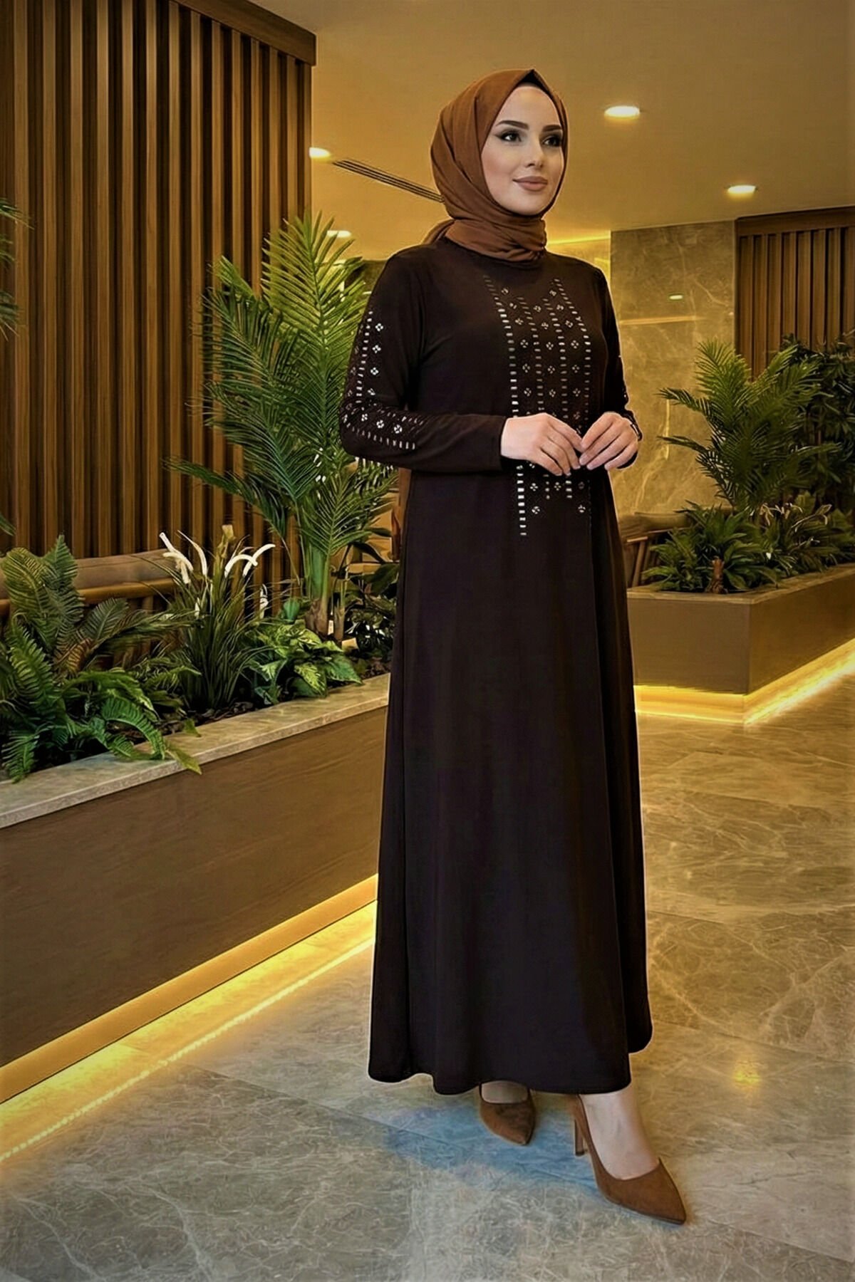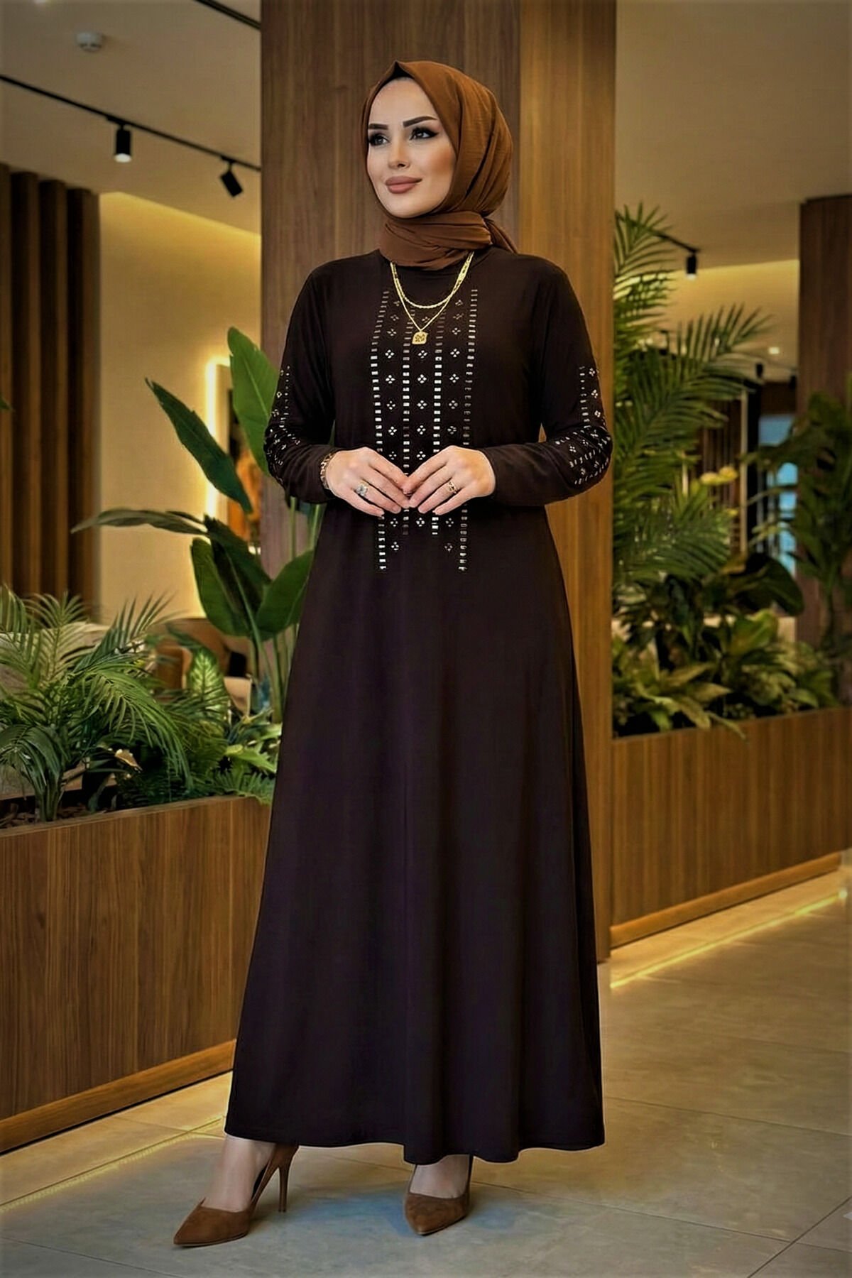 Kadın Sandy Lacivert Önü Ve Kolları Dms Taş Detaylı Büyük Beden Boydan Abiye Tesettür Elbise Kahve - 50