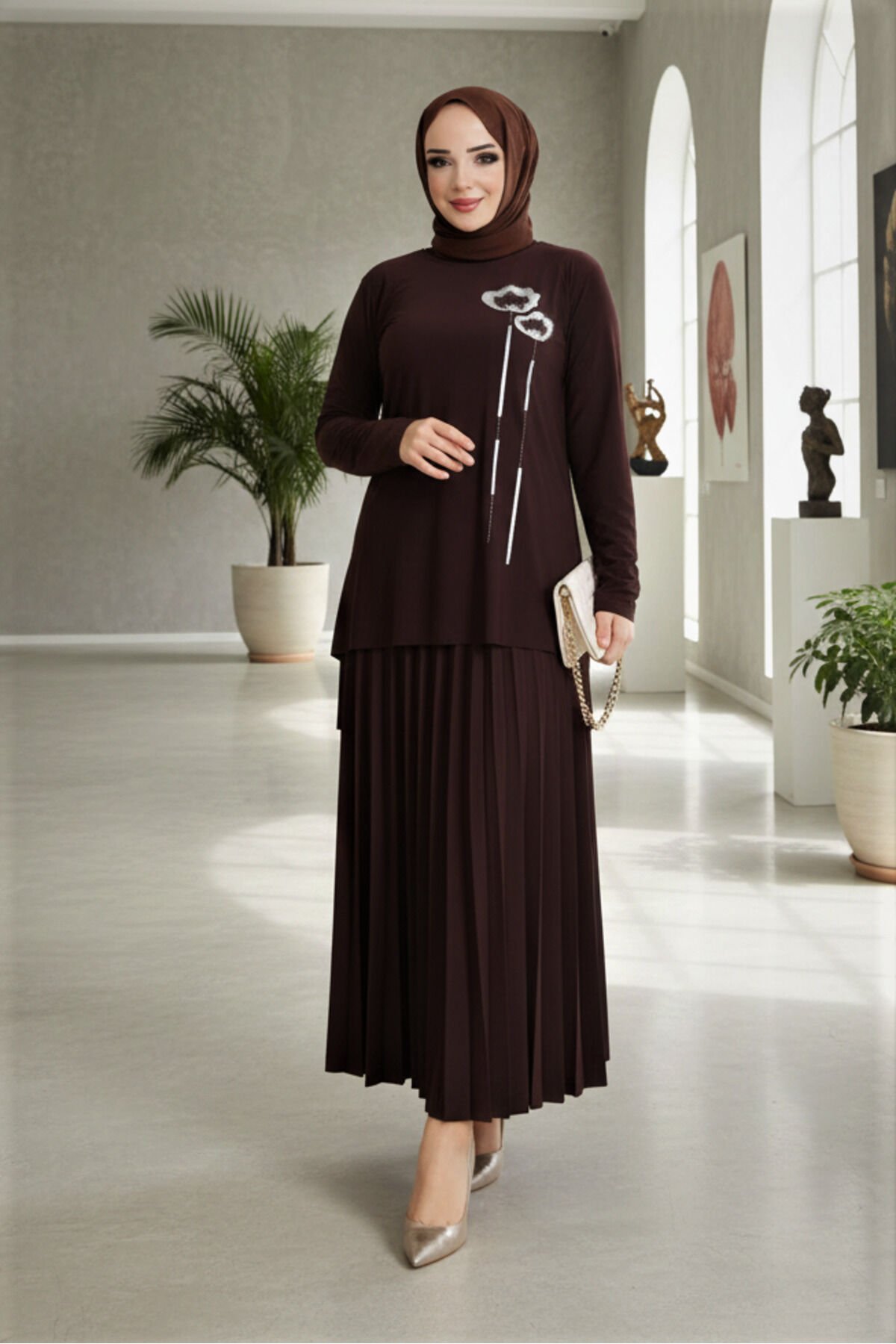 Kadın Sandy Siyah tarz özel davet anne Büyük Beden Piliseli İkili Tesettür Etekli Takım Kahve - 50