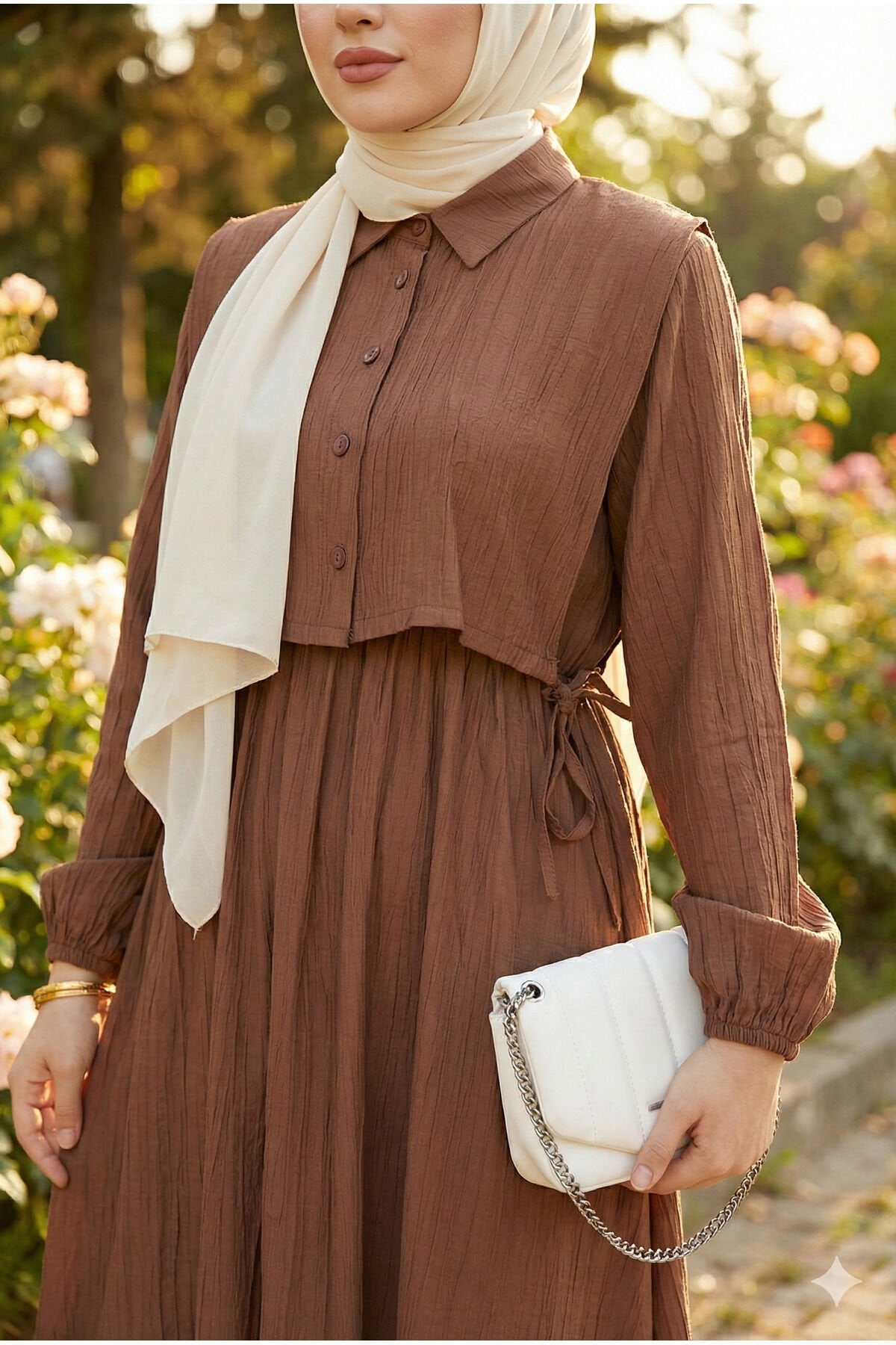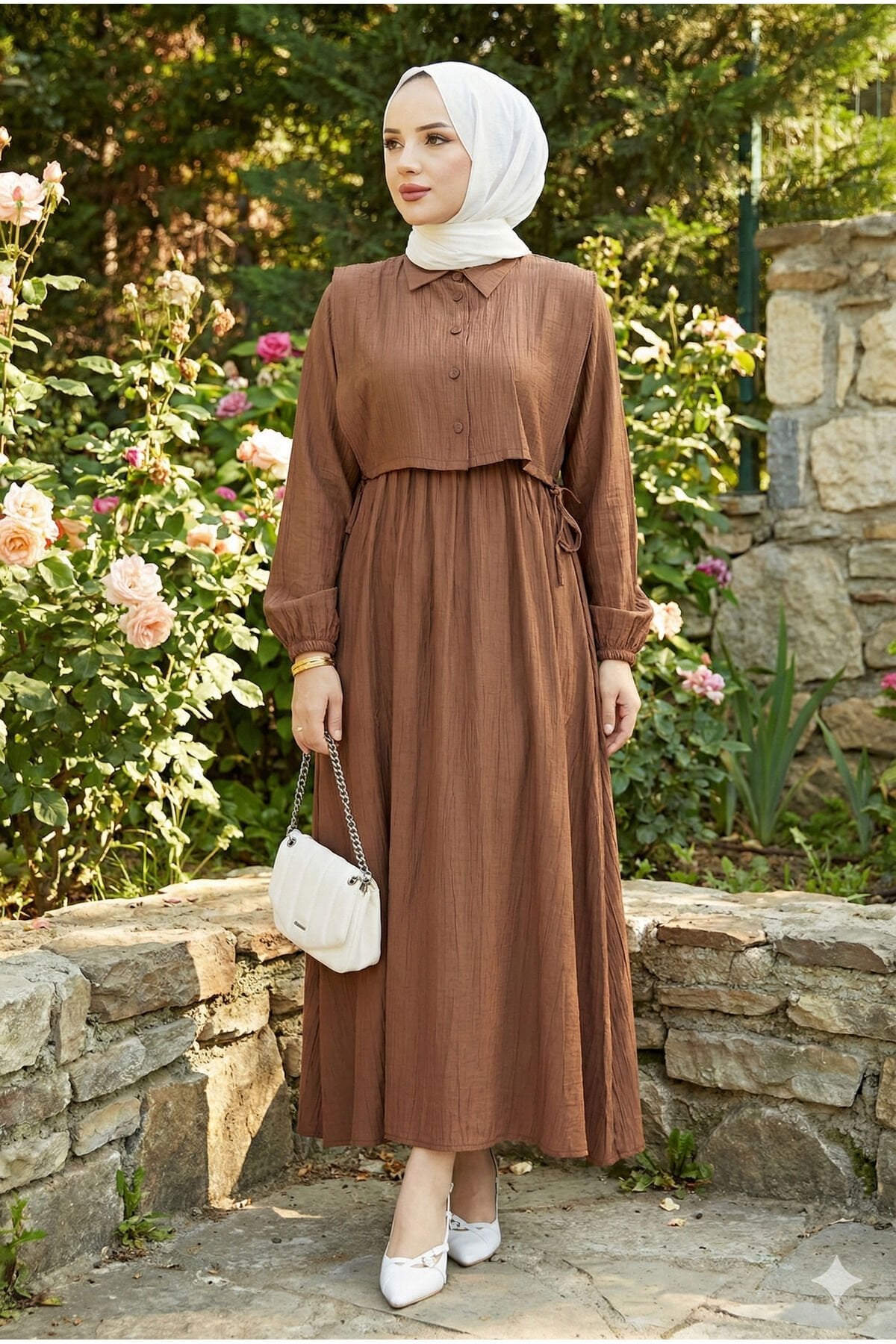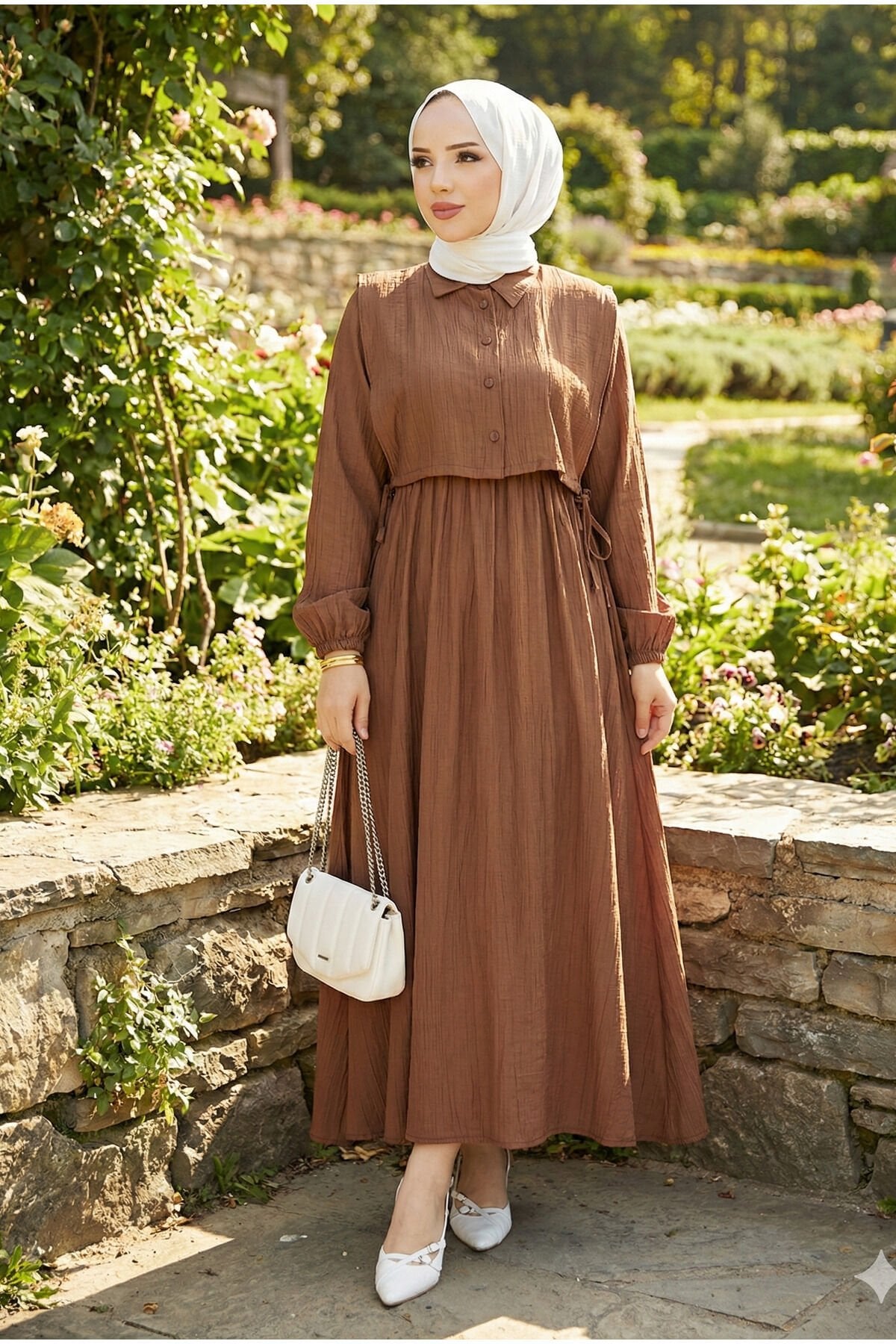 Kadın Taba Gömlek Yaka rahat kalıp Düğmeli Belden Büzgülü çilek Kumaş Tesettür elbise Kahverengi - 44
