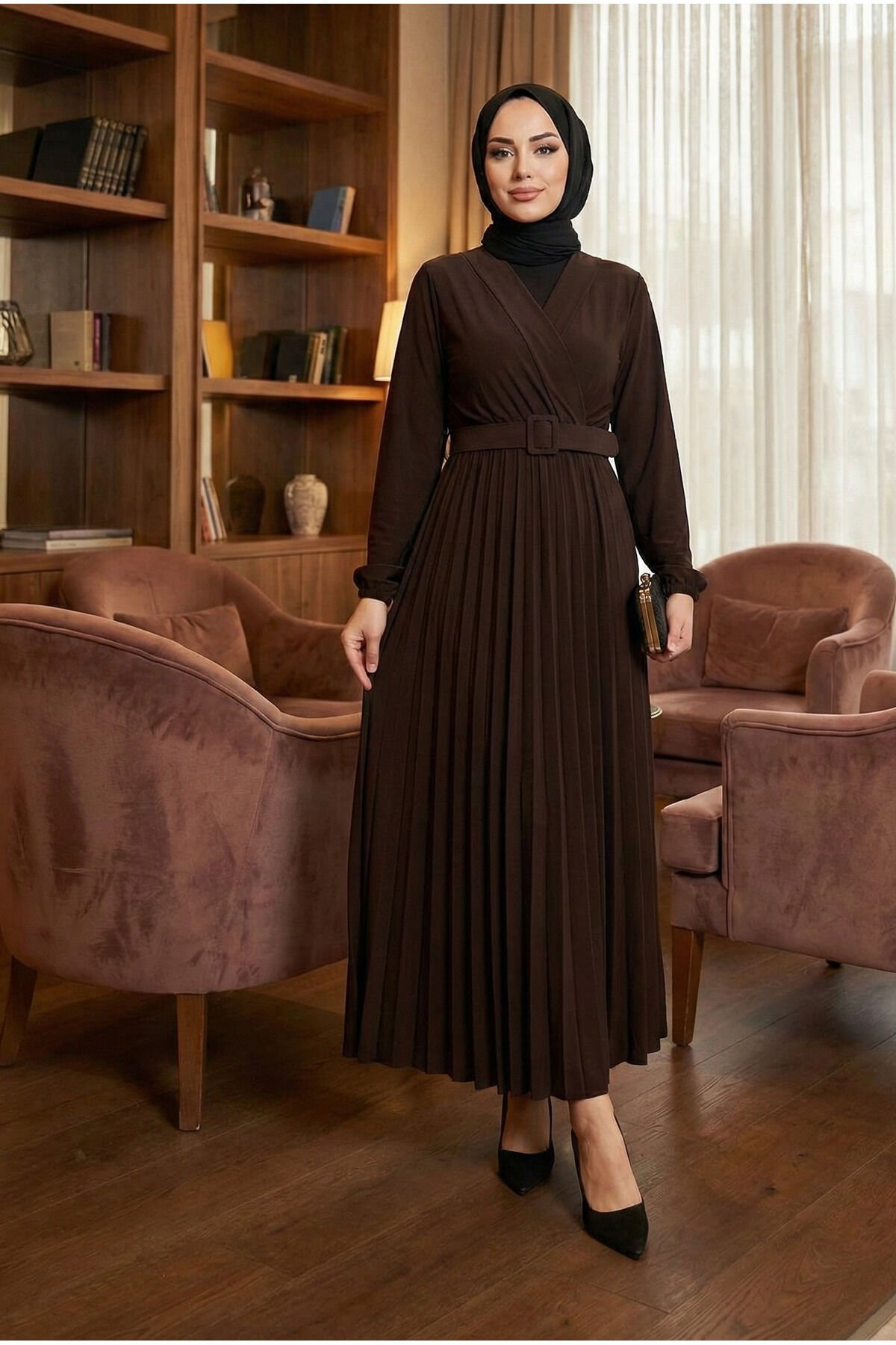 Kadın Sandy Bordo Önü Kruvaze Detaylı Eteği Piliseli Kemerli Boydan Tesettür Elbise Kahverengi̇ - 46