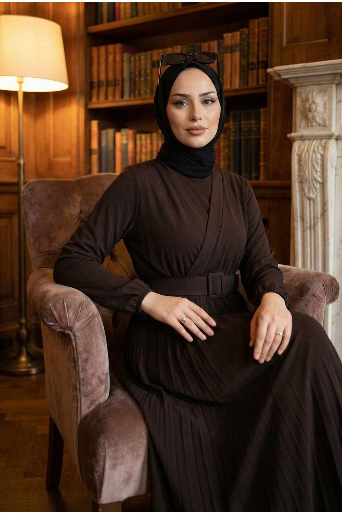 - Kruvaze yaka tasarımı ile modern ve şık bir görünüm sunar.; - Viskon likra karışımından oluşan kumaşı, esnekliği ve konforu bir arada sağlar.; - Piliseli detayları ile feminen çizgiler ön plana çıkar.; - Kemer aksesuarı sayesinde bel bölgesini vurgulayan zarif bir siluet oluşturur.; - Tesettür giyim koleksiyonuna özel olarak tasarlanmıştır; hem günlük kullanım hem de özel günler için idealdir.; - Kutusuz ambalajıyla pratik bir şekilde tercih edilebilir; ekstra paketleme maliyetinden tasarruf etmenizi sağlar.; - Cool & comfort persona'ya uygun rahatlıkta tasarlanmıştır; her ortamda kendinizi iyi hissetmenize yardımcı olur.; - Tüm sezonlarda rahatlıkla kullanabileceğiniz çok yönlü bir seçenektir.; - Astarlı olmamasına rağmen hafif iç göstermez; böylece gün boyu rahatlığınızdan ödün vermezsiniz.; - Yetişkin yaş grubuna hitap eden geniş kullanıcı kitlesine sahiptir.; - Sürdürülebilirlik ilkelerine duyarlı üretim süreciyle çevre dostudur.; - Ek özellik bulunmayan bu elbise, sadelikten yana olanların beğenisini kazanır.; - Sandy dokuma tipi sayesinde dayanıklılık ve uzun ömürlülük sunarken aynı zamanda estetik duruşunu korur.; - 30 derecede yıkama imkanı sayesinde kolay bakım avantajlarından faydalanabilirsiniz.; - Paket içeriğindeki tek parça ile ihtiyacınız olan her şeyi tek seferde temin edebilirsiniz.; - Uzun boy kesimiyle bacak hatlarınıza zarifçe oturan şık bir duruş sergiler.; - TR menşeli olmasıyla yerel malzemelerden üretilmiş olup ülke ekonomisine katkıda bulunur.; - Örme kumaş yapısıyla yumuşak dokunuşu cildinize nazikçe temas ederken konforlu bir deneyim vaat eder.; - Regular kalıp seçeneğiyle vücut hatlarınıza uyum sağlayarak rahat hareket etme özgürlüğü tanır.; - Kadın ve kız çocuklarına yönelik tasarlanmış olup herkes tarafından tercih edilebilir.; - Viskon karışımlı materyali sayesinde nefes alabilen yapıda olup yaz ayları için idealdir.; - Uzun kol boyu mevsimsel geçişlerde bile şıklığınızdan ödün vermemenizi sağlar.; - Düz deseniyle sadelikten yana olanların vazgeçilmezi haline gelirken kombin yapmayı da kolaylaştırır.; - Trend ortamlara uygun stil anlayışını yansıtan bu elbise ile modaya ayak uydurabilirsiniz.- Uzun kollu tasarımı ile mevsim geçişlerinde ve serin havalarda konforlu bir kullanım sunar.; - Viskon karışımlı materyali sayesinde yumuşak dokunuşu ve nefes alabilir yapısıyla gün boyu rahatlık sağlar.; - Kruvaze yaka detayı ile modern ve şık bir görünüm kazandırırken, düz deseniyle kolayca kombinlenebilir.; - KAHVERENGİ rengiyle zamansız bir şıklık sunar ve farklı aksesuarlarla kişisel tarzınıza uyum sağlar.; - Uzun boyu sayesinde zarif bir siluet oluştururken, piliseli eteği ile hareket özgürlüğü ve feminen bir dokunuş katmaktadır.; - Cepsiz tasarımı ile sade ve minimalist bir görünüm elde edilirken, iç göstermeyen kumaş yapısı rahatlıkla hareket etme imkanı tanır.; - Regular kalıp ile vücut hatlarınıza uyum sağlayarak konforlu bir kullanım sunar.; - Kruvaze kapama şekli hem estetik hem de pratik bir kullanım vaat eder.; - Örme kumaş tipi esneklik ve dayanıklılık sunarak uzun süreli kullanım için idealdir.; - Tesettür giyim koleksiyonuna ait bu parça, hem