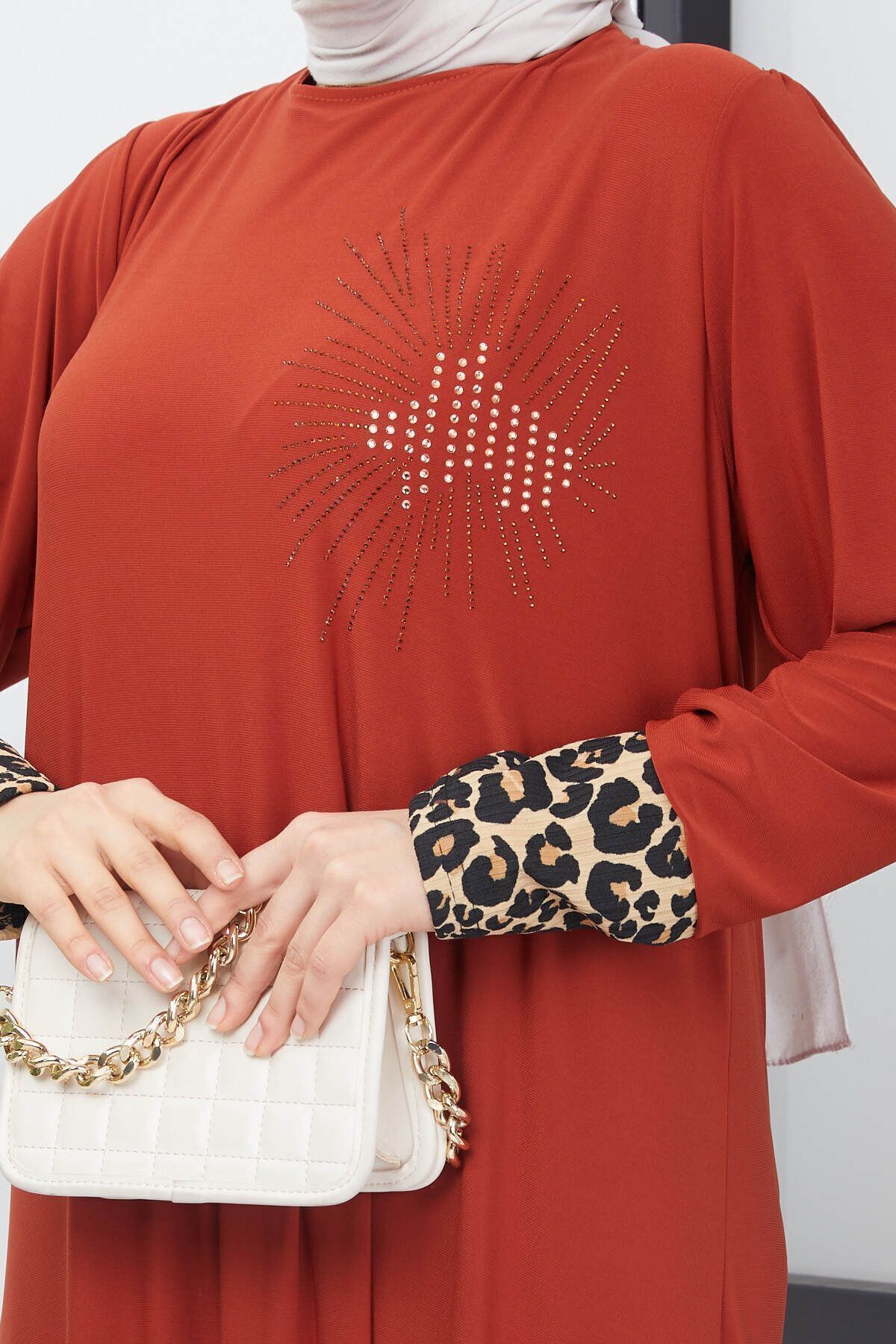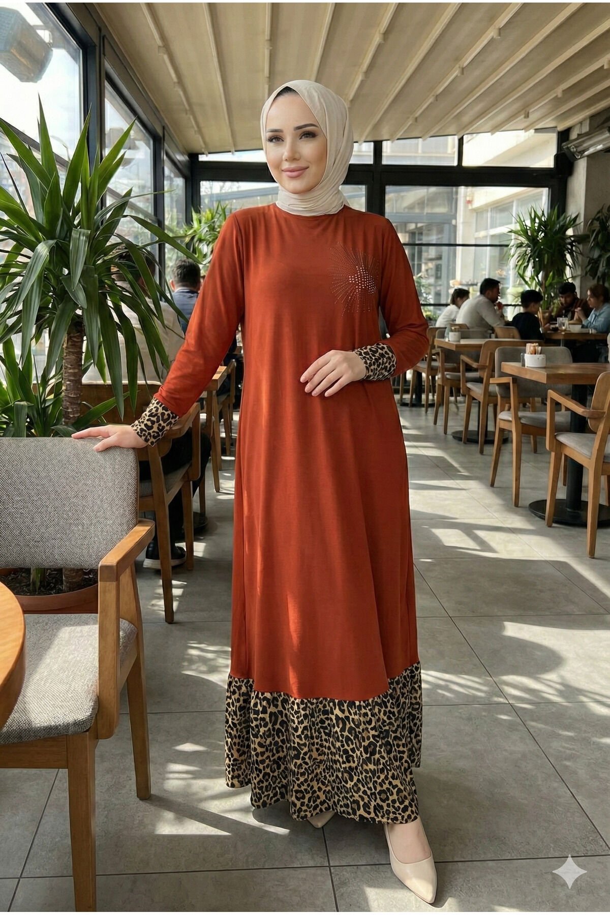 Kadın Kahve Sandy Göğsü Taşlı Kolu Ve Eteği Leopar Garnili Tesettür Uzun Elbise Ki̇remi̇t - 42-44