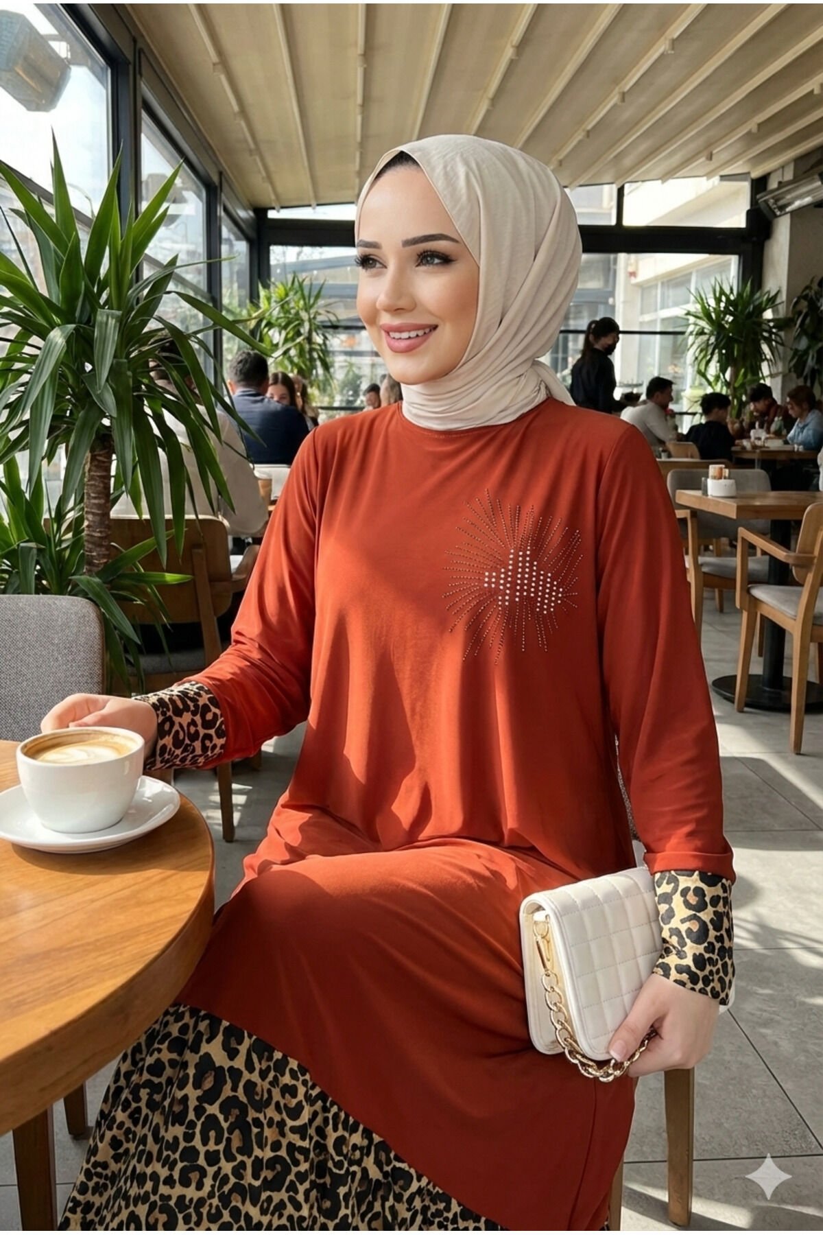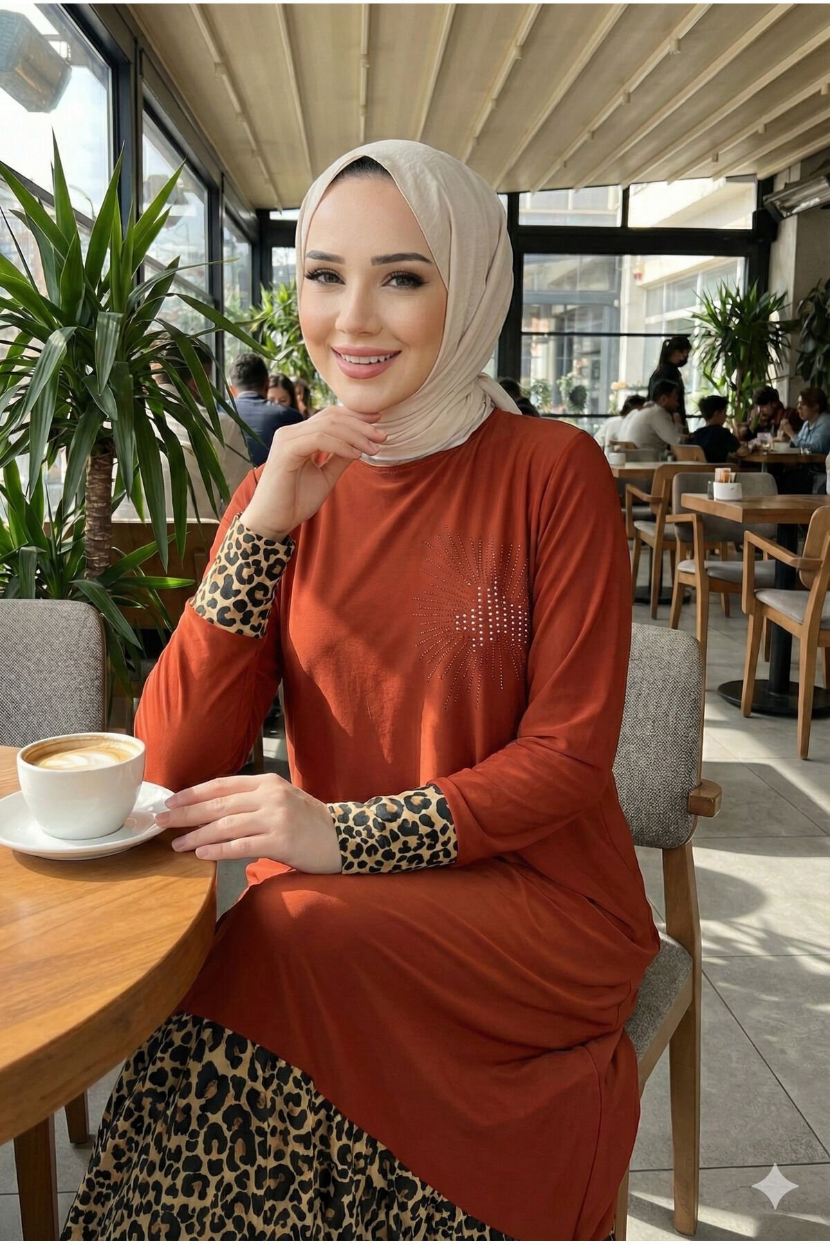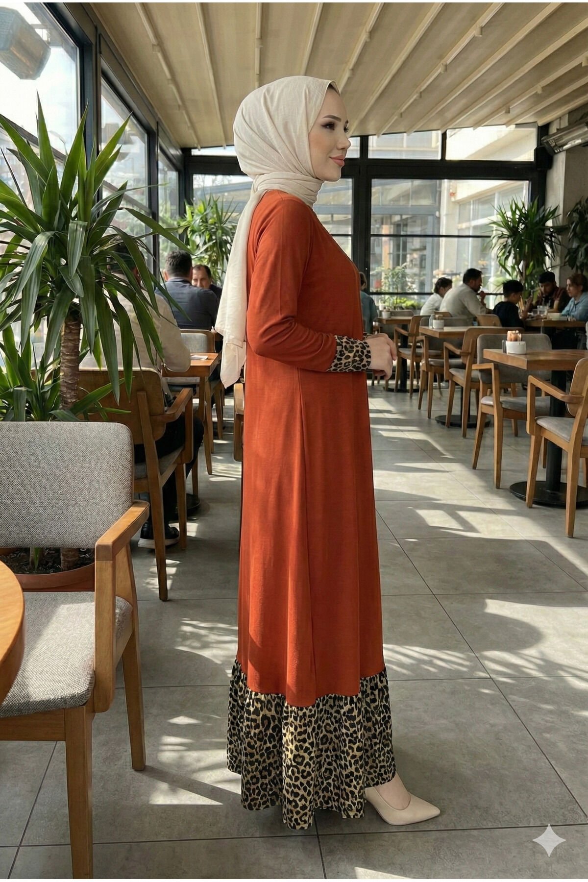 - Zarif tasarımıyla dikkat çeken bu elbise, kahverengi tonlarındaki leopar deseniyle göz alıcı bir görünüm sunar.; - Büyük beden kalıbıyla rahatlık ve şıklığı bir arada yaşamanızı sağlar; her vücut tipine uyum sağlayacak şekilde tasarlanmıştır.; - Astarsız yapısı sayesinde hafif ve ferah bir kullanım imkanı tanır; yaz ayları için idealdir.; - Sürdürülebilir malzemelerden üretilmiş olup, çevreye duyarlı tercihler yapmak isteyenler için uygundur.; - Uzun kol boyu ile mevsim geçişlerinde de konforlu bir kullanım sunarken, standart kol kesimiyle günlük aktivitelerinizde rahat hareket etmenize olanak tanır.; - Cool & comfort persona'sına sahip olan bu elbise, hem gündüz hem de gece kombinlerinizde stil sahibi görünmenizi sağlar.; - Tesettür giyim koleksiyonuna özel olarak tasarlanmış olup, modern tesettür modasının vazgeçilmez parçalarından biridir.; - Kutusuz ambalaj seçeneğiyle minimalist bir yaklaşım sergileyerek çevre dostu bir tercih yapmanızda yardımcı olur.; - Basic silueti sayesinde zamansız parçalar arasında yerini alırken, desenli yapısıyla trendleri takip ederken kendinizi ifade etmenize olanak tanır.; - 30 derecede yıkama talimatına uygun şekilde bakım yapıldığında uzun süre ilk günkü gibi kalacaktır.; - Yetişkin yaş grubuna hitap eden bu ürün, gardrobunuzda kolayca yer bulabilecek çok yönlülüğe sahiptir.; - Örme detaylarıyla zenginleştirilmiş dokusuyla yumuşaklık hissi verirken sandy kumaşı dayanıklılığı arttırarak uzun süreli kullanım vaat eder.; - Cepsiz tasarım hem pratiklik hem de estetik açıdan hoş bir alternatif sunar.- Uzun boy tasarımı ile hem gündüz hem de gece şıklığınızı tamamlar.; - Büyük beden kalıbıyla rahatlık ve konfor sunar, her vücut tipine uyum sağlar.; - Örme kumaş yapısı sayesinde esneklik kazanır ve hareket özgürlüğü tanır.; - Viskon karışımlı materyali cildinize nazik dokunuşlar sunarken dayanıklılığı artırır.; - Astarsız yapısıyla hafif ve serin tutar; yaz ayları için idealdir.; - Kemersiz tasarımı ile modern ve minimalist bir görünüm sağlar.; - 48-50 beden seçeneğiyle geniş beden aralığına hitap eder.; - 30 derecede yıkama imkanı sayesinde kolay bakım avantajları sunar.; - Sürdürülebilir malzemeler kullanarak çevreye duyarlı bir tercih yapmanızı sağlar.; - Tesettür giyim koleksiyonuna özel olarak tasarlanmıştır; zarif detaylarıyla dikkat çeker.; - Yetişkinler için uygun yaş grubuna sahip olup günlük kullanım için uygundur.; - Tekli paket içeriğiyle ihtiyacınız olan tek parça elbiseye sahip olursunuz.; - Canlı turuncu rengiyle enerjinizi yansıtmanızda yardımcı olacak renk seçeneği sunar.; - Kutusuz ambalajla minimalist yaklaşımı benimseyerek minimalist yaşam tarzını destekler.; - Sandy dokuma tipi sayesinde yumuşak dokusuyla teninizde hoş hissettiren bir yapıya sahiptir.; - Bisiklet yakası ile sade ve şık bir görünüm kazandırırken aynı zamanda rahatlık sunar.; - Desenli tasarım leopar garnilerle göz alıcı detaylara yer vererek stilinizi öne çıkarır.; - Standart kol tipiyle günlük aktivitelerinizde maksimum konfor sağlar.; - Basic siluetiyle zamansız parçalar arasında yerini alarak gardrobunuzun vazgeçilmezleri arasına girer.; - Uzun kol boyu mevsimsel geçişlerde ideal koruma sunarken şık duruşunu korur.; - Cool & comfort persona özellikleriyle rahatlıkla tarzınızı yansıtabileceğiniz bir seçenektir.; - Cepsiz oluşu pratik kullanım imkanları sunarken minimalist çizgilere sadık kalır.