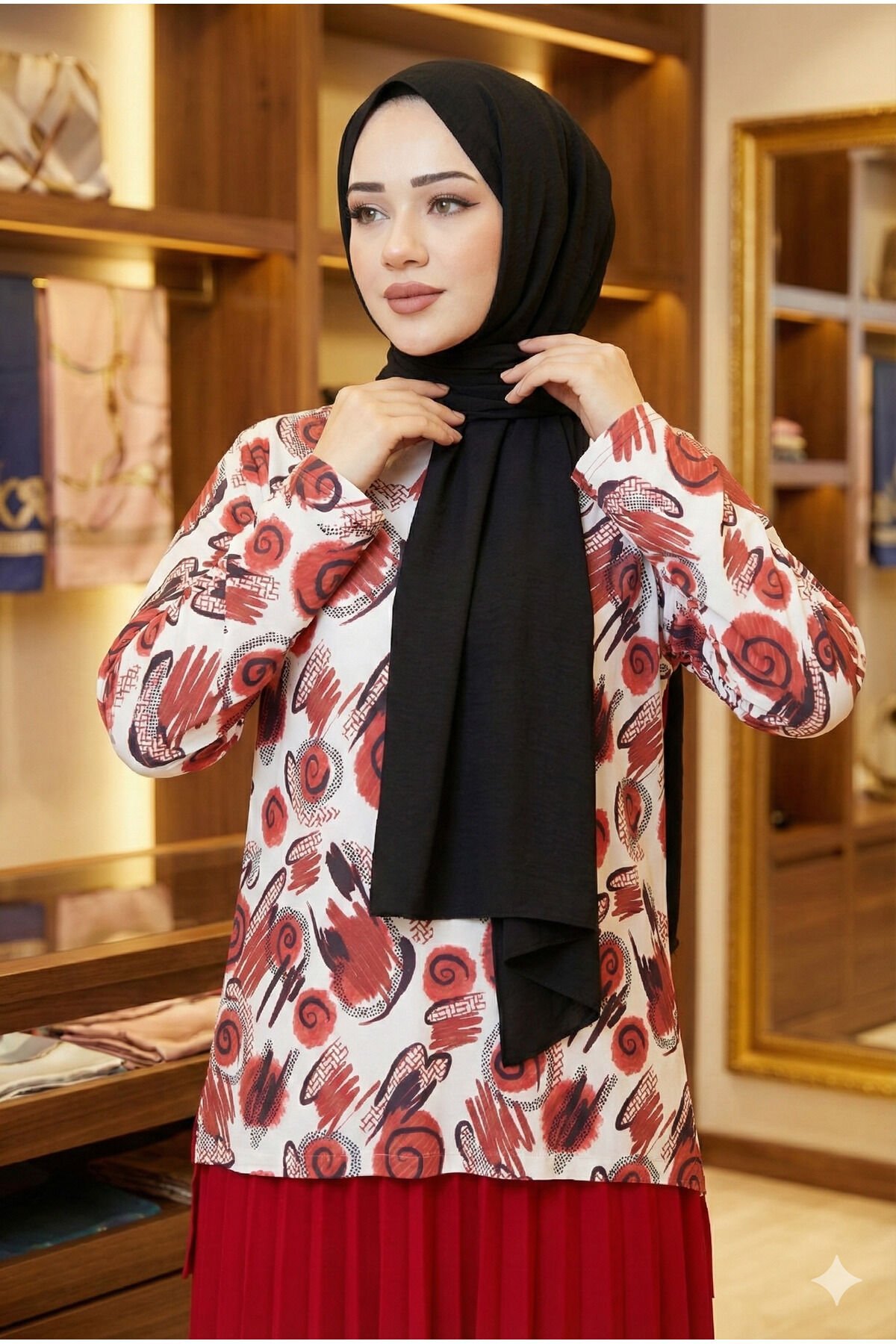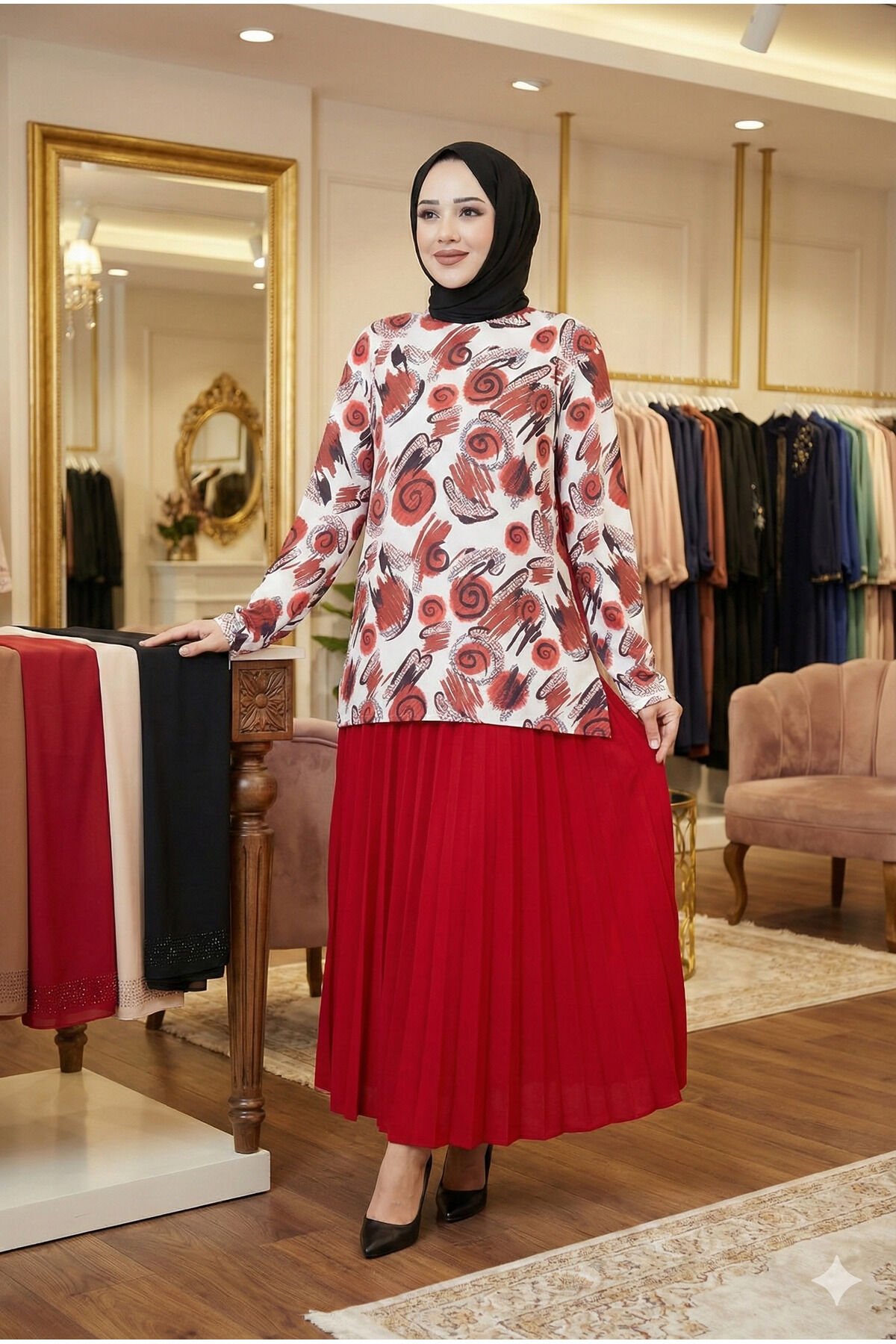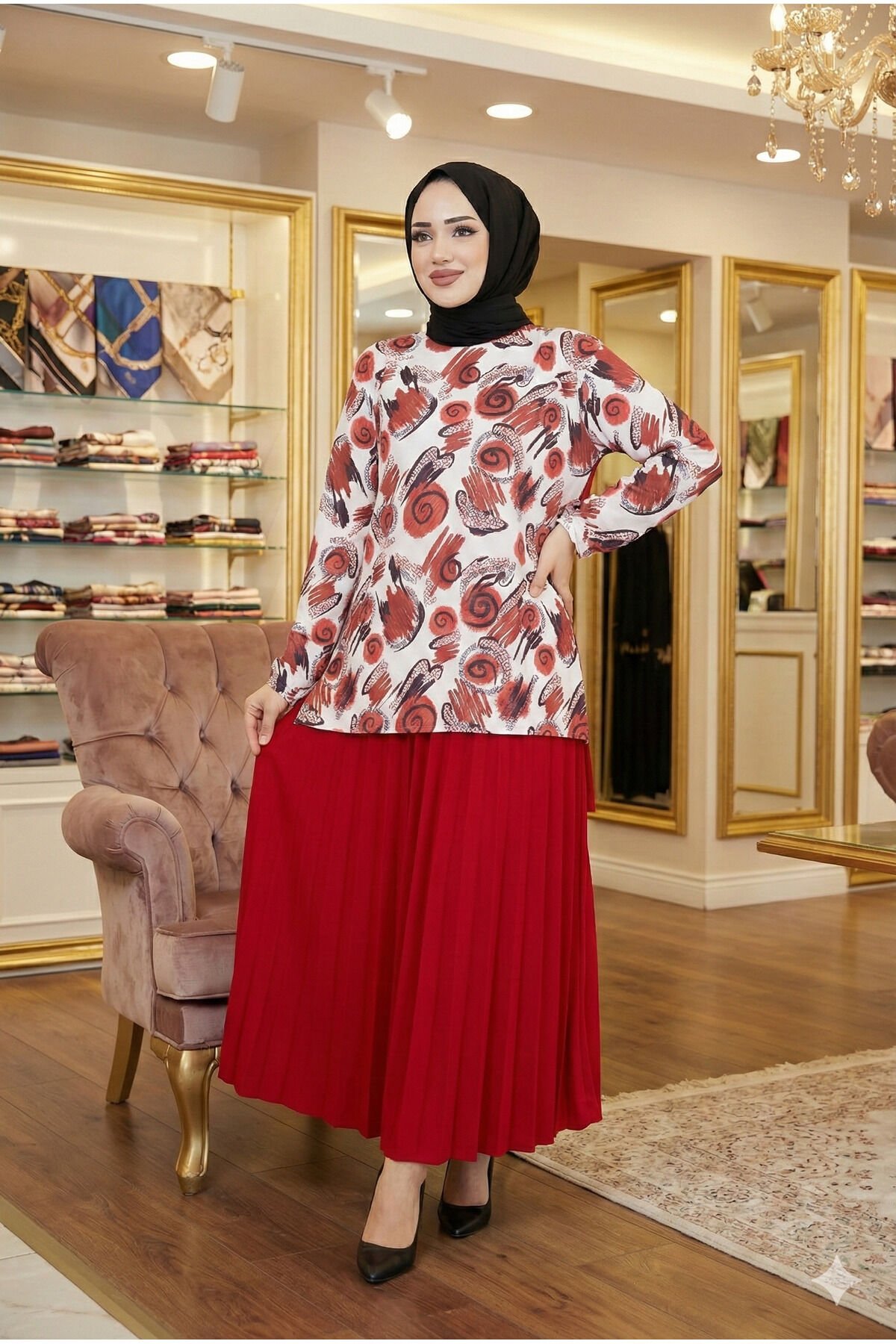 Kadın Sandy vişne Dijital Baskı Bluz Pilise Etek İkili Etekli Takım Kirmizi - 50