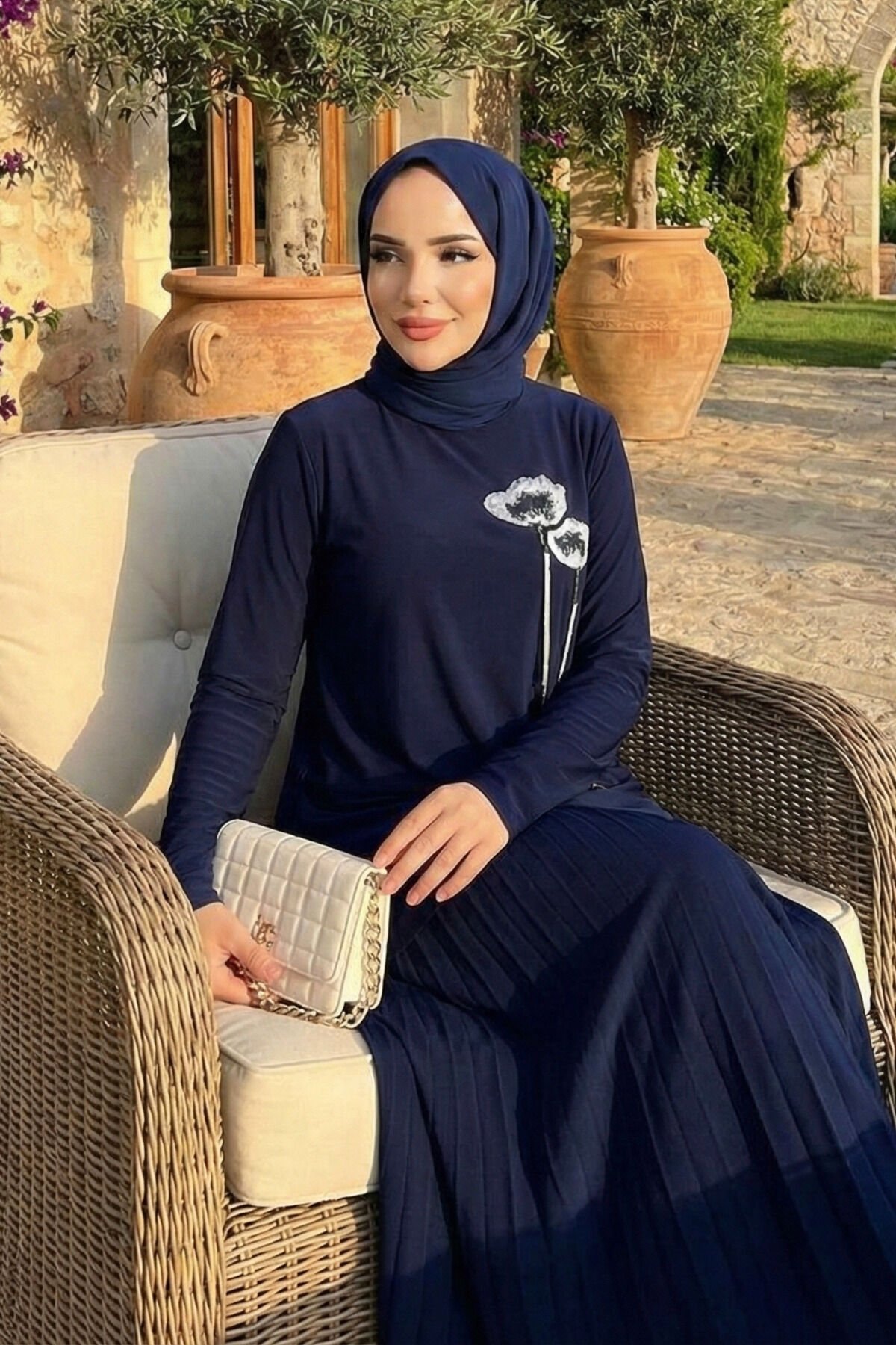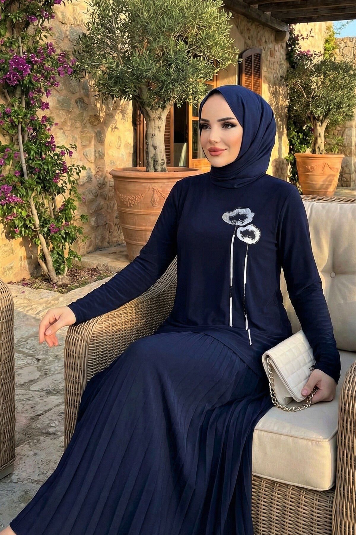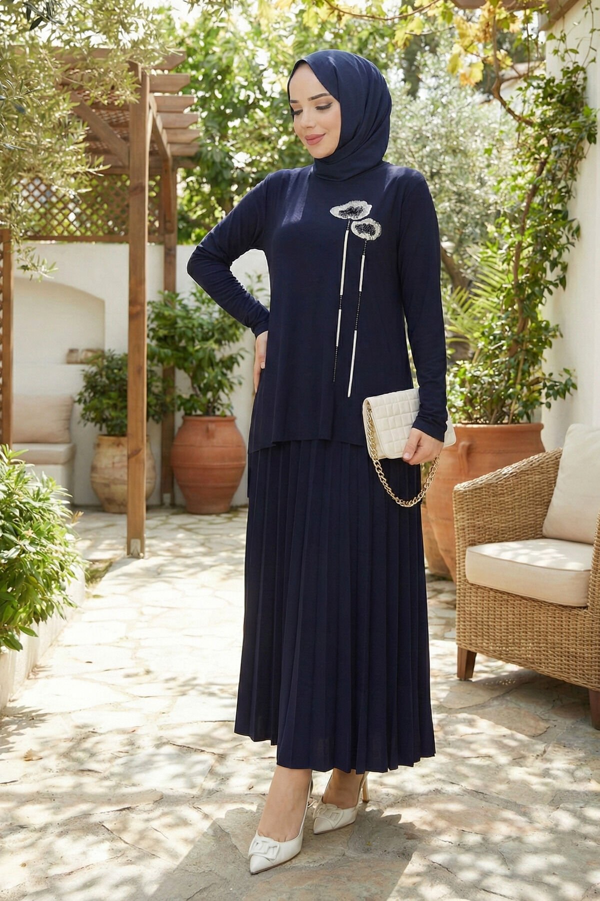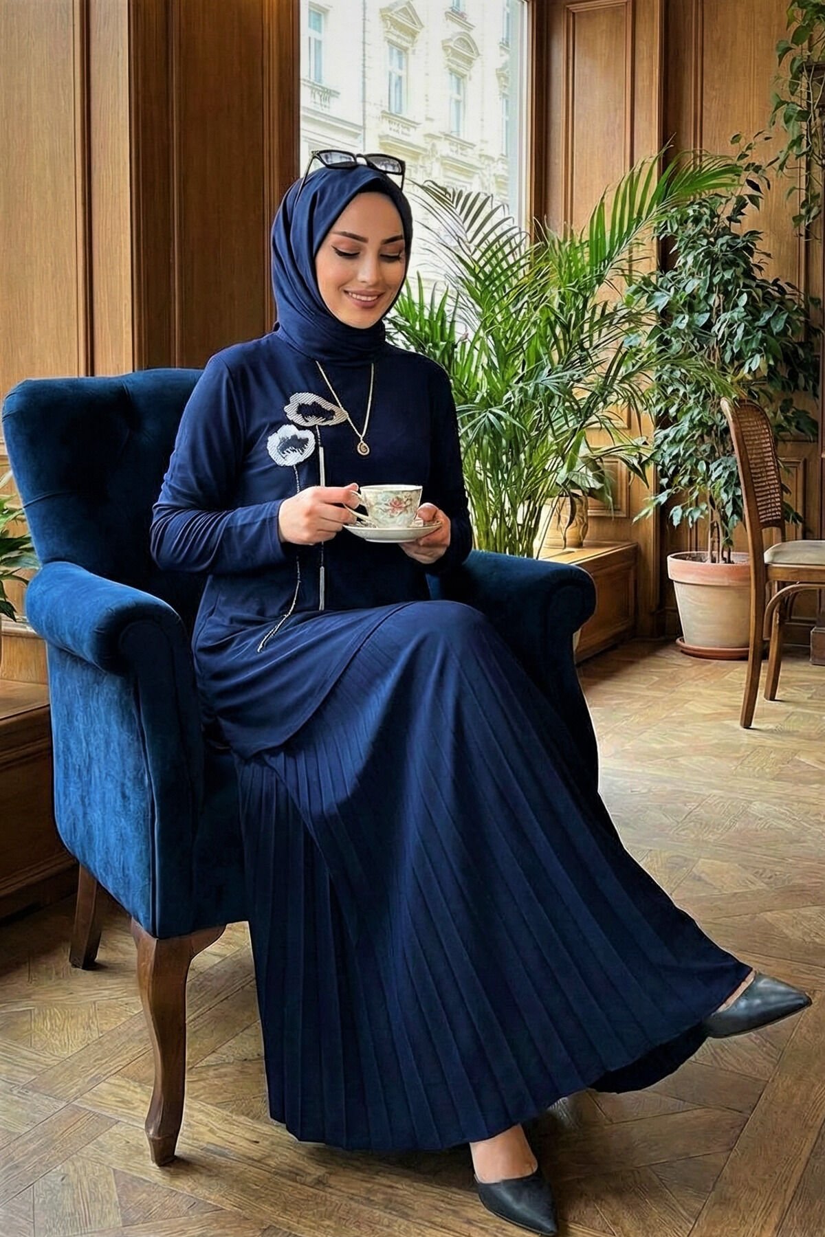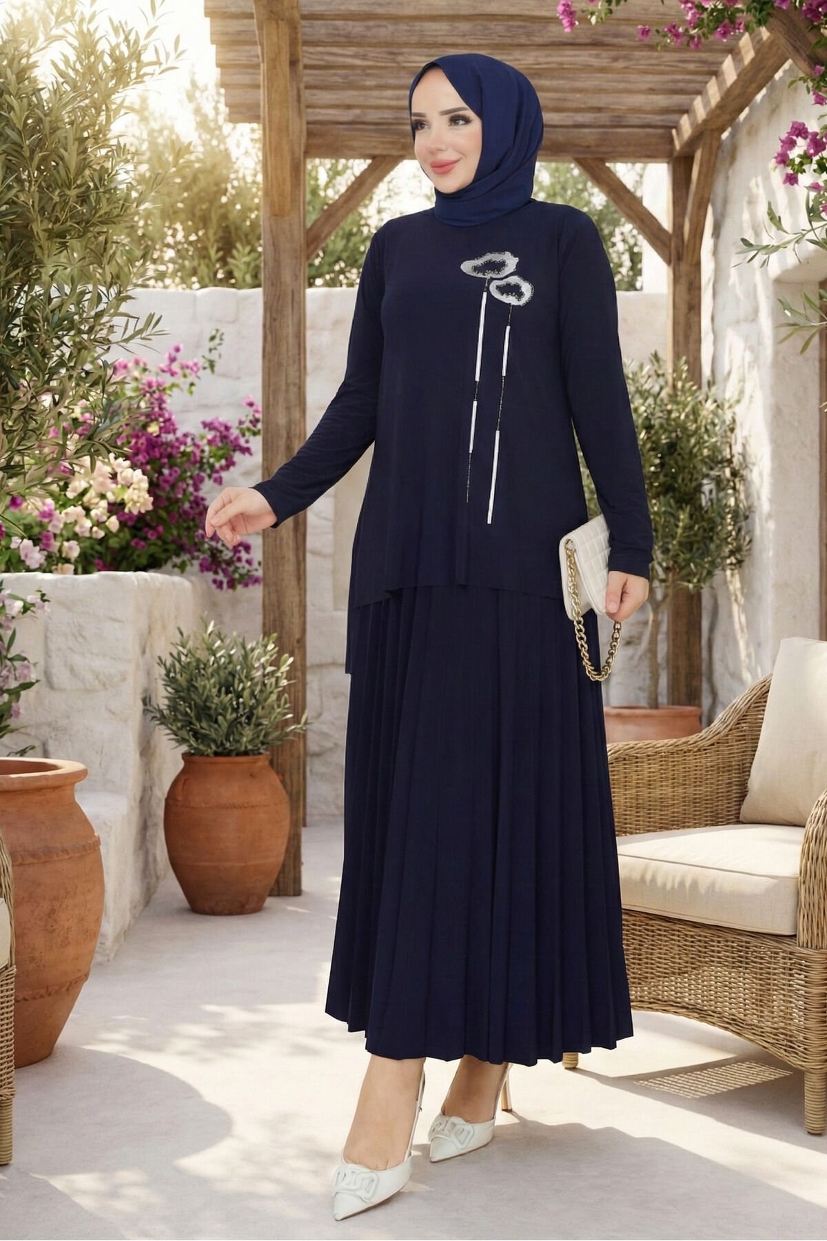 Kadın Sandy Siyah tarz özel davet anne Büyük Beden Piliseli İkili Tesettür Etekli Takım Laci̇vert - 42