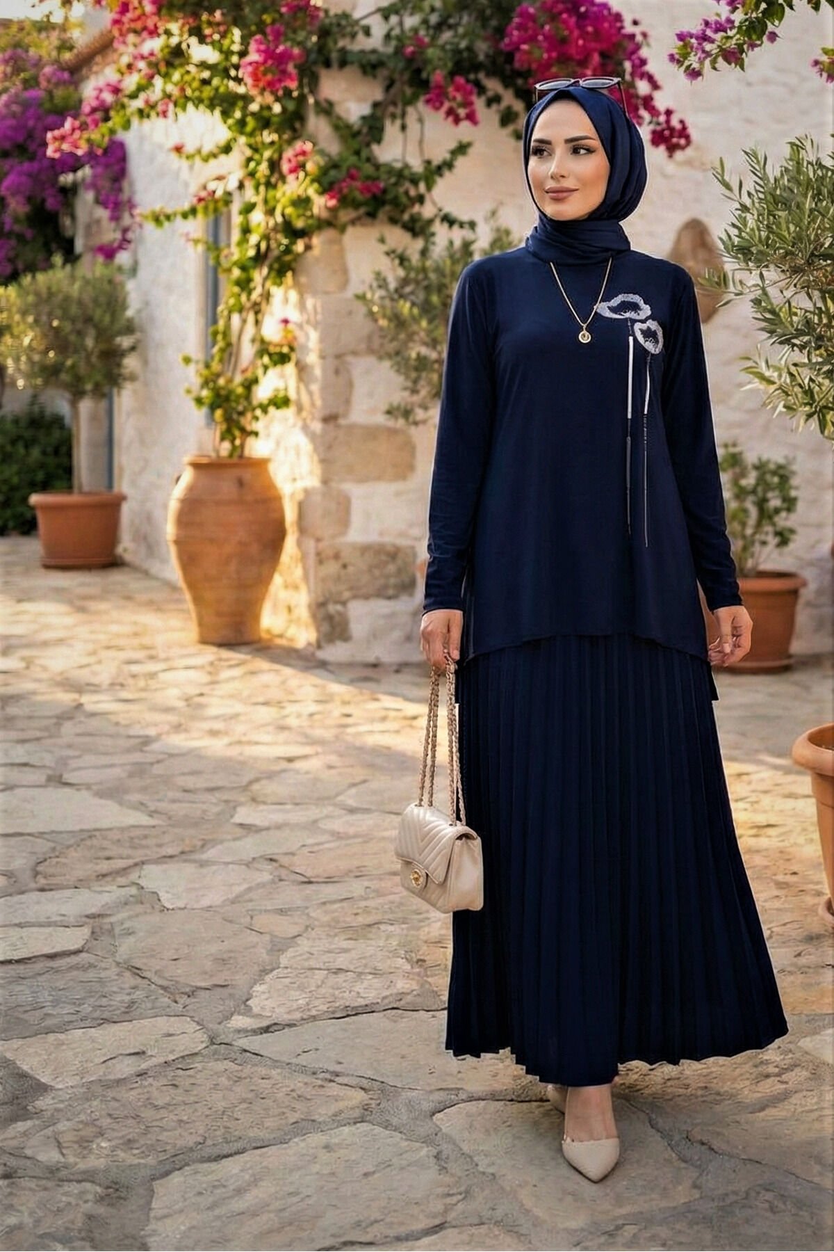 - Rahat kesimi ile büyük beden tercih edenler için ideal, uzun boy tasarımıyla şıklığı ve konforu bir arada sunar.; - Aplike detayları ile göz alıcı bir görünüm kazandırırken, astarsız yapısı sayesinde hafif ve ferah bir kullanım sağlar.; - Düz deseniyle kolayca kombinlenebilen bu takım, yaz ayları için mükemmel bir seçenektir.; - Yüksek bel tasarımı sayesinde vücut hatlarını zarifçe sararak feminen bir siluet oluşturur.; - Uzun kol boyu ile mevsimsel geçişlerde ideal koruma sunarken, cep detayı bulunmayan pratik bir kullanım vaat eder.; - Bluzlu etekli takım olarak tasarlanmış olup, hem şıklığı hem de rahatlığı aynı anda yakalamanızı sağlar.; - Orta kalınlığa sahip viskon karışımlı materyali sayesinde mevsim koşullarına uygun konfor sunar.; - Paçasız paça tipiyle modern ve zamansız bir tarza sahip olan bu takım, günlük kullanım için uygundur.; - Viskon likra karışımlı materyali esneklik kazandırarak gün boyu rahat hareket etmenizi sağlar.; - 30 derecede yıkama imkanına sahip olması bakımını kolaylaştırırken, kırışmaya dayanıklı özelliğiyle zamandan tasarruf etmenize yardımcı olur.; - Yetişkin yaş grubuna hitap eden bu ürün, casual ortamlarda rahatlıkla tercih edilebilir.; - Kutusuz ambalaj seçeneği ile minimalist bir yaklaşımla sunulur; böylece çevre dostu bir tercih yapmış olursunuz.; - Casual giyim koleksiyonuna ait olan bu takım, günlük kullanım için idealdir ve her ortamda stil sahibi görünmenizi sağlar.; - Regular silueti sayesinde farklı vücut tiplerine uyum göstererek geniş bir kullanıcı kitlesine hitap eder.; - Bisiklet yaka detayı modern çizgiler taşıyan bu takımın zarif duruşunu tamamlar.- Rahat kesimi ile günlük kullanıma uygun, yüksek bel tasarımı sayesinde konforlu bir deneyim sunar.; - Uzun kollu bluz ve piliseli etekten oluşan ikili takım, yaz ayları için idealdir; hem şıklığı hem de rahatlığı bir arada yaşamanızı sağlar.; - Viskon karışımlı materyali ile yumuşak dokunuşu ve esnek yapısıyla gün boyu rahat hareket etmenize olanak tanır.; - Sade ve düz deseniyle kolayca kombinlenebilir; farklı aksesuarlarla zenginleştirilebilir.; - Astarsız yapısıyla hafif ve serin tutarken, kırışmaya dayanıklı özelliği sayesinde bakımı kolaydır.; - 30 derecede makinede veya elle tersten yıkama imkanı sunarak pratik kullanım sağlar.; - Gündüzden geceye her ortamda rahatlıkla tercih edebileceğiniz bu takım, tesettür giyim koleksiyonunuzun vazgeçilmez parçası haline gelir.; - Modamira Tekstil tarafından zeytinburnu istanbul'da üretilen bu ürün, kalite standartlarına uygun şekilde hazırlanmıştır.; - Bisiklet yakası sayesinde modern ve şık bir görünüm kazandırırken, bluzun uzun kolları serin yaz akşamları için ideal koruma sağlar.; - Lacivert rengiyle zamansız bir tarz sunarken, her türden aksesuarla uyum içinde kombinlenebilirlik gösterir.