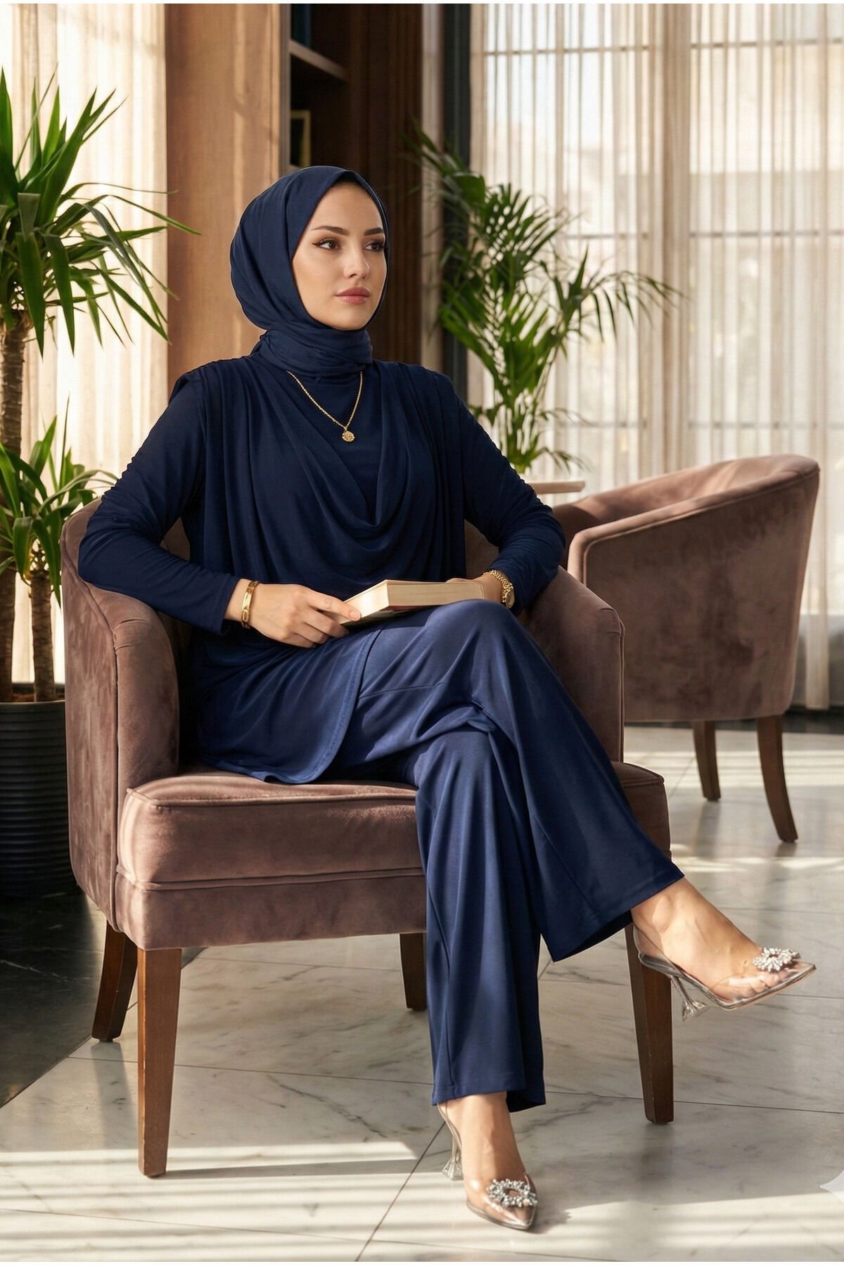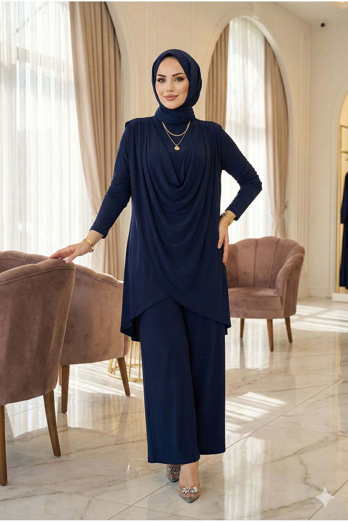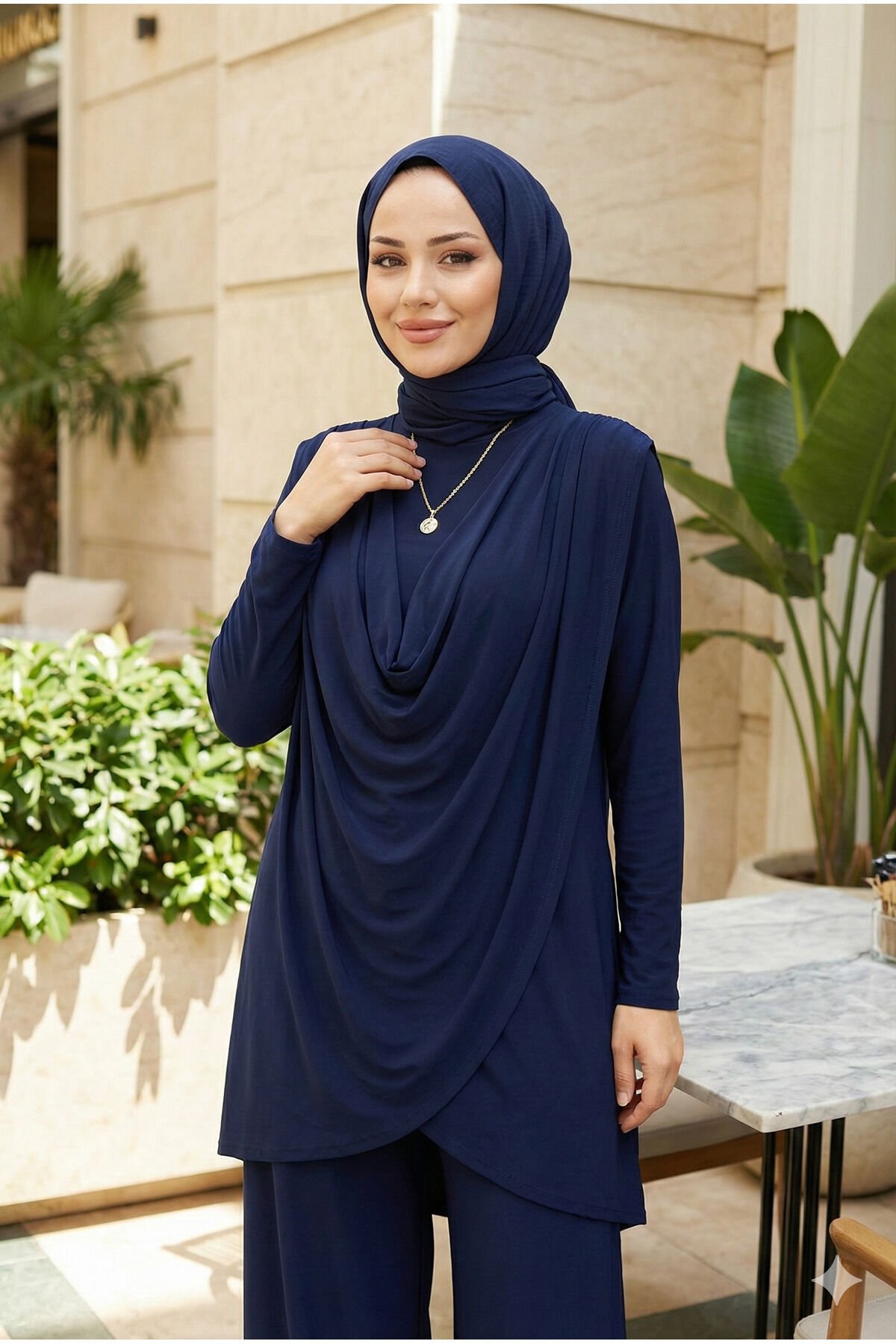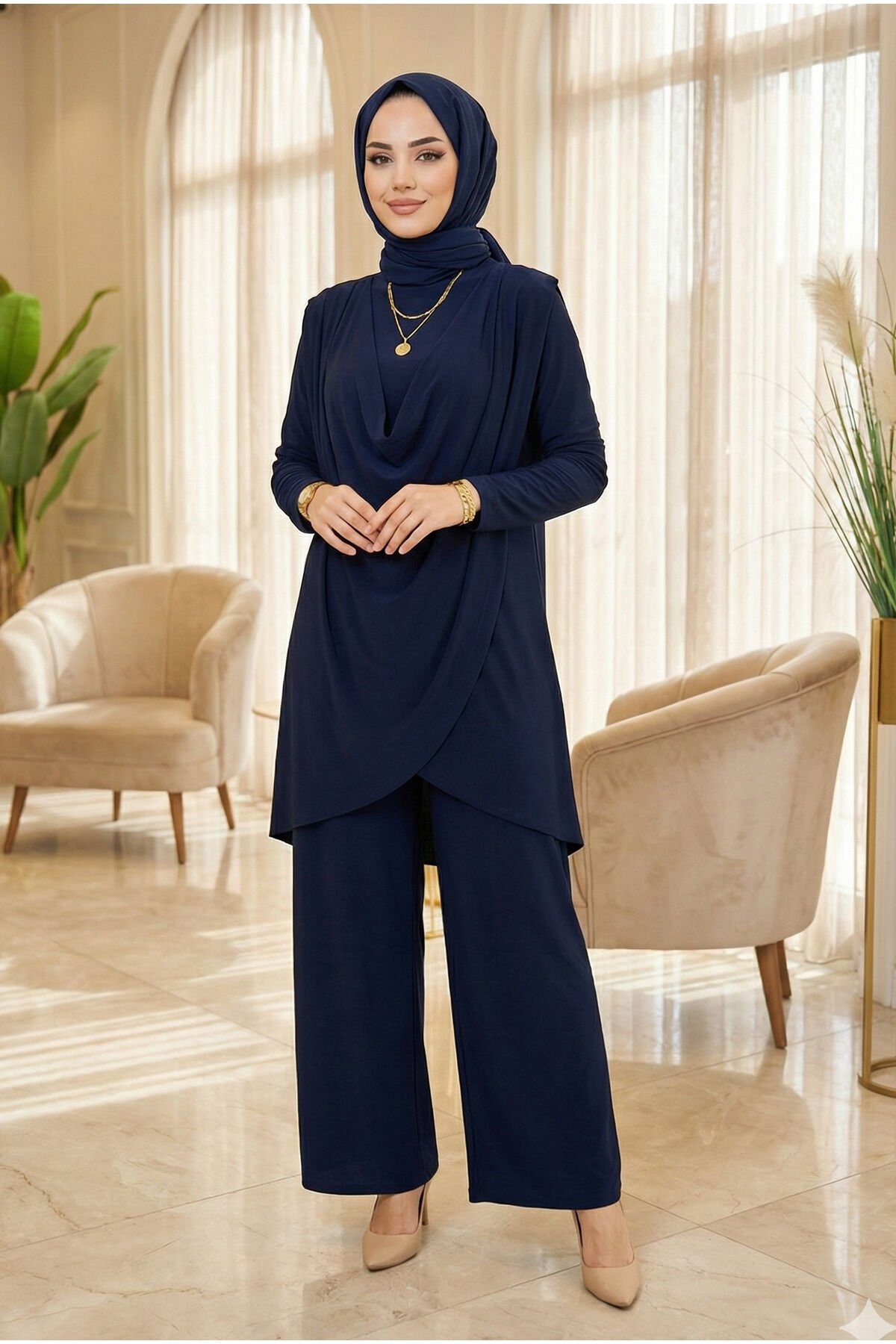 - Yaz aylarının vazgeçilmez parçası olan bu tesettür abiye takımı, hafif ve nefes alabilen viskon karışımlı kumaşıyla konfor sunar.; - Asimetrik kesimi ve bol paça detayları ile modern ve şık bir görünüm sağlar; her adımda zarif bir duruş sergiler.; - Lastikli bel tasarımı sayesinde rahat bir kullanım imkanı tanırken, standart kol tipiyle gün boyu hareket özgürlüğü sunar.; - Kapamasız yapısıyla pratik giyip çıkarma avantajına sahip olup, kırışmaya karşı dayanıklılığı sayesinde bakımı kolaydır.; - Astarsız oluşuyla hafifliği ön planda tutarken, tunikli pantolon kombinasyonu ile hem gündüz hem de gece etkinliklerine uygunluk gösterir.; - 30 derecede makinede veya elde tersten yıkama imkanıyla uzun süreli kullanım için idealdir; böylece sık yıkama gerektirmeyen bir bakım süreci yaşatır.; - Regular kalıp ve ince dokusuyla vücut hatlarınıza uyum sağlayarak rahatlıkla üzerinizde taşıyabileceğiniz bir siluet oluşturur.; - Bisiklet yakası sayesinde sade ama şık bir görünüm kazandırırken, uzun boyuyla bacaklarınızı zarifçe sarar.; - Sandy dokuması yumuşak dokunuşuyla teninizde hoş bir his bırakırken, tunikli pantolonlu alt-üst takım olarak kombinlenebilirliği arttırır.- Yaz aylarının vazgeçilmez parçası olan bu tesettür abiye takımı, hafif ve nefes alabilen viskon karışımlı kumaşıyla konfor sunar.; - Asimetrik kesimi ve bol paça detayları ile modern ve şık bir görünüm sağlar; her adımda zarif bir duruş sergiler.; - Lastikli bel tasarımı sayesinde rahat bir kullanım imkanı tanırken, standart kol tipiyle gün boyu hareket özgürlüğü sunar.; - Kapamasız yapısıyla pratik giyip çıkarma avantajına sahip olup, kırışmaya karşı dayanıklılığı sayesinde bakımı kolaydır.; - Astarsız oluşuyla hafifliği ön planda tutarken, tunikli pantolon kombinasyonu ile hem gündüz hem de gece etkinliklerine uygunluk gösterir.; - 30 derecede makinede veya elde tersten yıkama imkanıyla uzun süreli kullanım için idealdir; böylece sık yıkama gerektirmeyen bir bakım süreci yaşatır.; - Regular kalıp ve ince dokusuyla vücut hatlarınıza uyum sağlayarak rahatlıkla üzerinizde taşıyabileceğiniz bir siluet oluşturur.; - Bisiklet yakası sayesinde sade ama şık bir görünüm kazandırırken, uzun boyuyla bacaklarınızı zarifçe sarar.; - Sandy dokuması yumuşak dokunuşuyla teninizde hoş bir his bırakırken, tunikli pantolonlu alt-üst takım olarak kombinlenebilirliği arttırır.