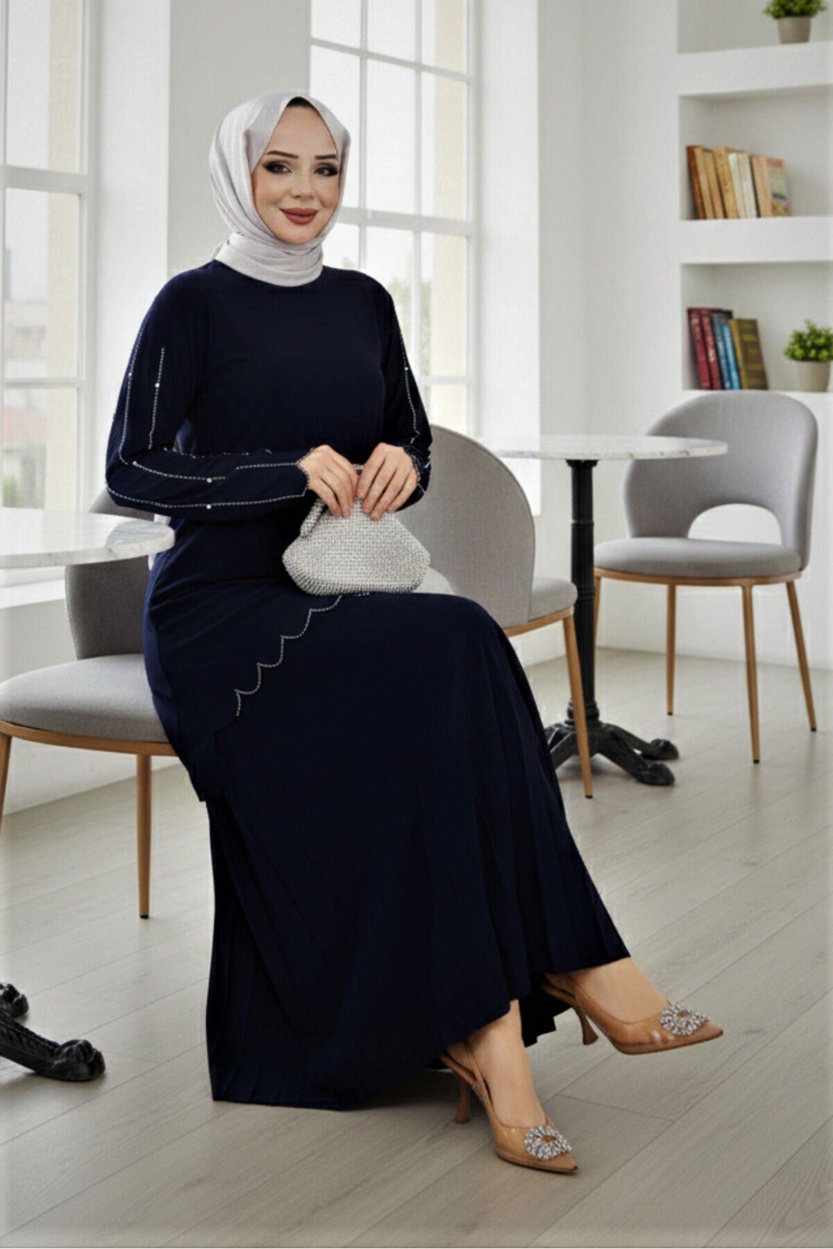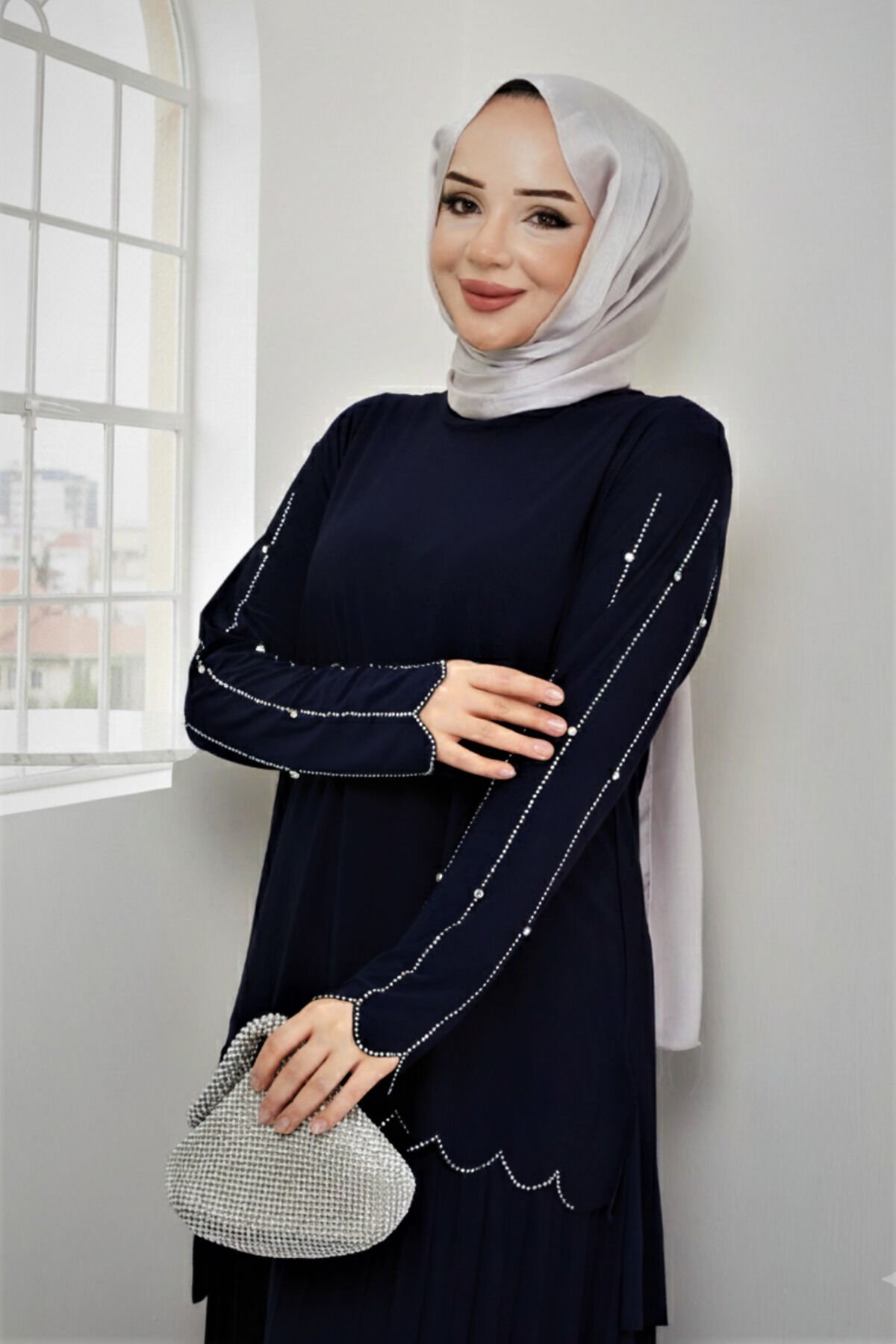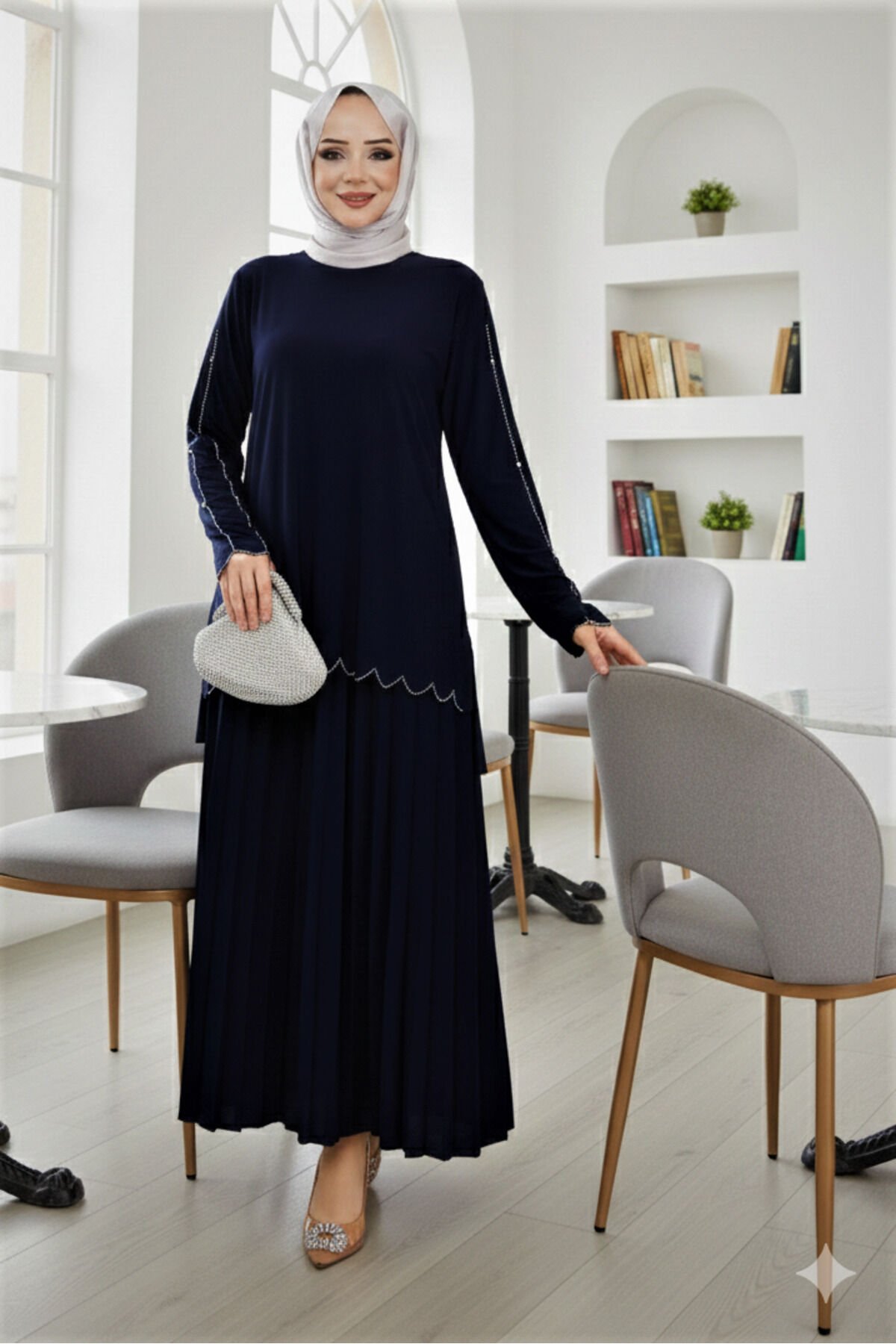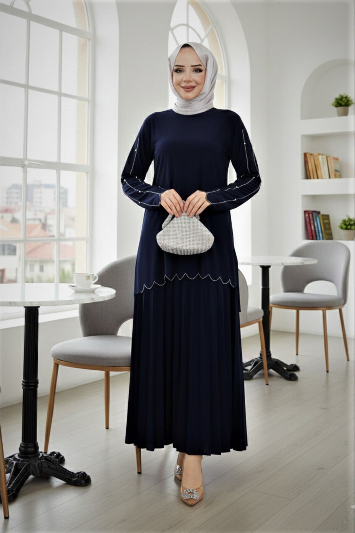 Kadın Lacivert Sandy 2li Önü Ve Kolları Taş Işlemeli Bluz Etek Pliseli Ikili Tesettür Etekli Takım Laci̇vert - 42