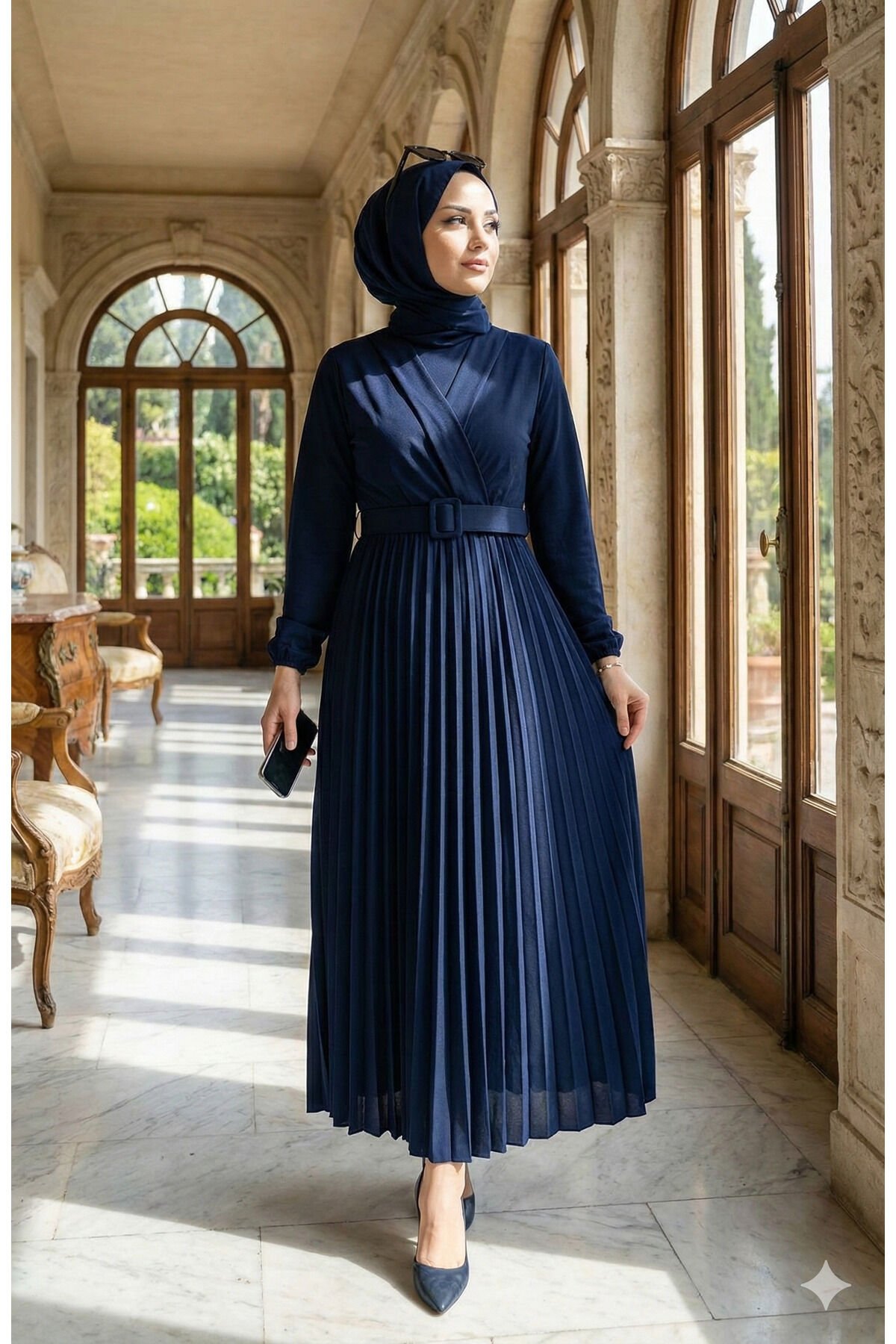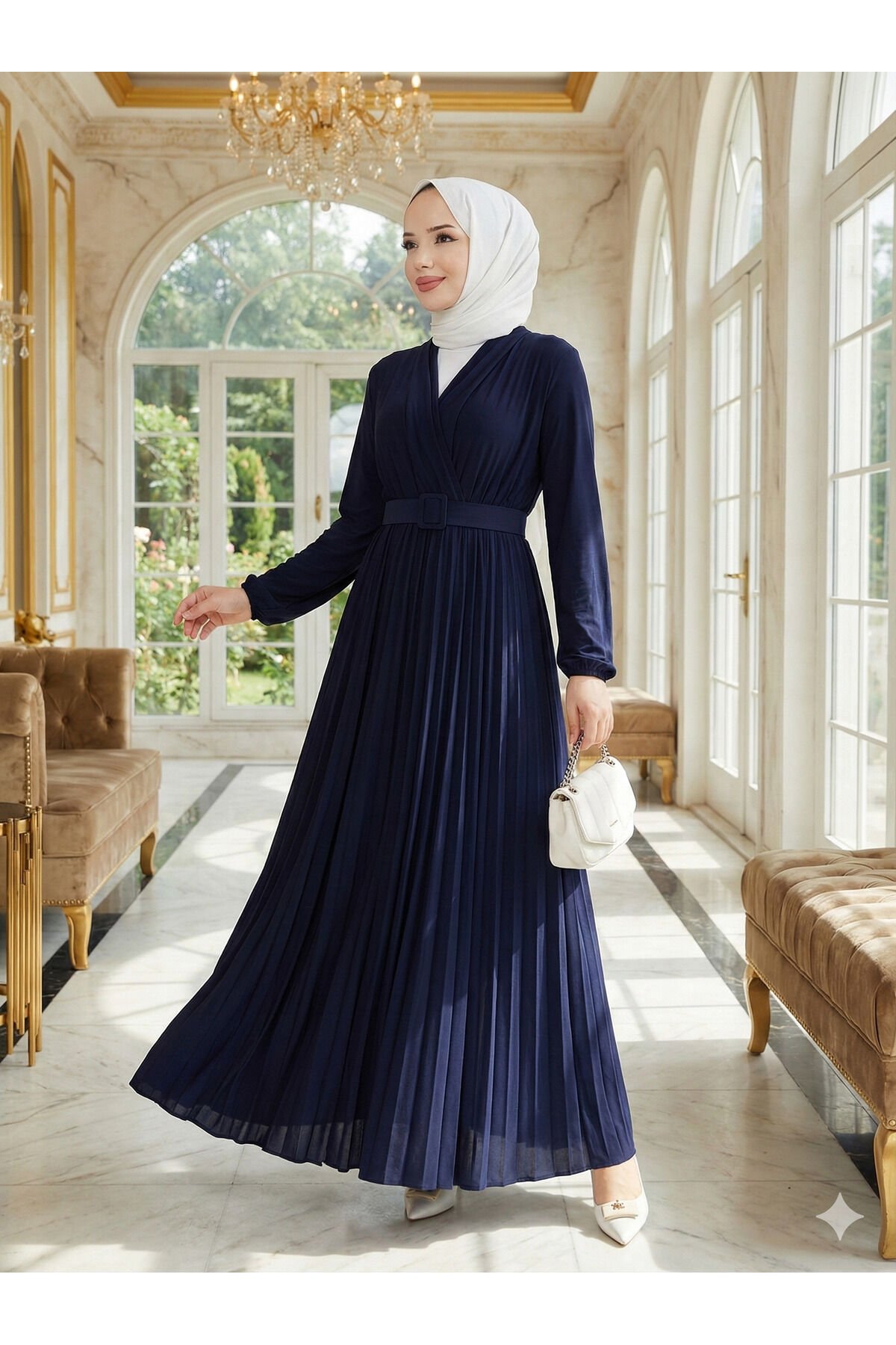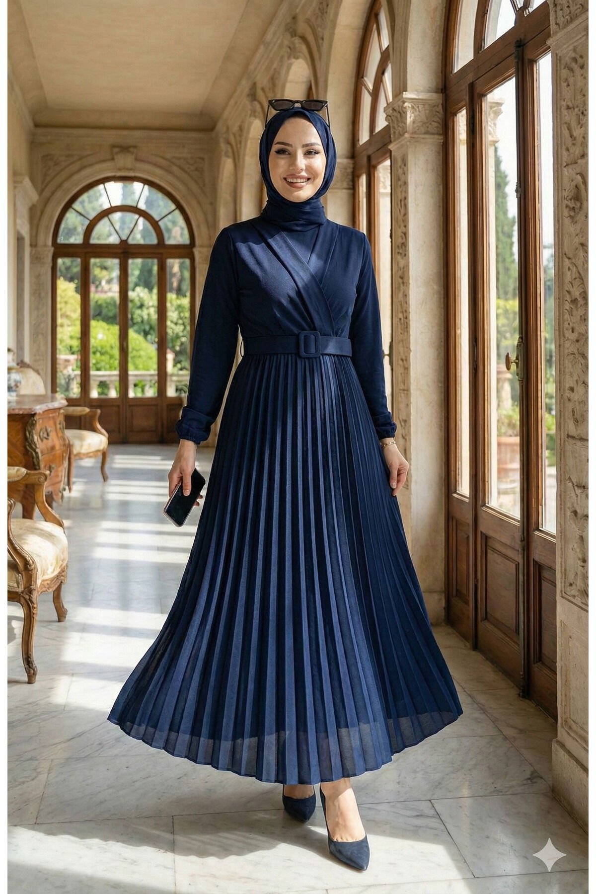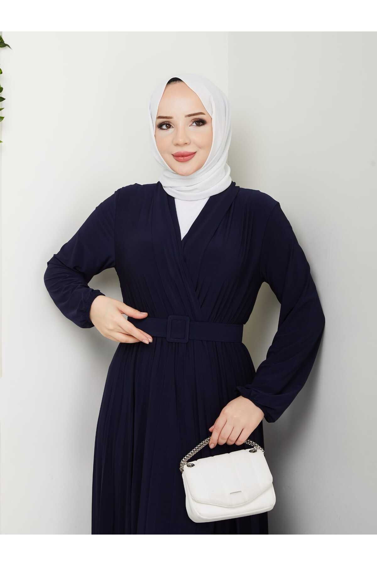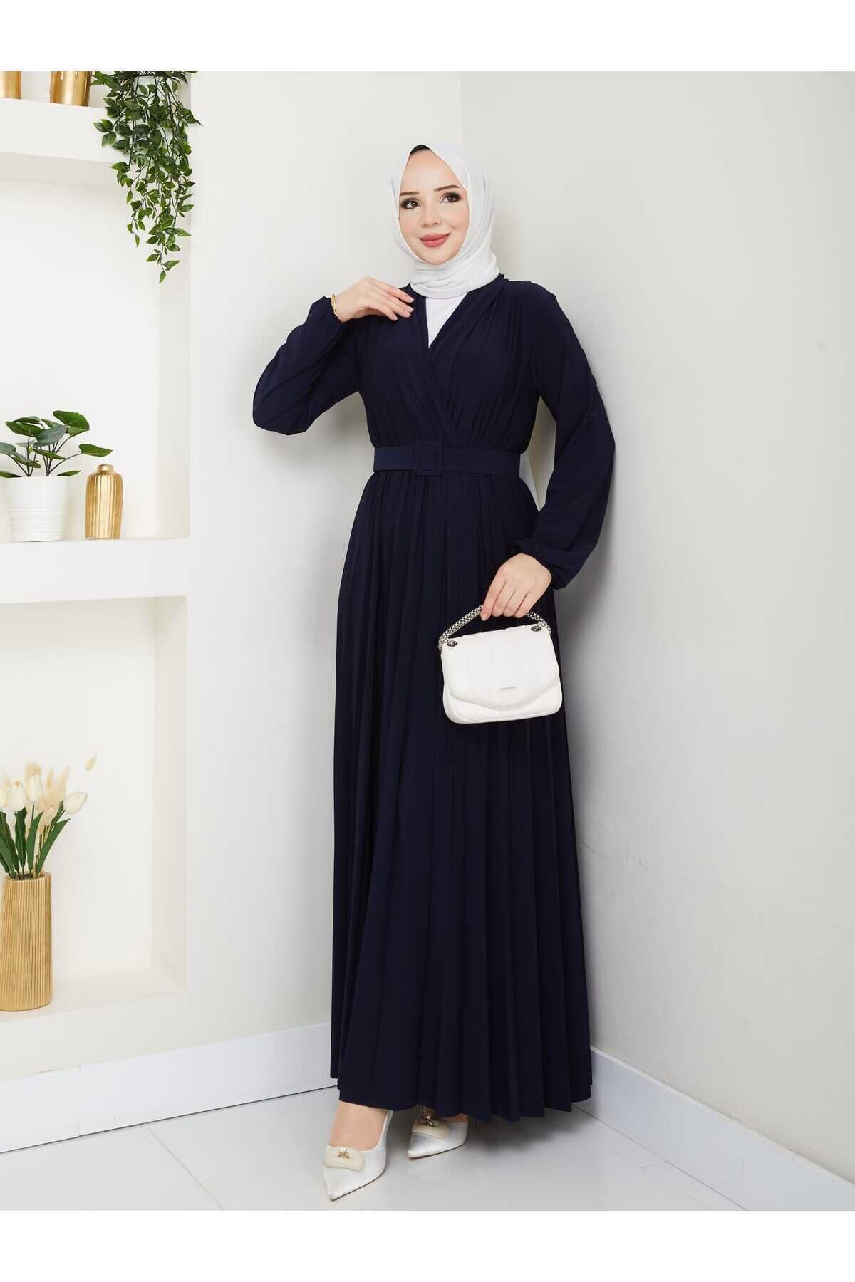 Kadın Sandy Bordo Önü Kruvaze Detaylı Eteği Piliseli Kemerli Boydan Tesettür Elbise Laci̇vert - 46