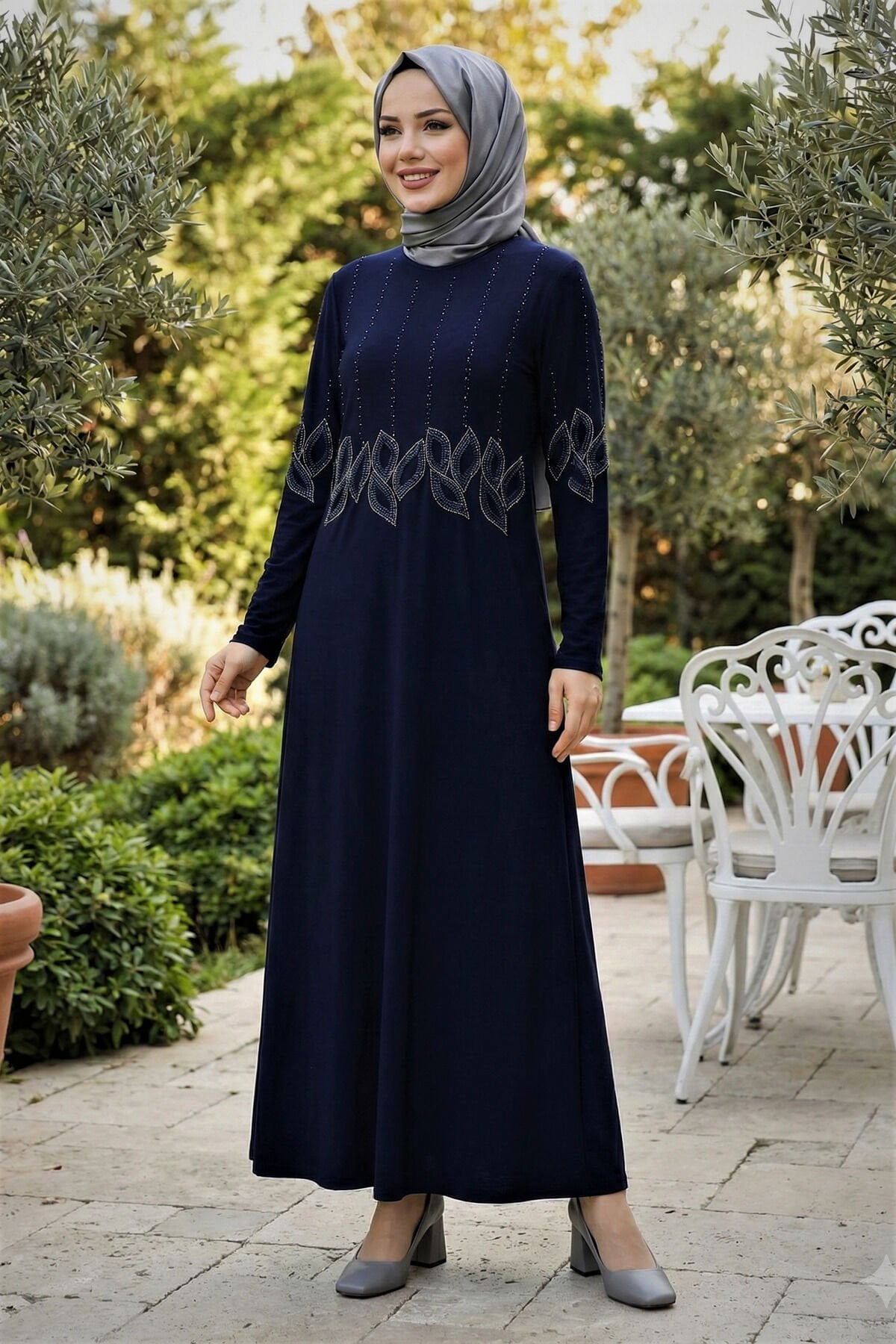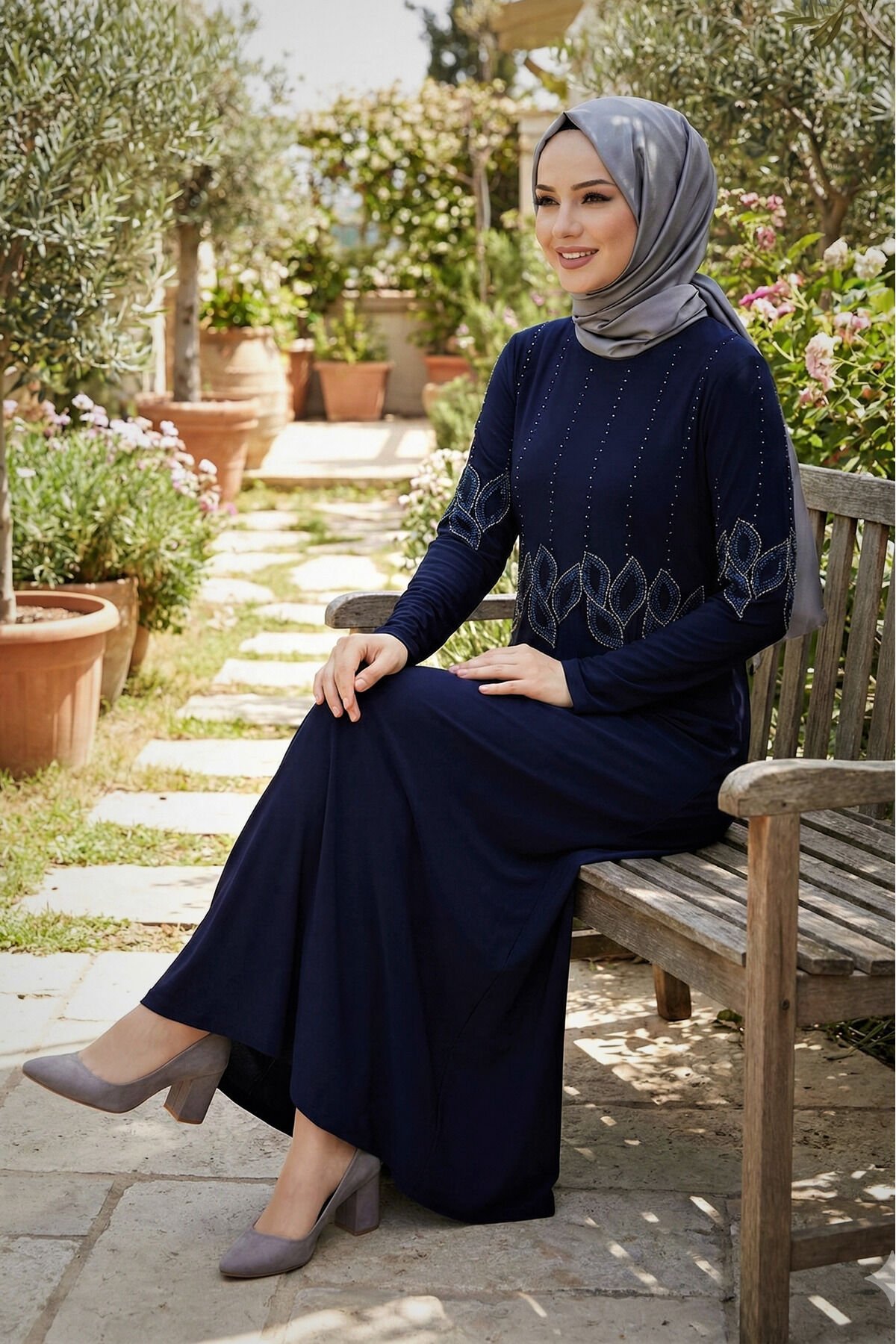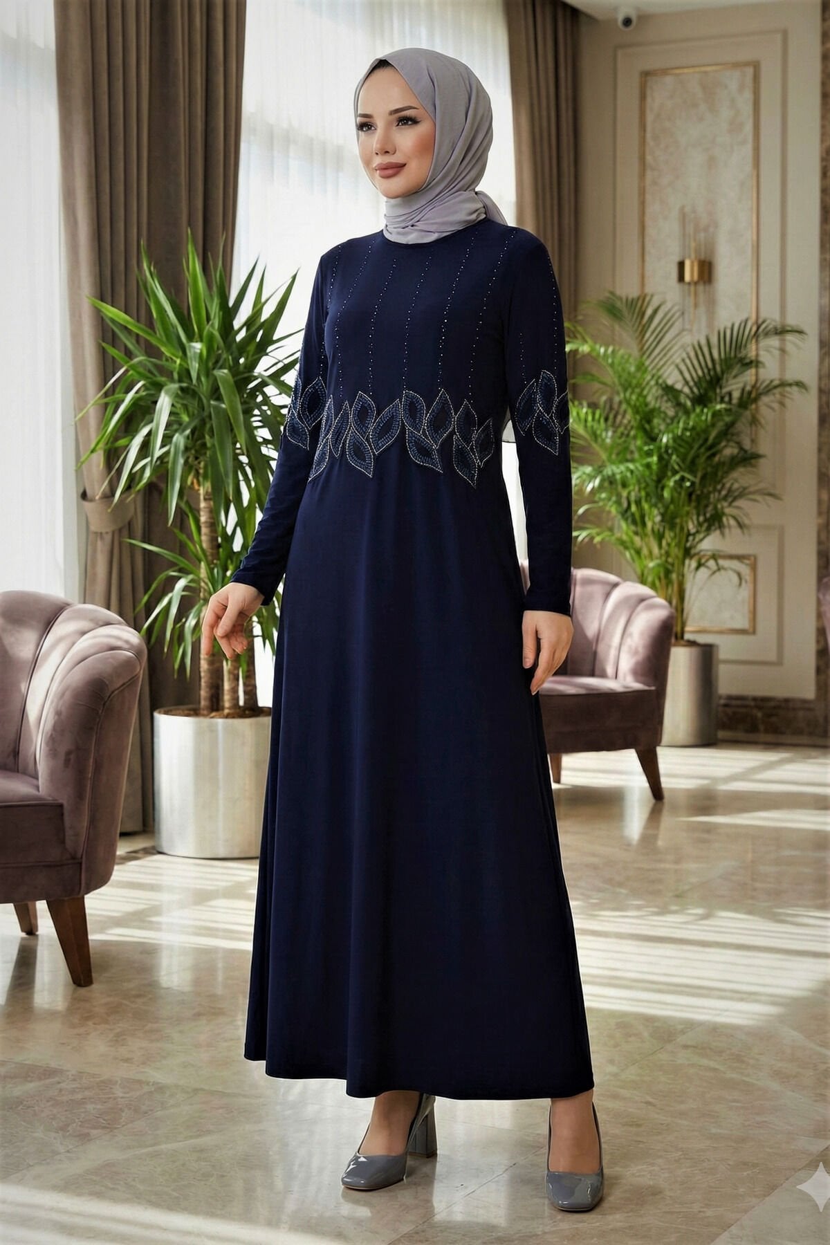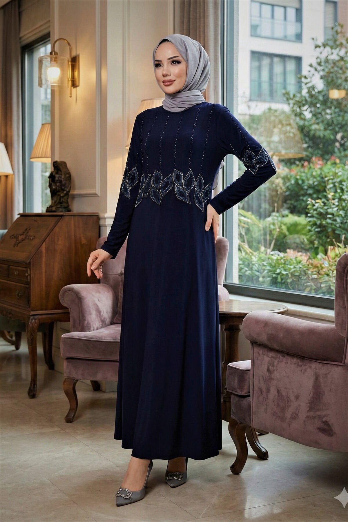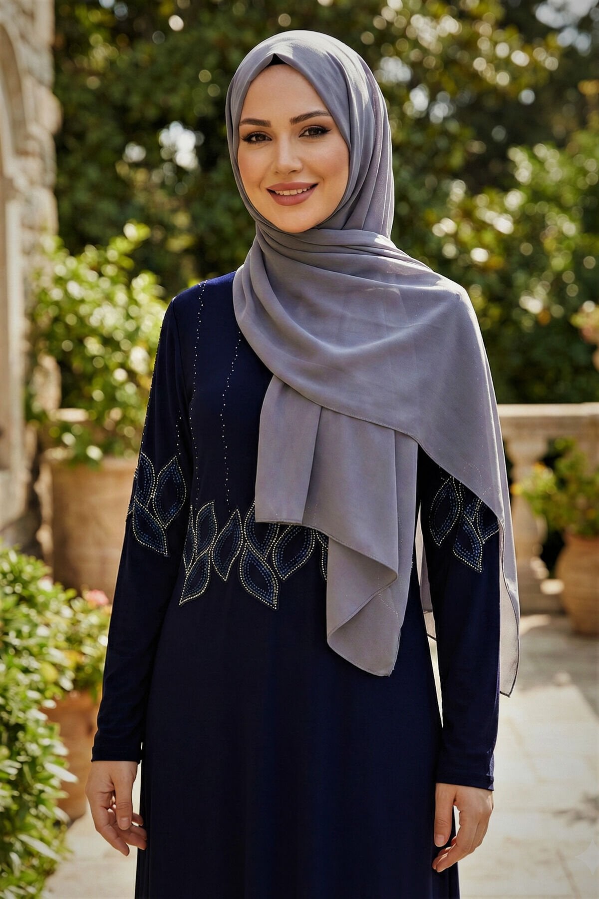 Kadın siyah Sandy Büyük Beden Boydan Abiye Önü Ve Kolları Taş Detaylı Tesettür Elbise Lacivert - 46