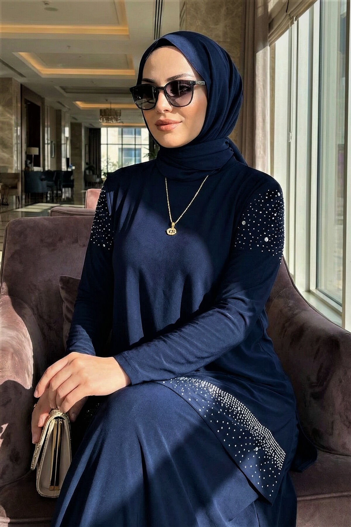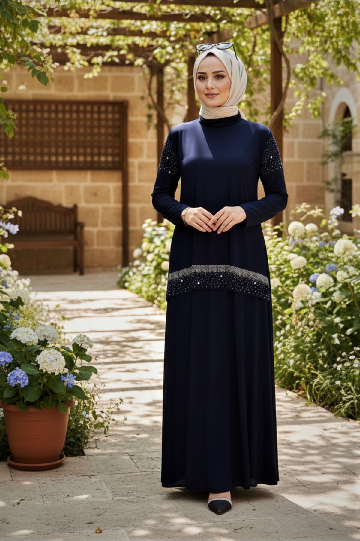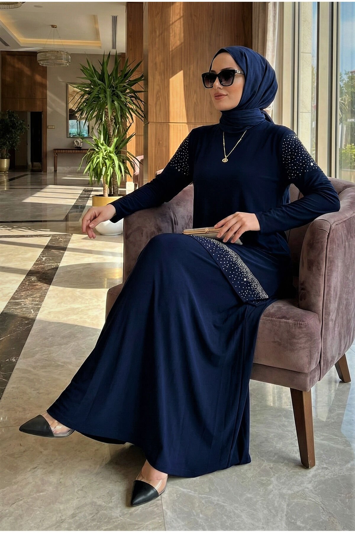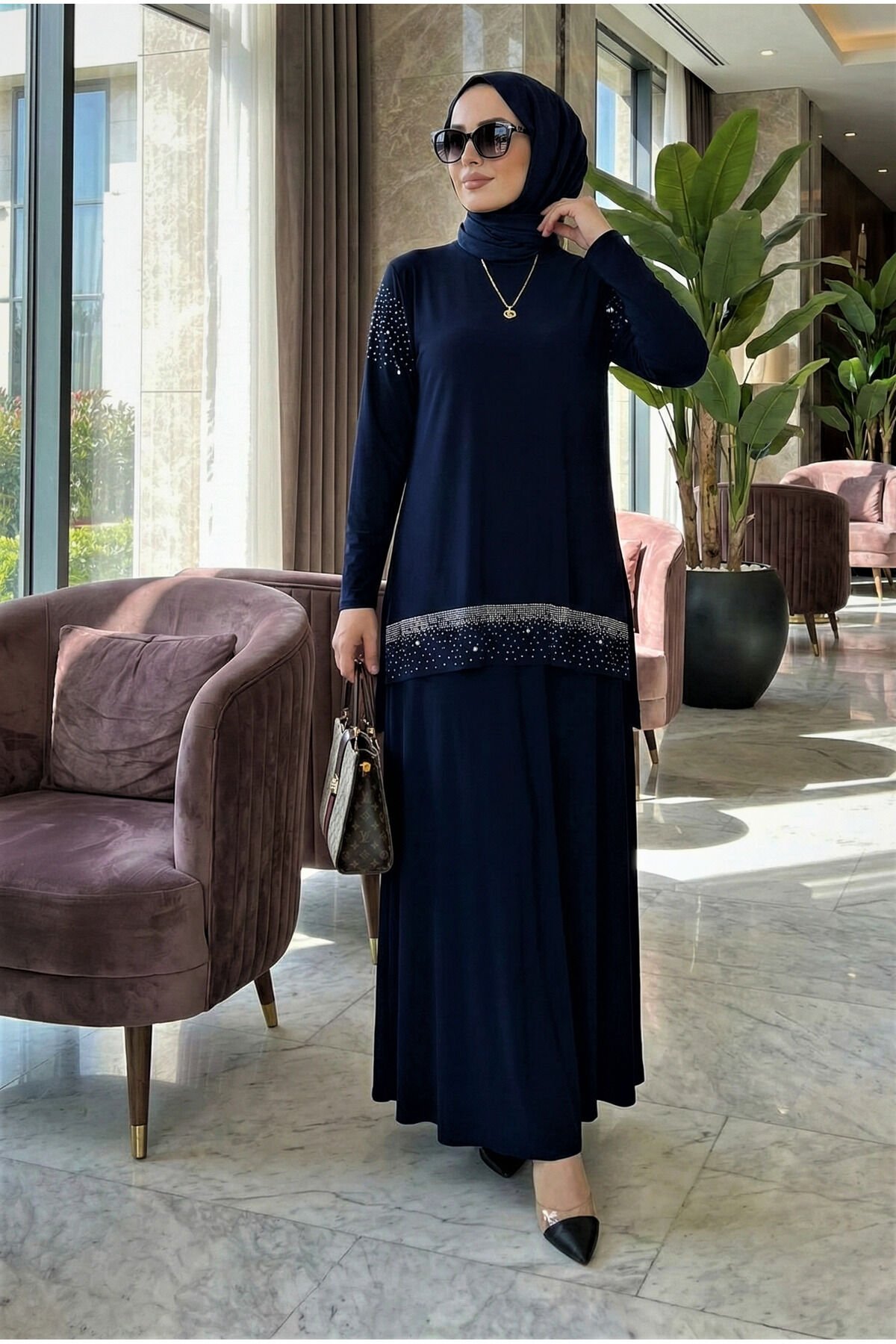 KADIN SANDY LACİVERT ÖNÜ VE KOLLARI TAŞLI 2Lİ BLUZ ETEK PİLİSELİ İKİLİ TESETTÜR ETEKLİ TAKIM Lacivert - 50