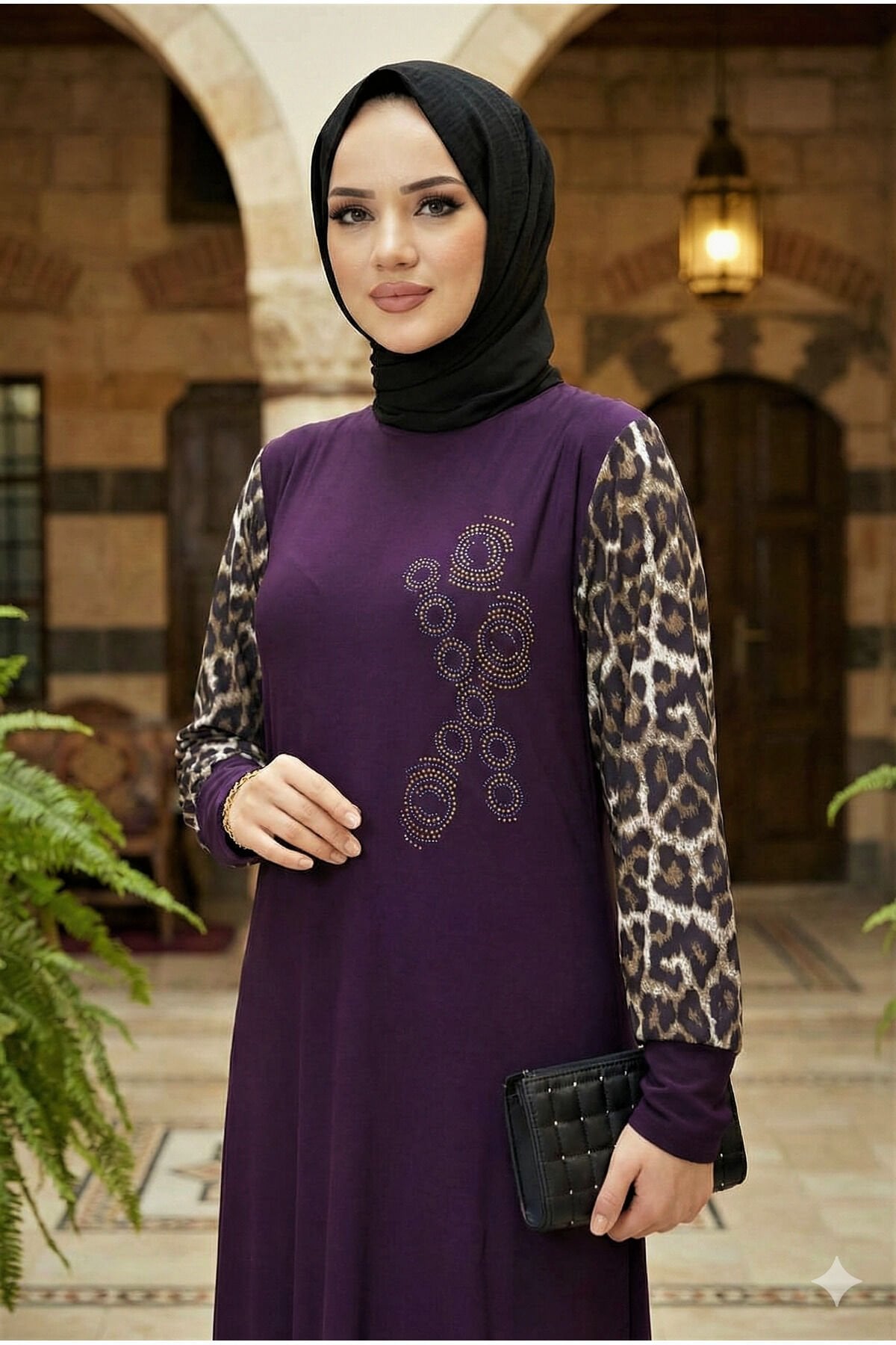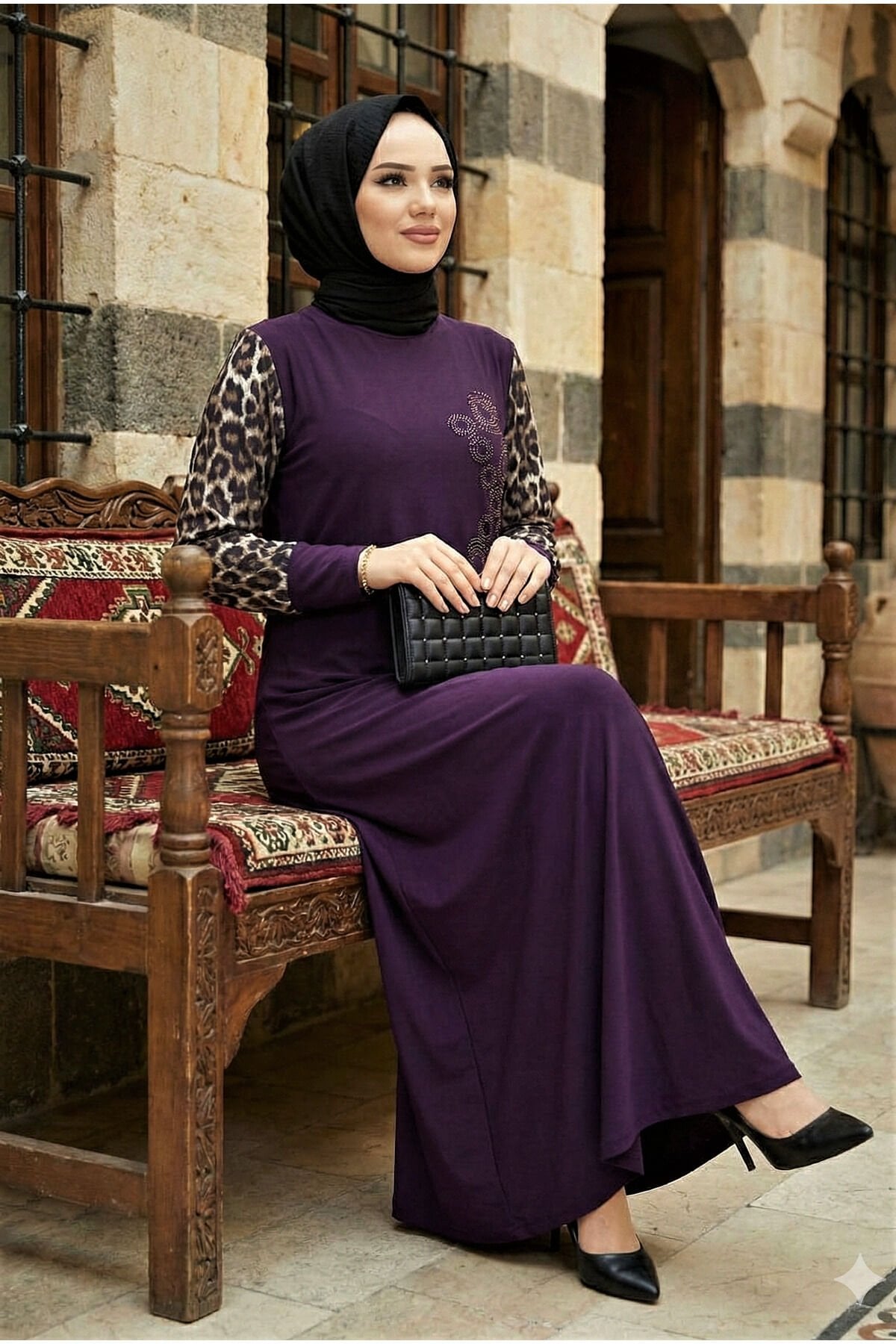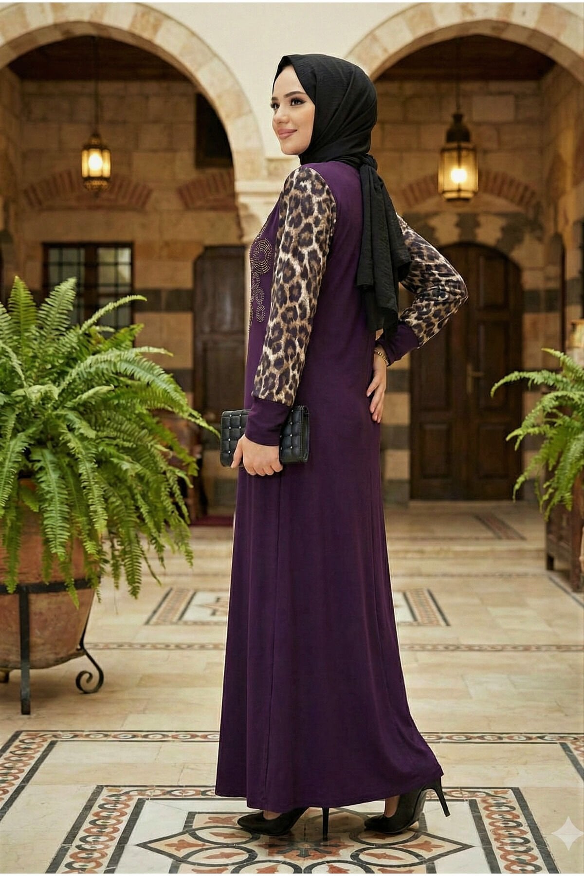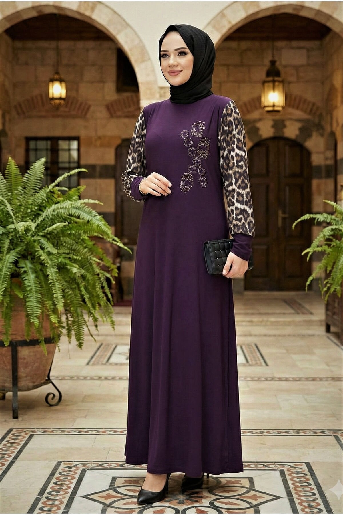 Kadın Mor Sandy Boydan Taşlı Kolları Ve Eteği Leopar Garnili Tesettür Elbise Mor - 42