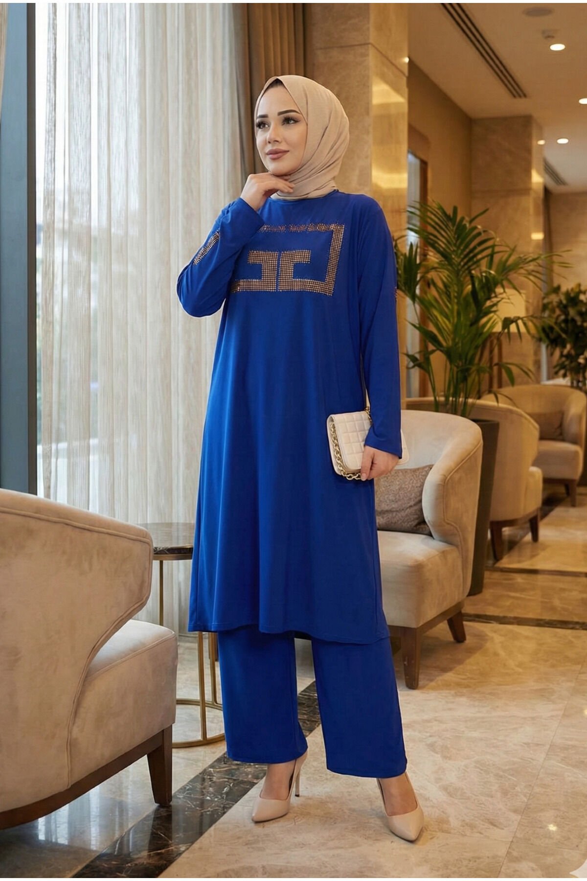 - Bol kesimi ile rahat hareket etme özgürlüğü sunan tunik-pantolon ikili tesettür pantolonlu takım, günlük kullanım için idealdir.; - Uzun boy tasarımı sayesinde şıklığı ve konforu bir arada yaşatır; yüksek bel kesimiyle modern bir siluet oluşturur.; - Lastikli bel detayı hem pratiklik sağlar hem de farklı vücut tiplerine uyum sağlayacak esneklik sunar.; - Astarsız yapısıyla hafif ve nefes alabilen bir yapıya sahiptir; yaz aylarında serin tutar.; - Düz deseniyle sade ve zamansız bir görünüm elde ederken, taş işlemeli detaylarıyla göz alıcı bir stil kazandırır.; - Viskon karışımlı materyali yumuşak dokusuyla cildinize nazikçe dokunur ve uzun süreli giyimde bile konforlu hissetmenizi sağlar.; - İnce yapısıyla mevsim geçişlerinde ideal tercih olan bu takım, bol paça tasarımının sunduğu rahatlıkla dikkat çeker.; - Bisiklet yakası sayesinde zarif bir boynuz çizgisi sunarken, kapamasız oluşu kolay kombin imkanları tanır.; - Tesettür giyim koleksiyonuna özel olarak tasarlanmıştır; her ortamda şık ve özenli görünmenizi sağlar.; - Lacivert rengiyle asaleti yansıtan bu takım, gardrobunuzdaki çok yönlülük ihtiyacını karşılar.; - Sürdürülebilirlik bilinciyle üretilmiş malzemelerden oluşan bu ürün, çevreye duyarlı seçim yapmak isteyenler için uygundur.; - Kapamasız tasarımının yanında beli lastikli olması sayesinde gün boyu rahatlıkla kullanılabilir; her bedene uygunluk gösterir.; - 2'li paket içeriğiyle hem tunik hem de pantolon ihtiyacınızı tek seferde karşılar; pratikliği ön planda tutar.; - Sandy dokuma tipinin sunduğu dayanıklılık ile uzun süreli kullanım vaat eder; kaliteyi hissettiren detaylarıyla ön plana çıkartır.- Bol kesimi ile rahat hareket etme özgürlüğü sunan tunik-pantolon ikili tesettür pantolonlu takım, günlük kullanım için idealdir.; - Uzun boy tasarımı sayesinde şıklığı ve konforu bir arada yaşatır; yüksek bel kesimiyle modern bir siluet oluşturur.; - Lastikli bel detayı hem pratiklik sağlar hem de farklı vücut tiplerine uyum sağlayacak esneklik sunar.; - Astarsız yapısıyla hafif ve nefes alabilen bir yapıya sahiptir; yaz aylarında serin tutar.; - Düz deseniyle sade ve zamansız bir görünüm elde ederken, taş işlemeli detaylarıyla göz alıcı bir stil kazandırır.; - Viskon karışımlı materyali yumuşak dokusuyla cildinize nazikçe dokunur ve uzun süreli giyimde bile konforlu hissetmenizi sağlar.; - İnce yapısıyla mevsim geçişlerinde ideal tercih olan bu takım, bol paça tasarımının sunduğu rahatlıkla dikkat çeker.; - Bisiklet yakası sayesinde zarif bir boynuz çizgisi sunarken, kapamasız oluşu kolay kombin imkanları tanır.; - Tesettür giyim koleksiyonuna özel olarak tasarlanmıştır; her ortamda şık ve özenli görünmenizi sağlar.; - Lacivert rengiyle asaleti yansıtan bu takım, gardrobunuzdaki çok yönlülük ihtiyacını karşılar.; - Sürdürülebilirlik bilinciyle üretilmiş malzemelerden oluşan bu ürün, çevreye duyarlı seçim yapmak isteyenler için uygundur.; - Kapamasız tasarımının yanında beli lastikli olması sayesinde gün boyu rahatlıkla kullanılabilir; her bedene uygunluk gösterir.; - 2'li paket içeriğiyle hem tunik hem de pantolon ihtiyacınızı tek seferde karşılar; pratikliği ön planda tutar.; - Sandy dokuma tipinin sunduğu dayanıklılık ile uzun süreli kullanım vaat eder; kaliteyi hissettiren detaylarıyla ön plana çıkartır.