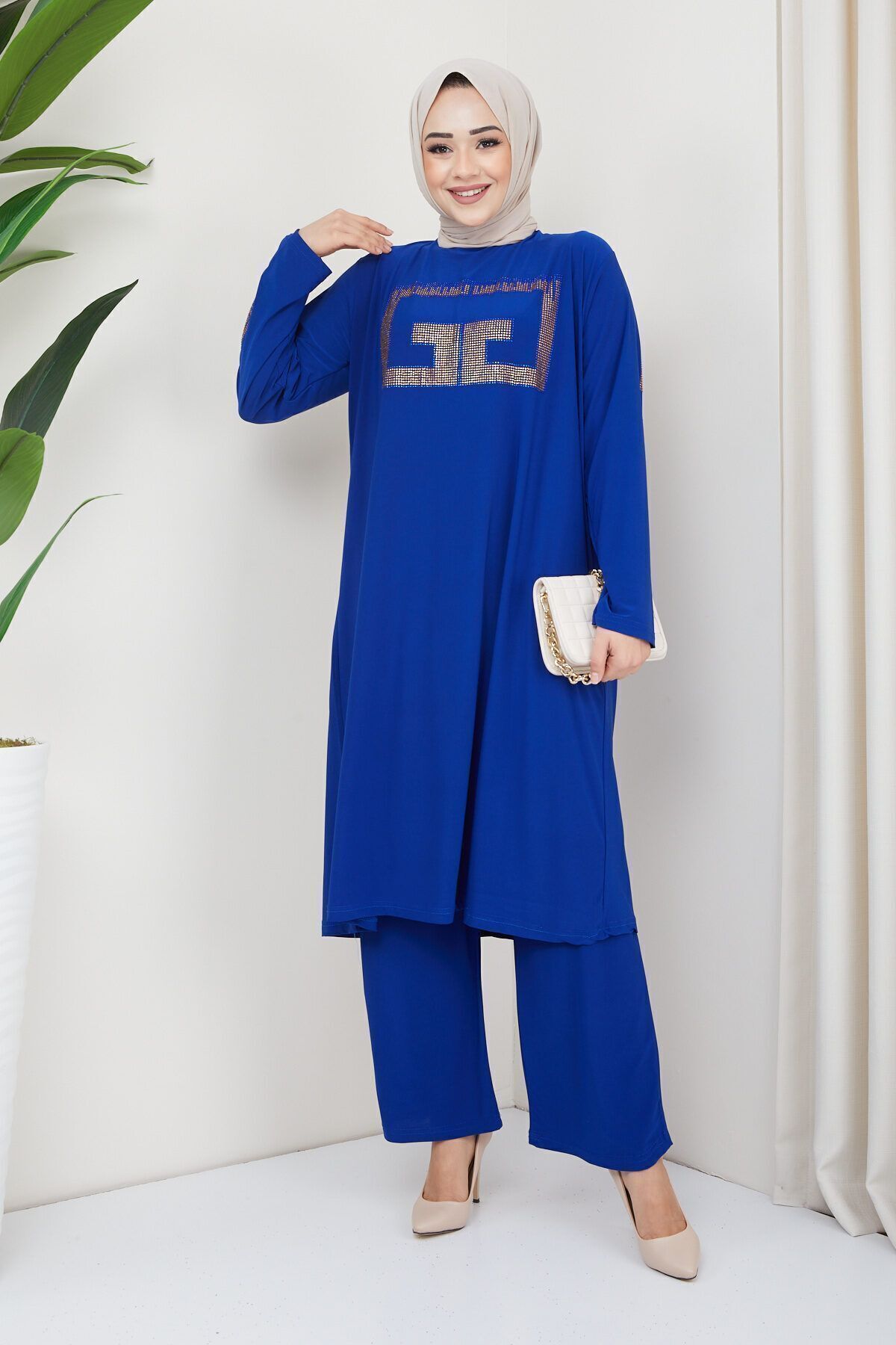 Kadın Saks Mavi Sandy İkili Tesettür Pantolonlu Takım Saks - 42