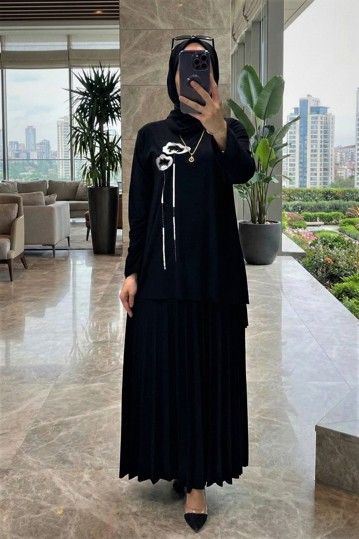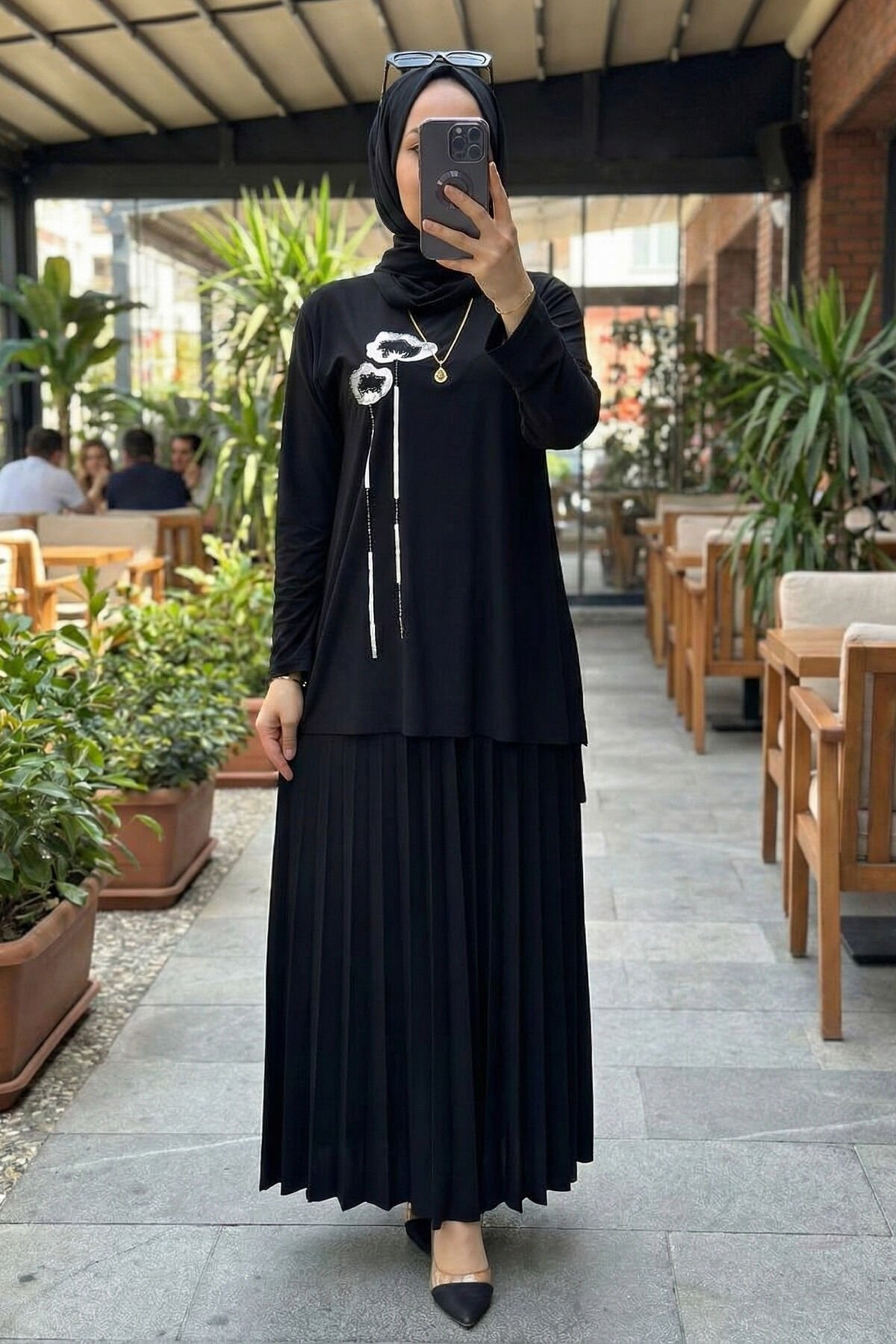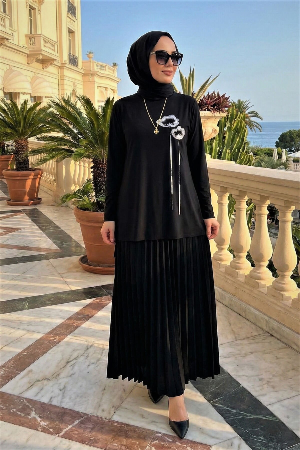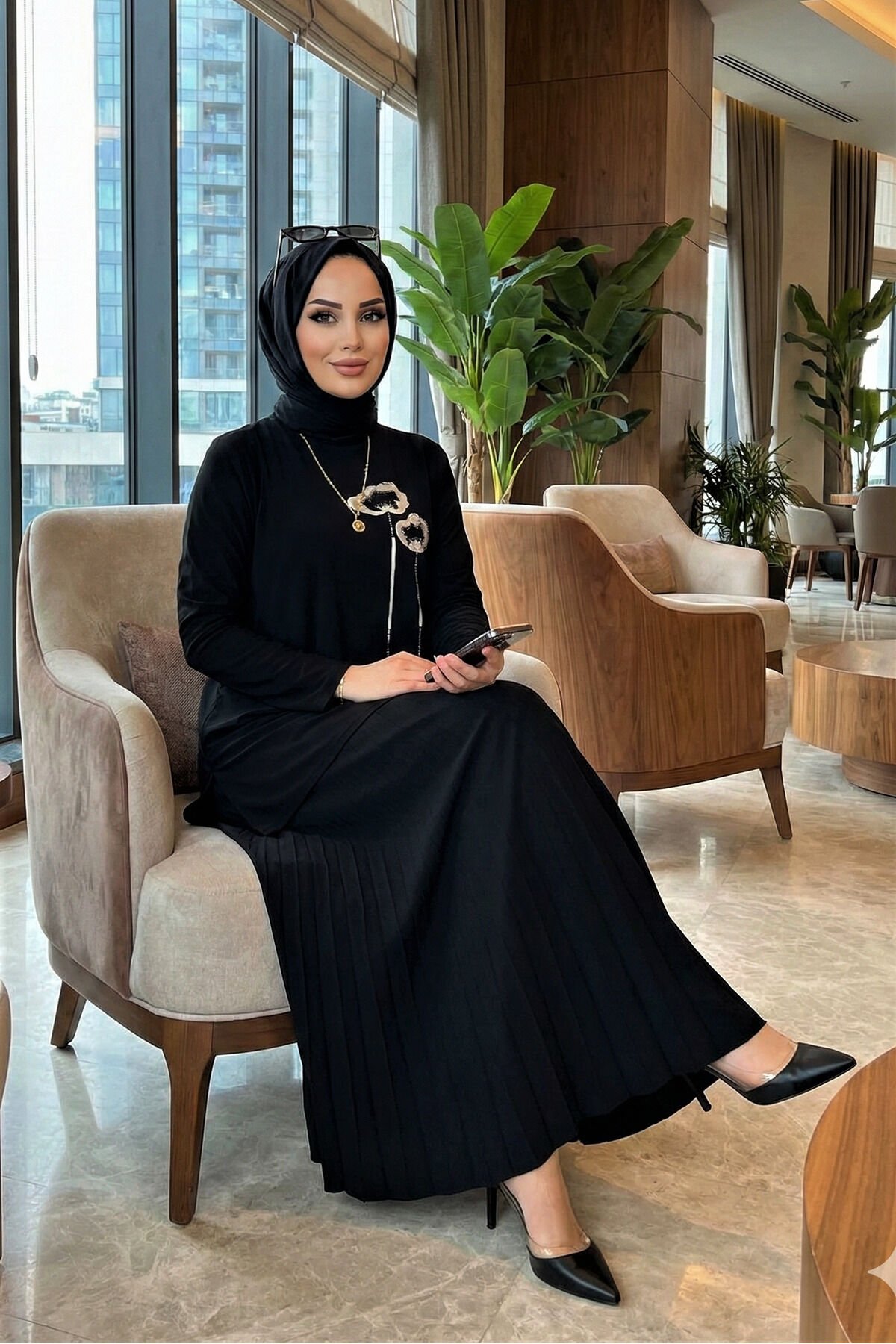 Kadın Sandy Siyah tarz özel davet anne Büyük Beden Piliseli İkili Tesettür Etekli Takım Si̇yah - 42
