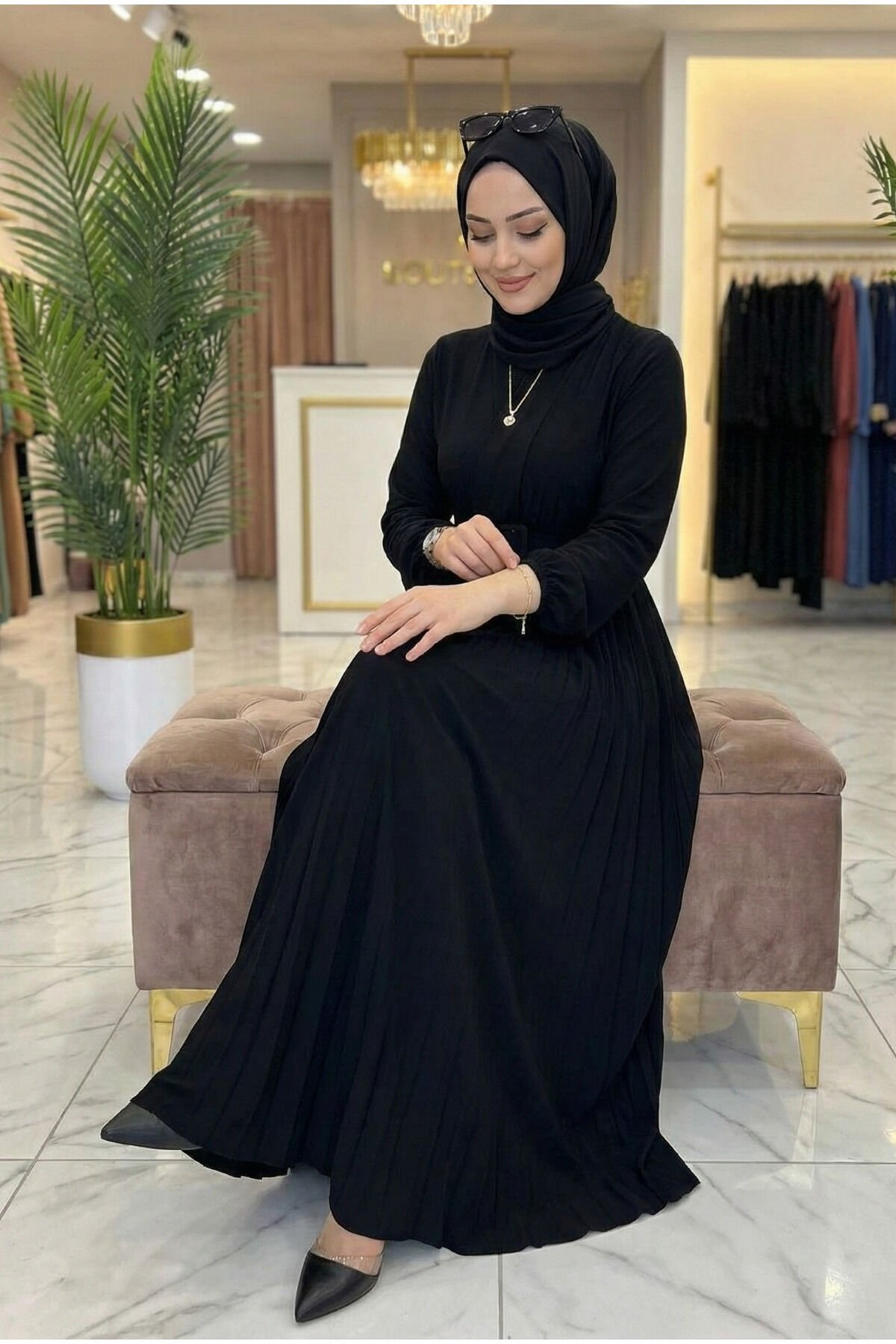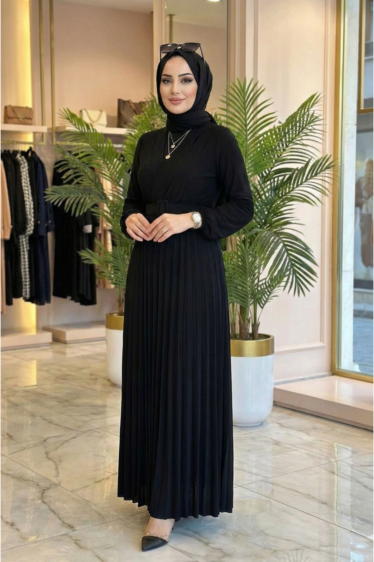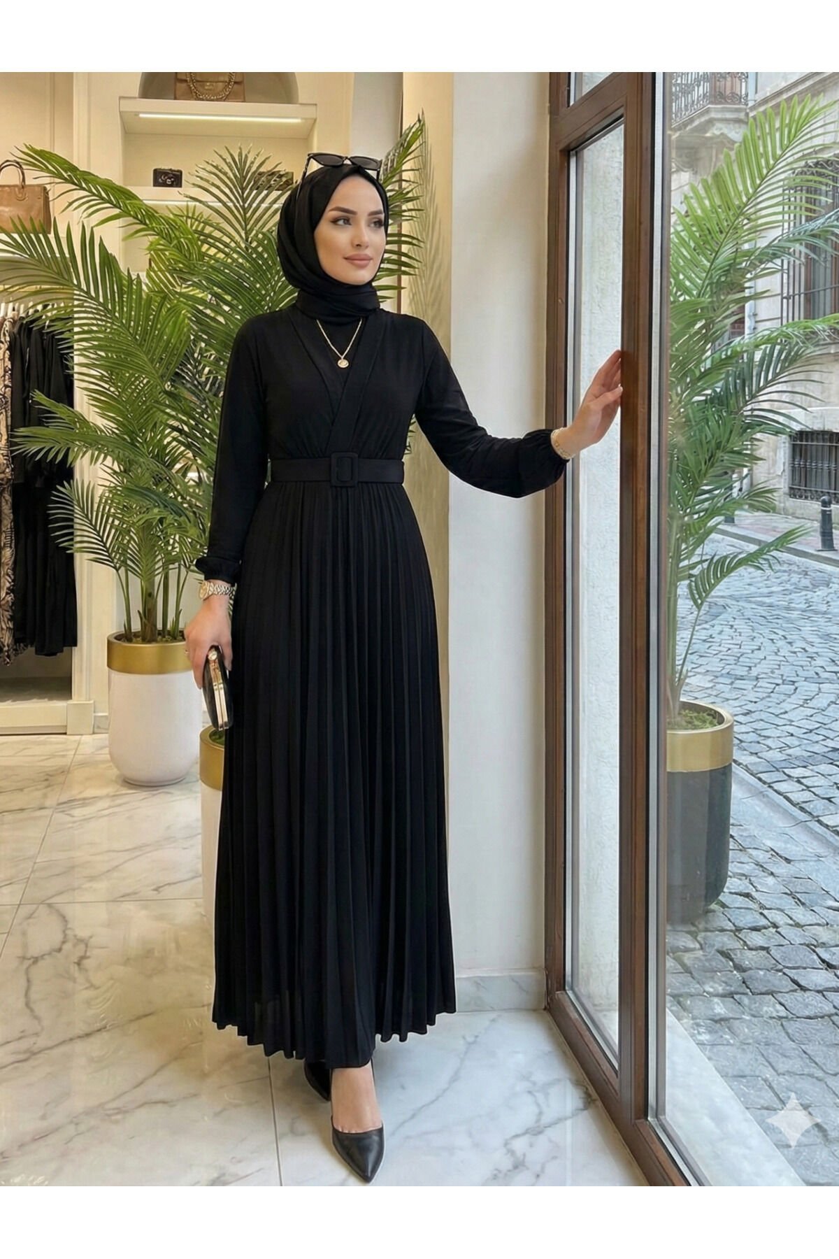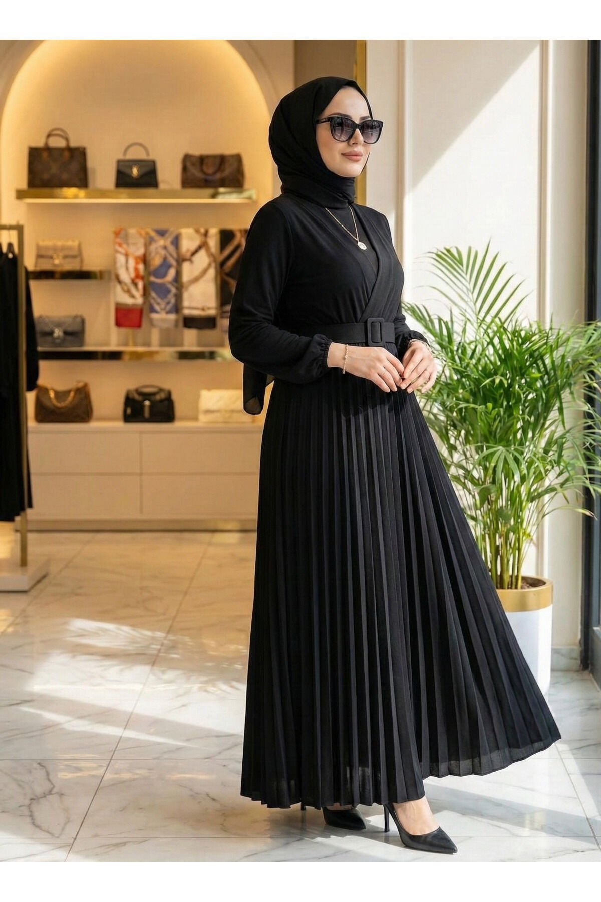 Kadın Sandy Bordo Önü Kruvaze Detaylı Eteği Piliseli Kemerli Boydan Tesettür Elbise Si̇yah - 44