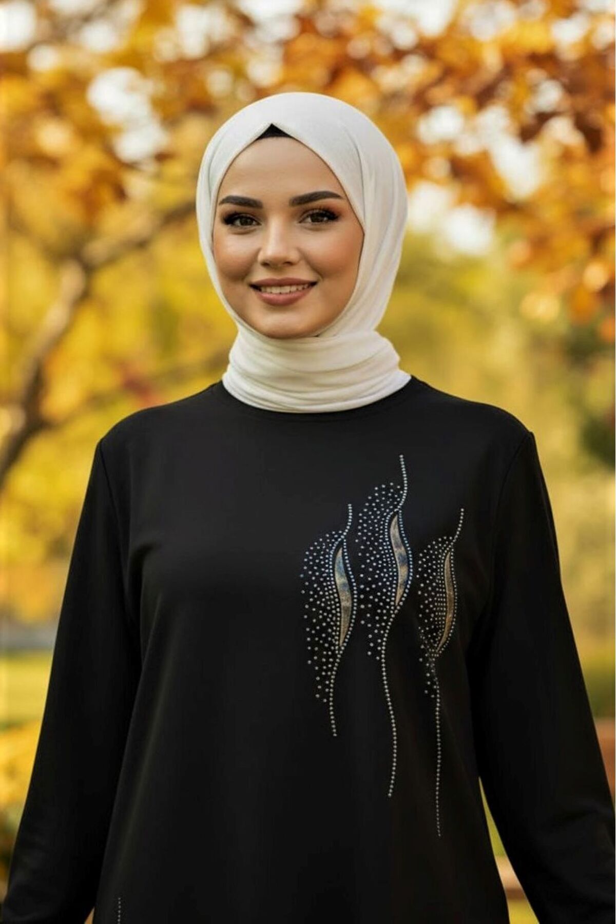 Kadın Kahve Kristal Pamuk Büyük Beden Önü Aplike ve DMS Taş detaylı Tesettür Tunik Si̇yah - 56