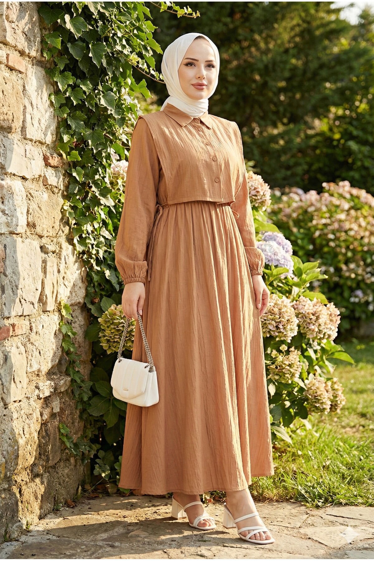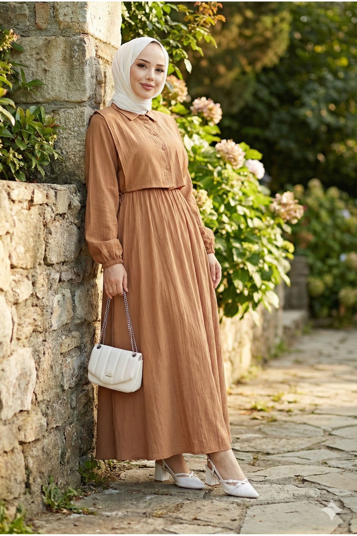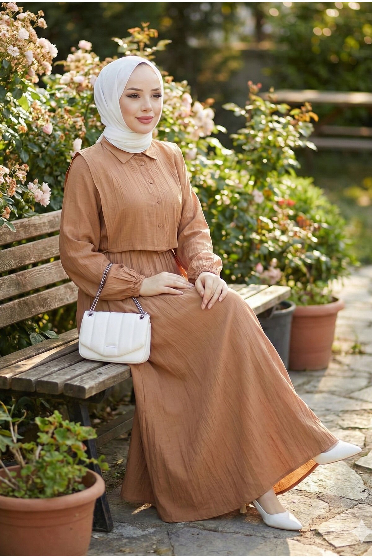 Kadın Taba Gömlek Yaka rahat kalıp Düğmeli Belden Büzgülü çilek Kumaş Tesettür elbise Taba - 48
