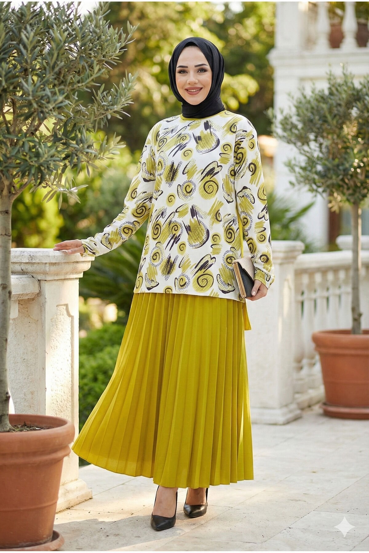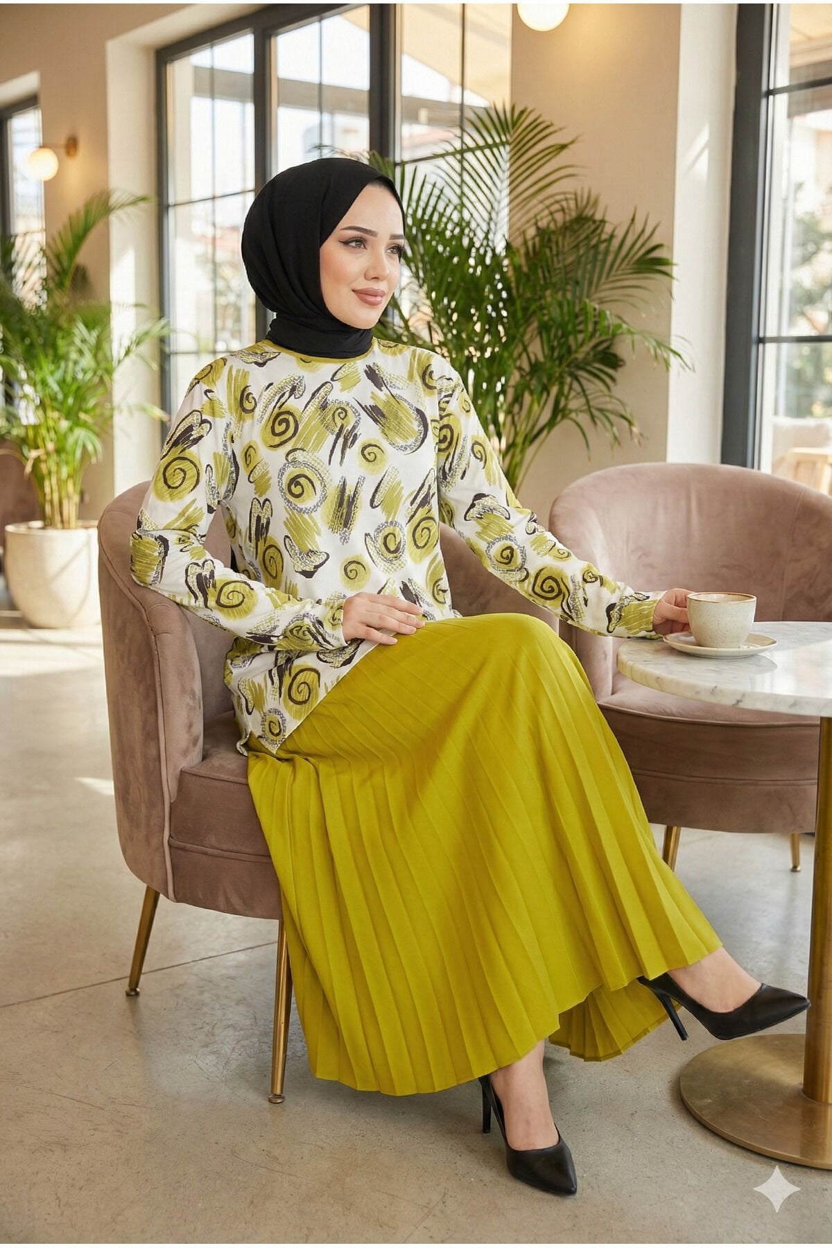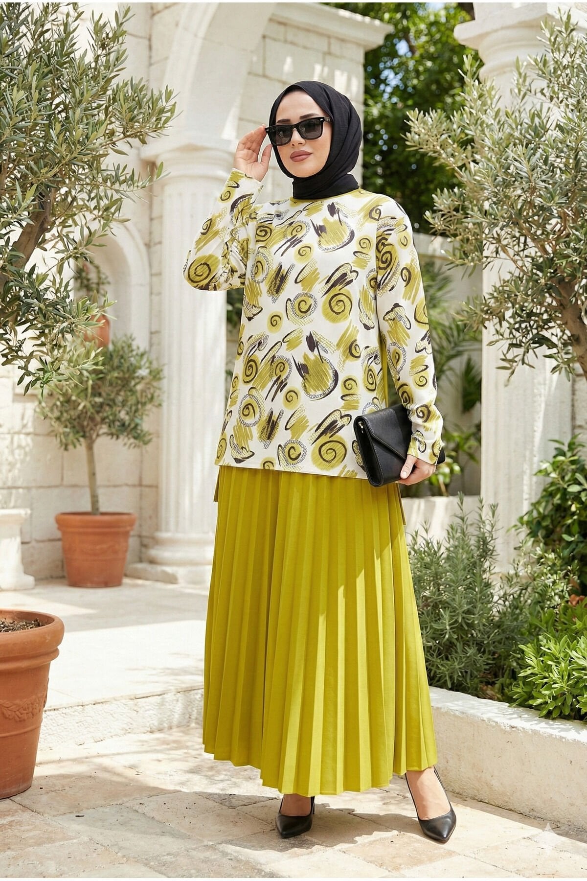 Kadın Sandy vişne Dijital Baskı Bluz Pilise Etek İkili Etekli Takım Yağyeşi̇l - 42