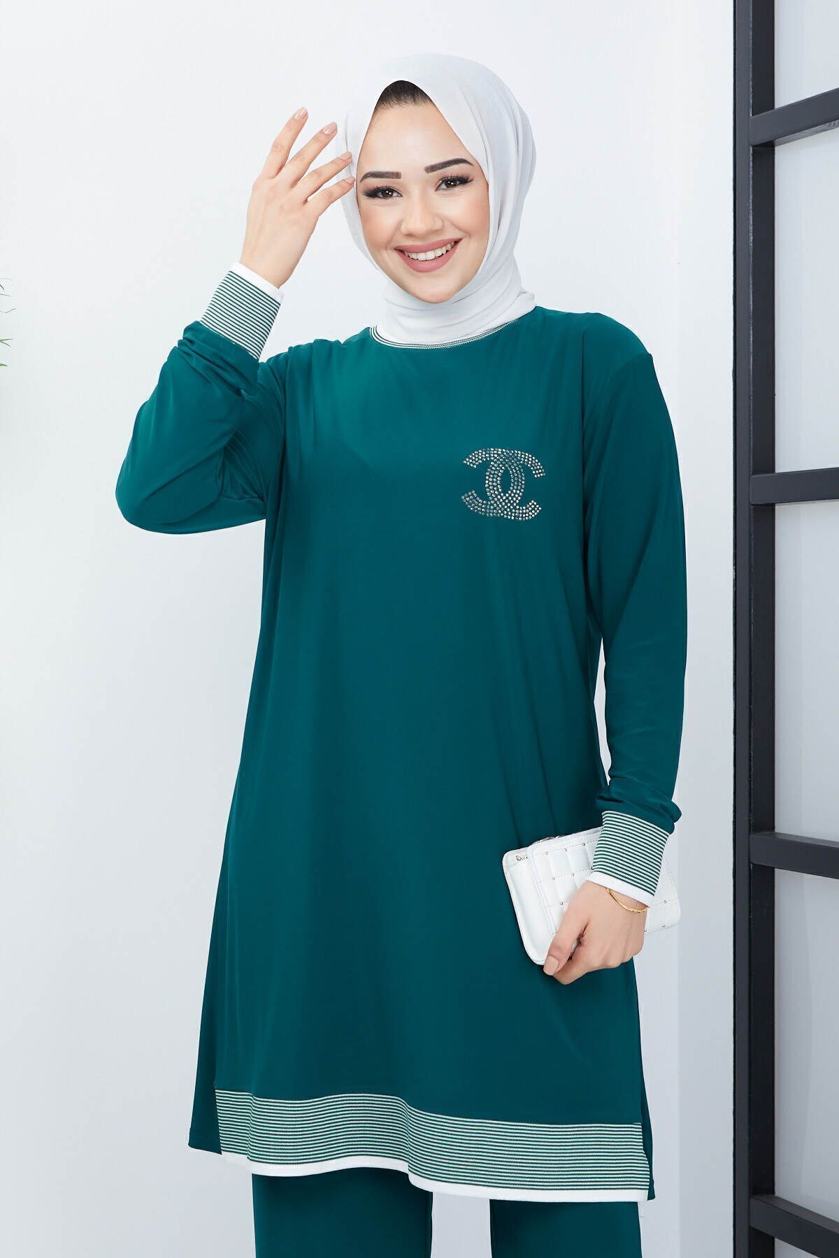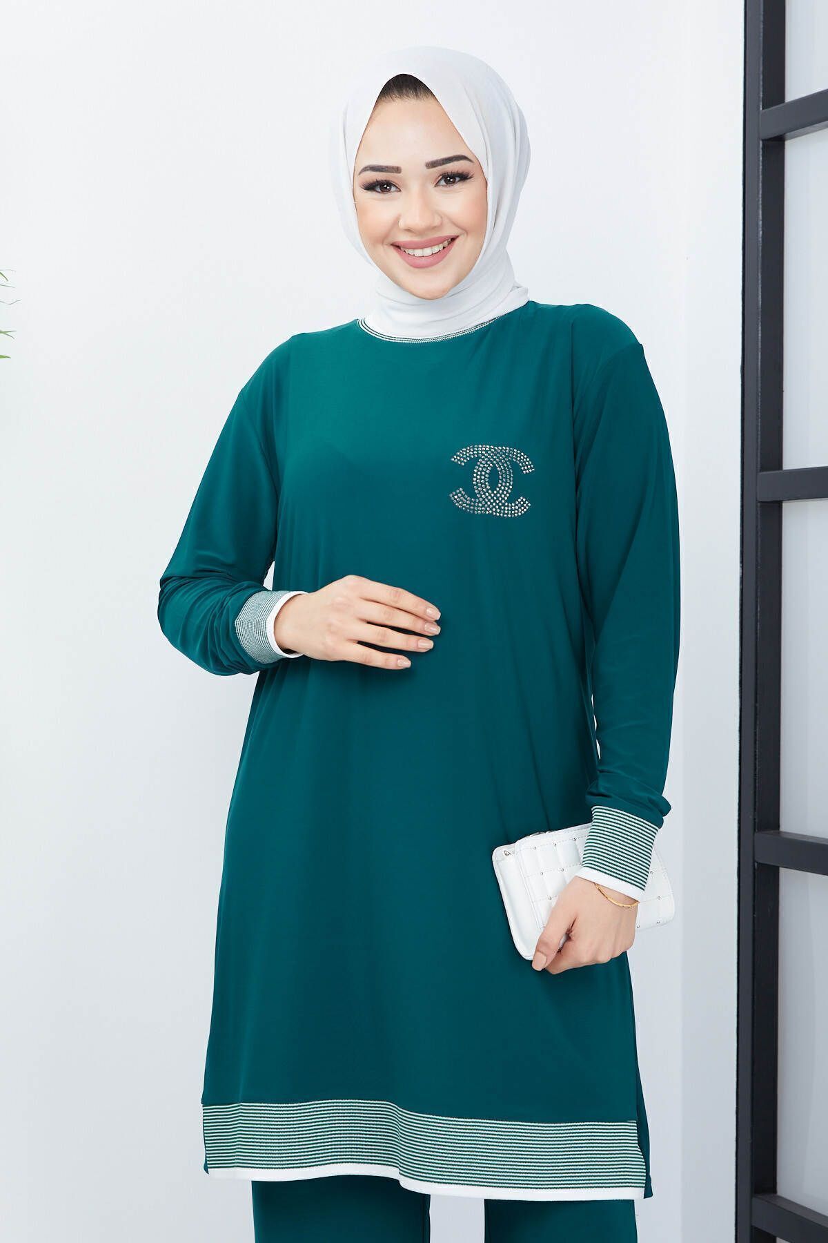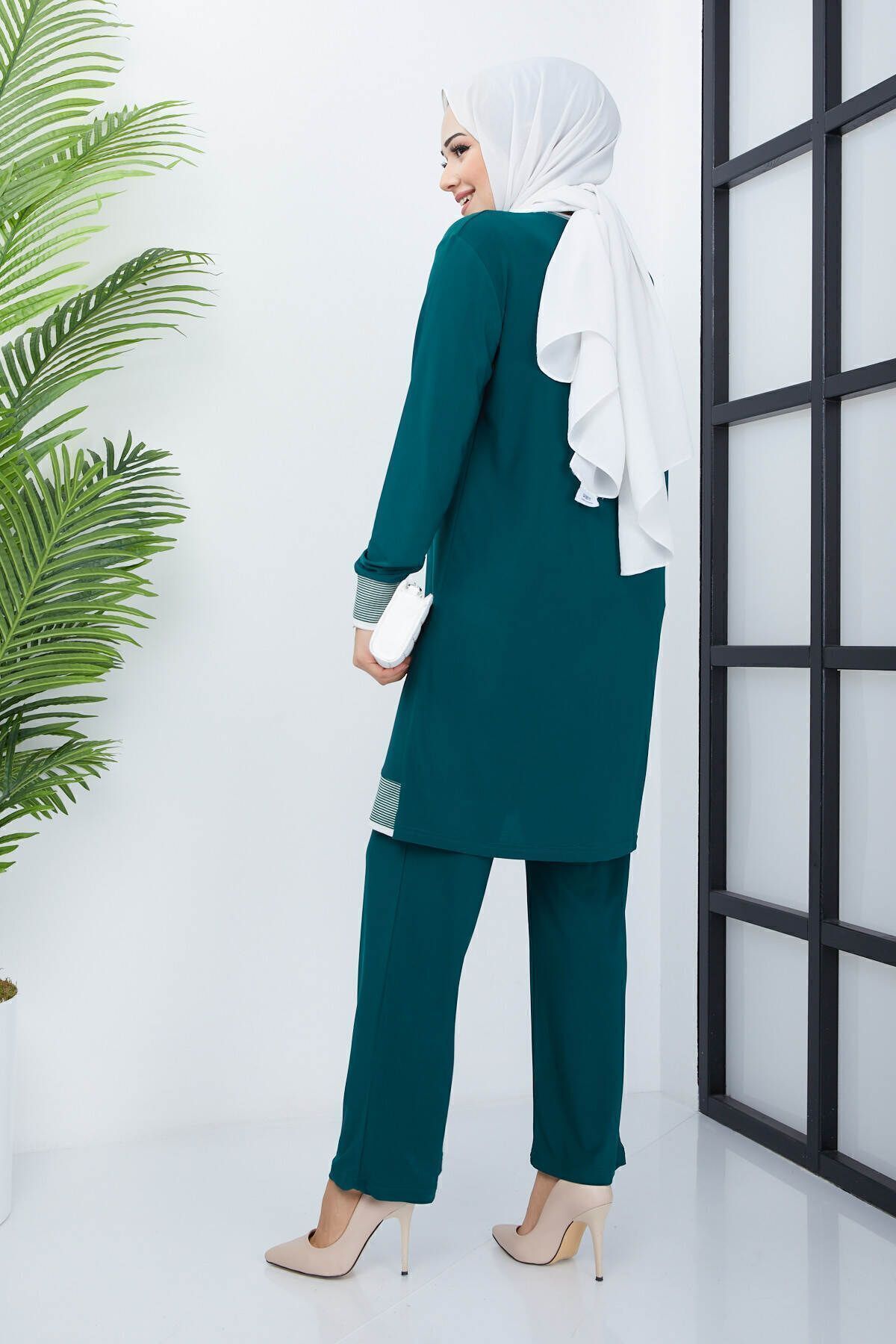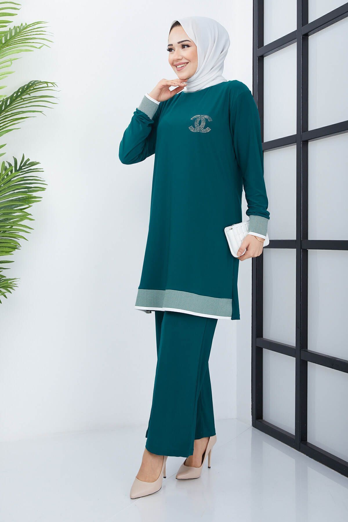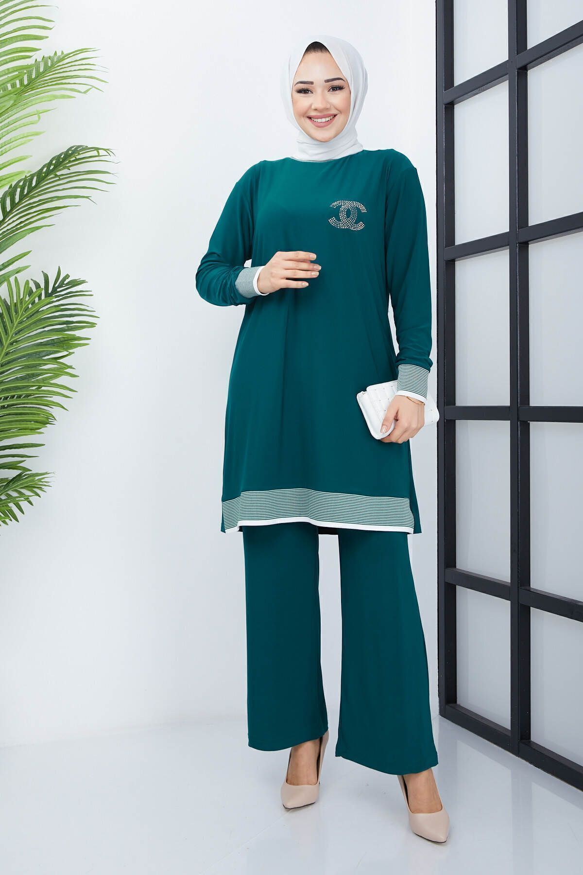 - Zümrüt yeşili renkteki bu ikili tesettür pantolonlu takım, yaz aylarında rahatlıkla tercih edebileceğiniz şık ve konforlu bir seçenektir.; - Bol kesimi sayesinde gün boyu hareket özgürlüğü sunar ve vücut hatlarınıza uyum sağlayarak rahat bir kullanım imkanı tanır.; - Viskon karışımlı kumaşı ile yumuşak dokusu ve nefes alabilir yapısıyla cildinize nazik davranırken, uzun süreli kullanımlarda bile formunu korur.; - Kapamasız tasarımı ile modern ve minimalist bir görünüm sunarken, lastik detaylarıyla pratik kullanım sağlar.; - Bisiklet yakası sayesinde sade ve zarif bir stil yaratırken, tunik ve pantolon kombinasyonu ile kolayca şık kombinler oluşturabilirsiniz.; - Yüksek bel tasarımı hem konforlu bir oturuş sağlar hem de vücut hatlarınıza mükemmel uyum göstererek feminen bir siluet çizer.; - Casual ortamlarda günlük kullanım için ideal olan bu takım, casual giyim tarzını benimseyenler için mükemmel bir tercihtir.; - Cepsiz yapısıyla minimalist detaylara sahip olan bu ikili tesettür pantolonlu takım, modern çizgilerle geleneksel tesettür giyimi harmanlamaktadır.; - Lastikli paça tipi sayesinde ayakkabılara kolayca yer açarken aynı zamanda şık bir görünüm kazandırır.; - İnce yapısıyla yaz aylarında serin tutan bu takım, sıcak günlerde ideal bir alternatif sunar.; - Tesettür giyim koleksiyonuna özel olarak tasarlanan bu tunikli pantolonlu takım, her gardrobun vazgeçilmez parçalarından birine dönüşüyor.- Zümrüt yeşili renkteki bu ikili tesettür pantolonlu takım, yaz aylarında rahatlıkla tercih edebileceğiniz şık ve konforlu bir seçenektir.; - Bol kesimi sayesinde gün boyu hareket özgürlüğü sunar ve vücut hatlarınıza uyum sağlayarak rahat bir kullanım imkanı tanır.; - Viskon karışımlı kumaşı ile yumuşak dokusu ve nefes alabilir yapısıyla cildinize nazik davranırken, uzun süreli kullanımlarda bile formunu korur.; - Kapamasız tasarımı ile modern ve minimalist bir görünüm sunarken, lastik detaylarıyla pratik kullanım sağlar.; - Bisiklet yakası sayesinde sade ve zarif bir stil yaratırken, tunik ve pantolon kombinasyonu ile kolayca şık kombinler oluşturabilirsiniz.; - Yüksek bel tasarımı hem konforlu bir oturuş sağlar hem de vücut hatlarınıza mükemmel uyum göstererek feminen bir siluet çizer.; - Casual ortamlarda günlük kullanım için ideal olan bu takım, casual giyim tarzını benimseyenler için mükemmel bir tercihtir.; - Cepsiz yapısıyla minimalist detaylara sahip olan bu ikili tesettür pantolonlu takım, modern çizgilerle geleneksel tesettür giyimi harmanlamaktadır.; - Lastikli paça tipi sayesinde ayakkabılara kolayca yer açarken aynı zamanda şık bir görünüm kazandırır.; - İnce yapısıyla yaz aylarında serin tutan bu takım, sıcak günlerde ideal bir alternatif sunar.; - Tesettür giyim koleksiyonuna özel olarak tasarlanan bu tunikli pantolonlu takım, her gardrobun vazgeçilmez parçalarından birine dönüşüyor.