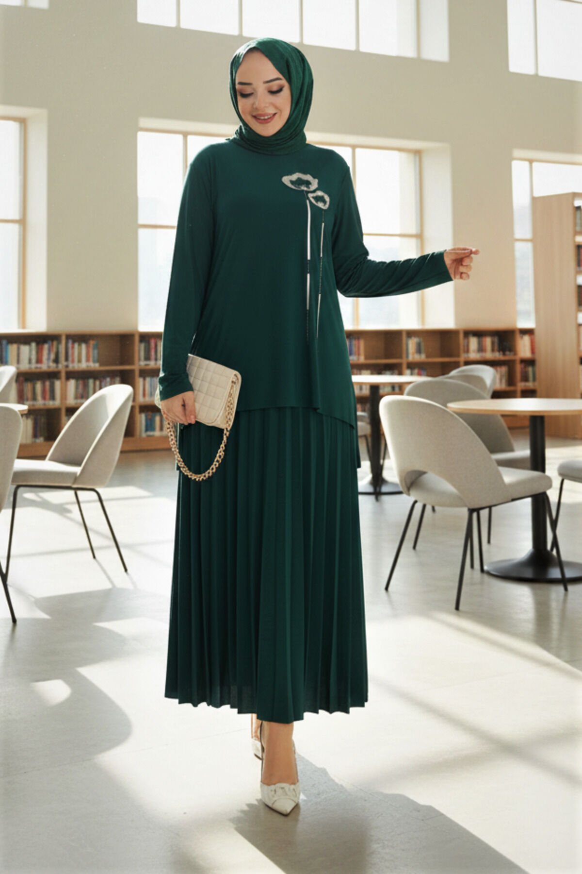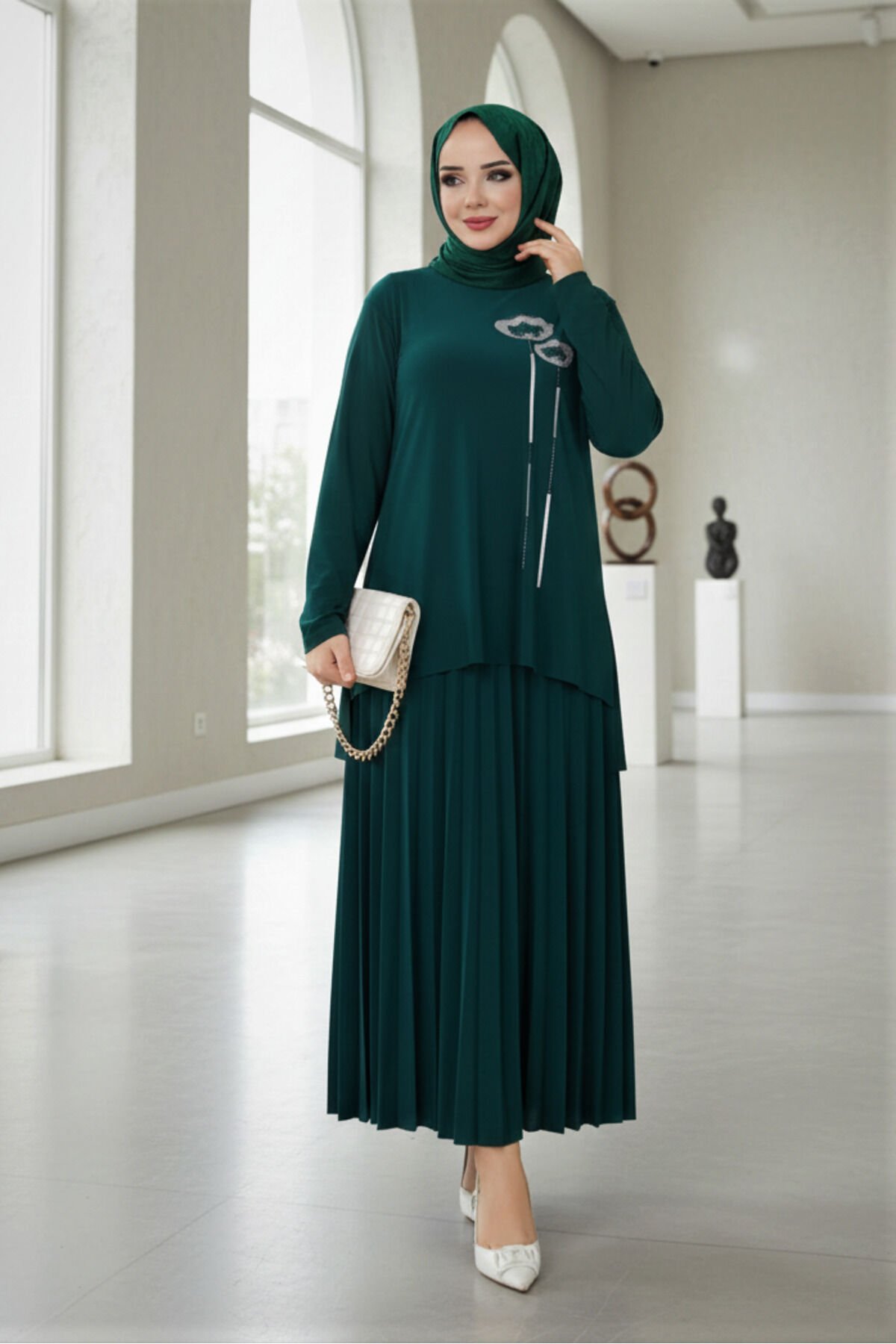 Kadın Sandy Siyah tarz özel davet anne Büyük Beden Piliseli İkili Tesettür Etekli Takım Zümrüt - 46