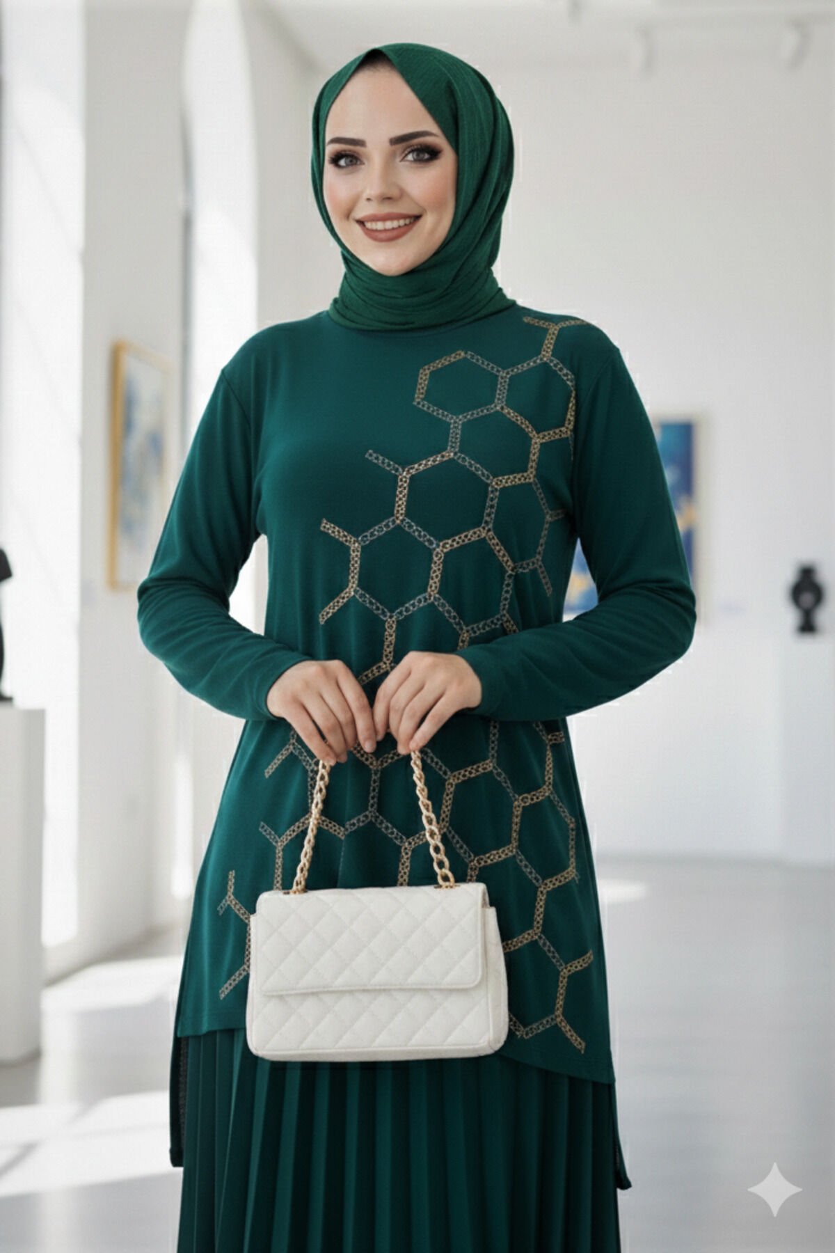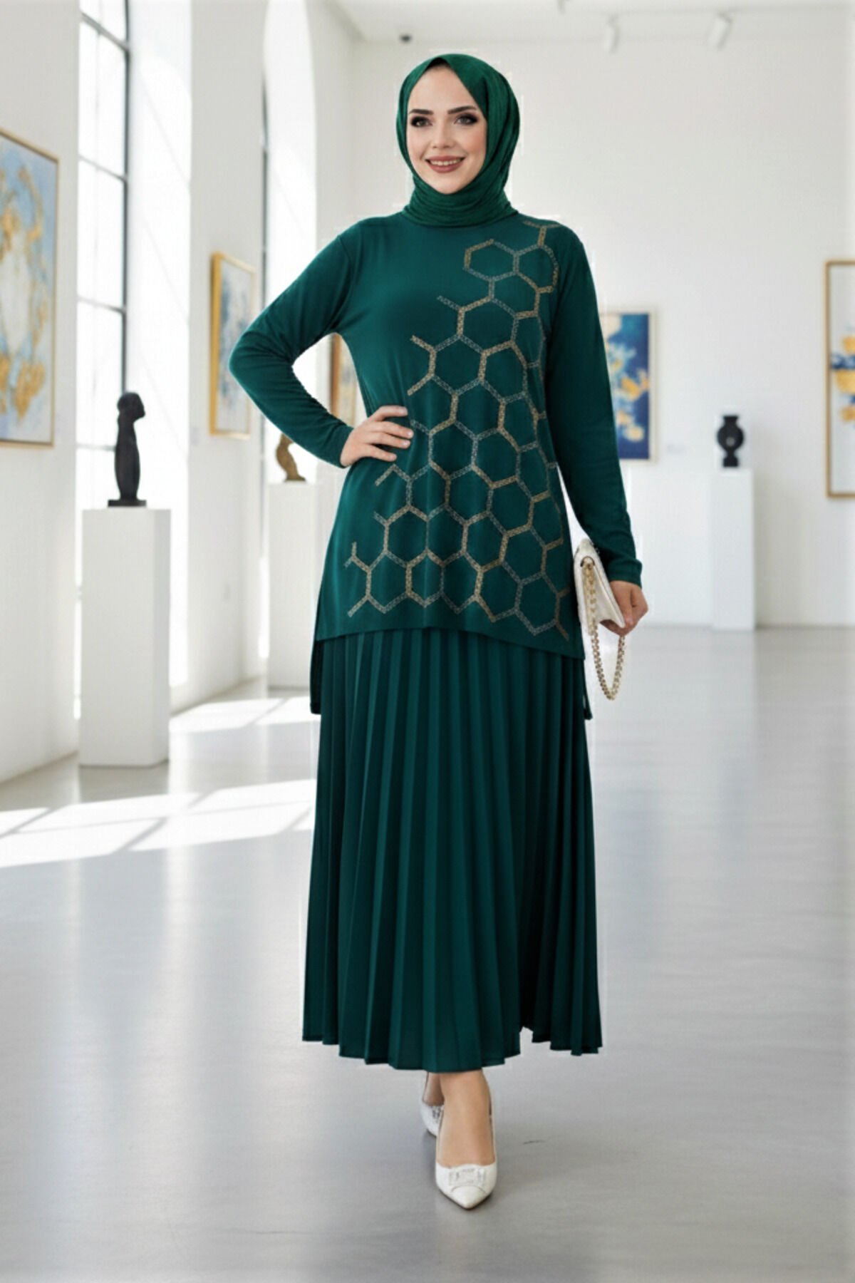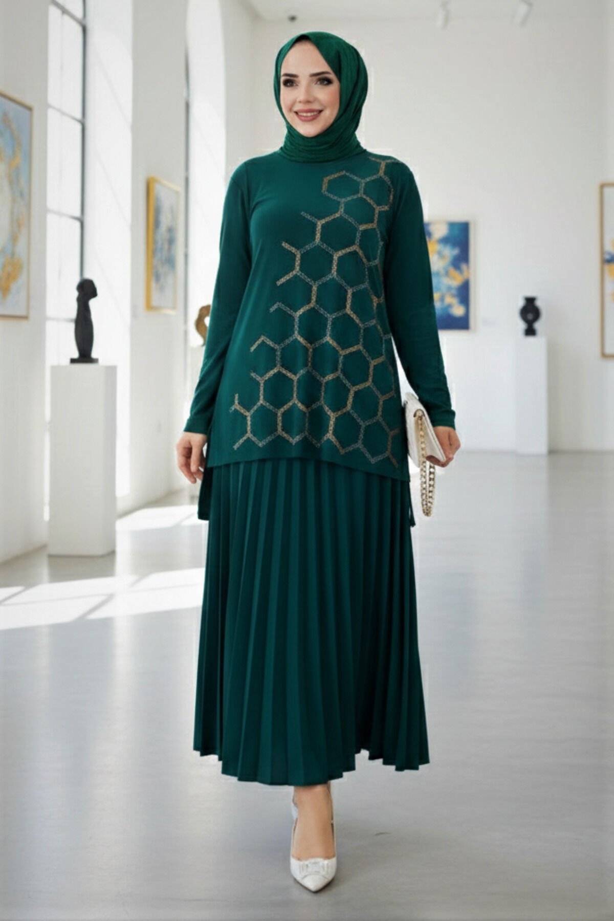 Kadın Sandy Zümrüt Yeşil Tarz Özel Davet Bluz Taş Detaylı Eteği Piliseli Ikili Tesettür Etekli Takım Zümrüt - 48